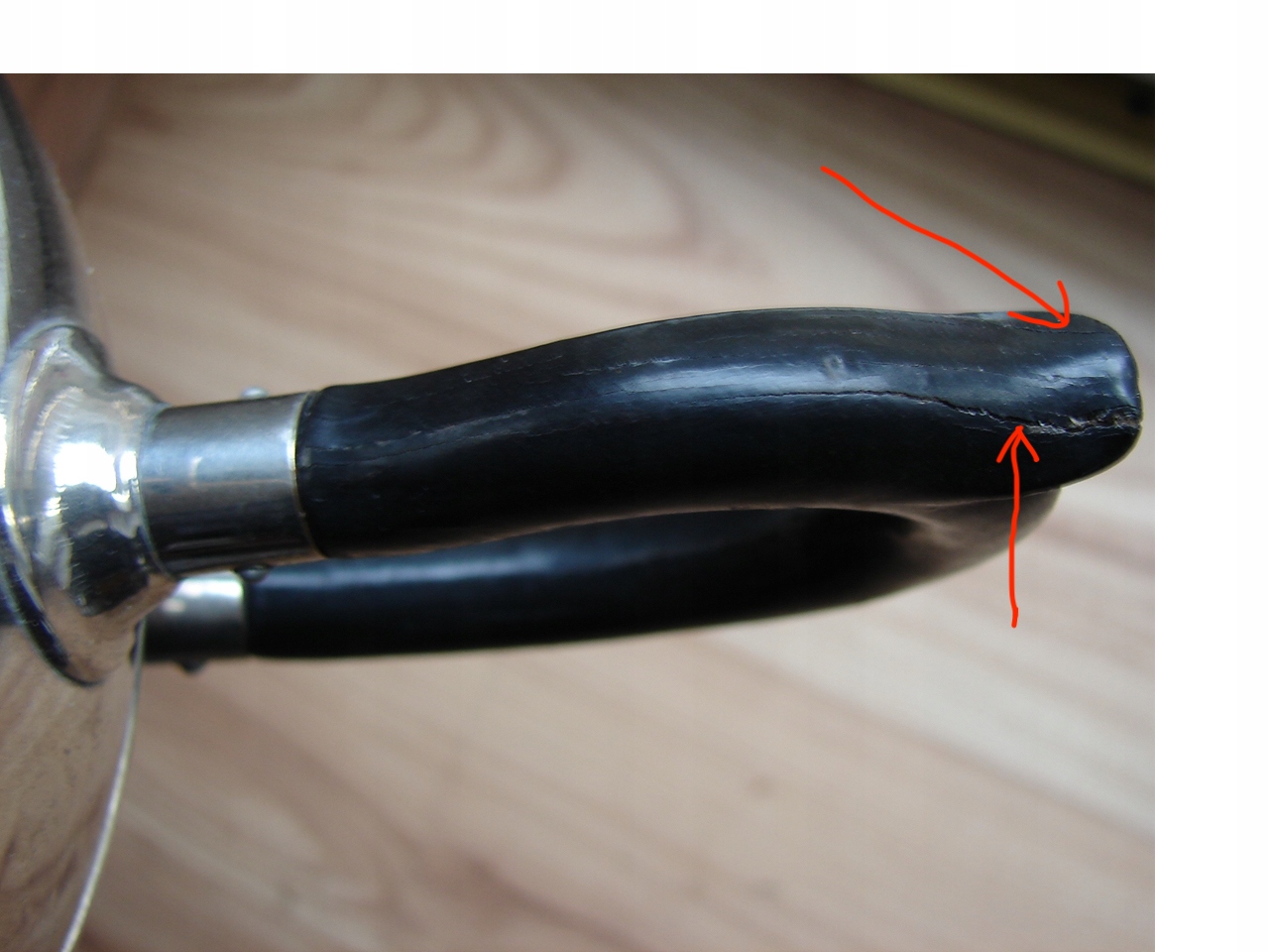 Техніка підходить тільки для декору, тому що всередині є іржа. На поверхні є локальні зміни кольору та подряпини. Ручка має тріщини, які показано червоними стрілками.