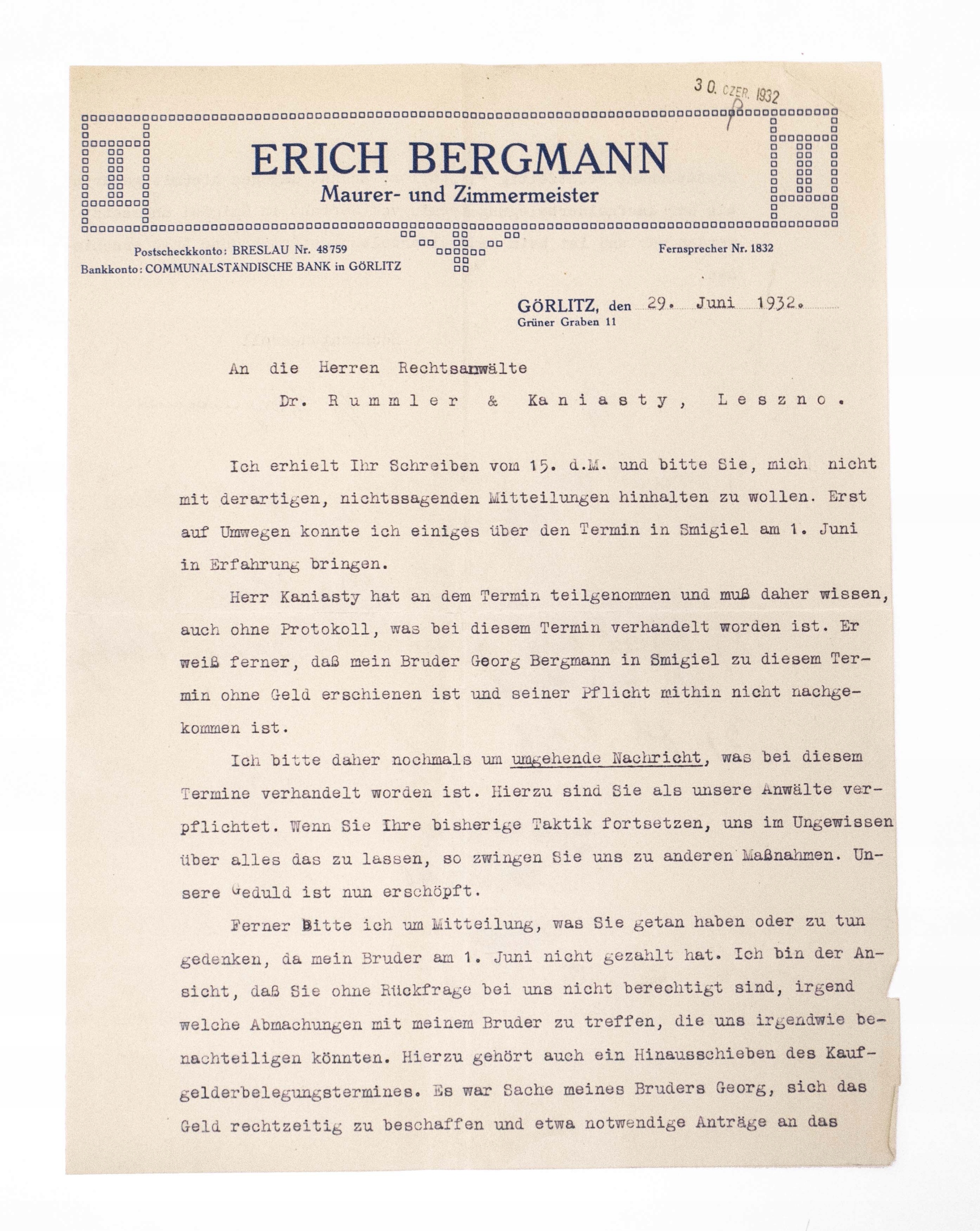 СТАРИЙ НІМЕЦЬКИЙ ПИС - Муляр і столяр БЕРГМАНН, ЗГОЖЕЛЕЦЬ / ЛЕШНО 1932 р.