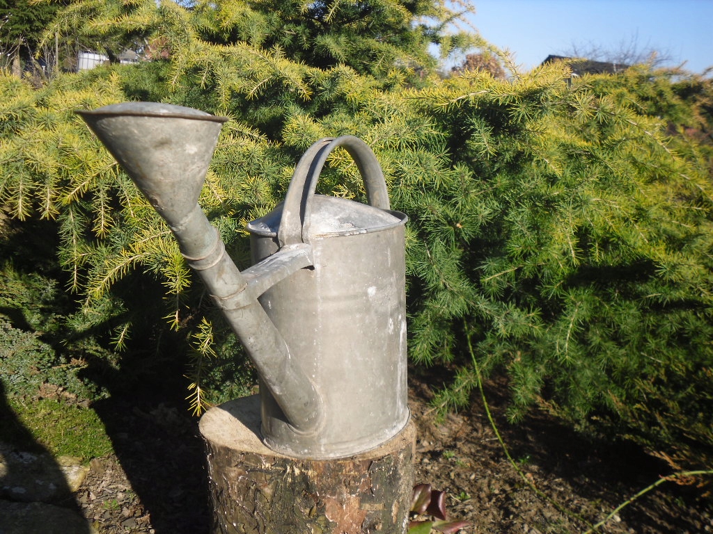 Старий оцинкований полив з воронковим садом прикраси, що проживають місця проживання 2