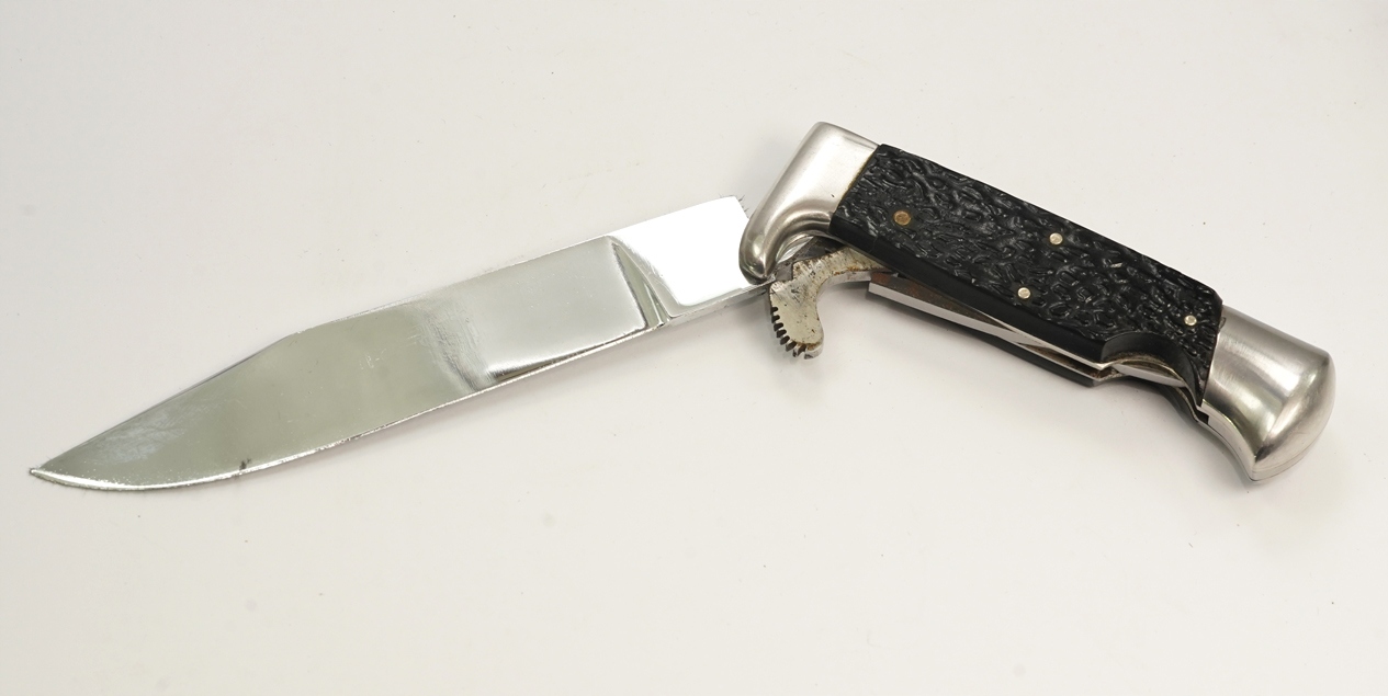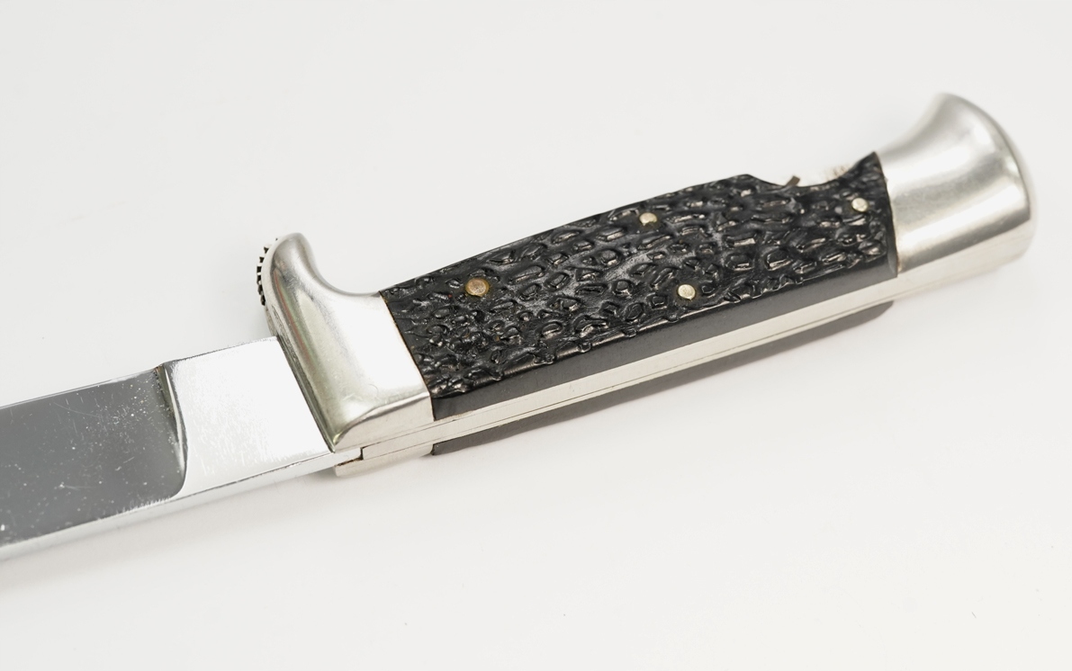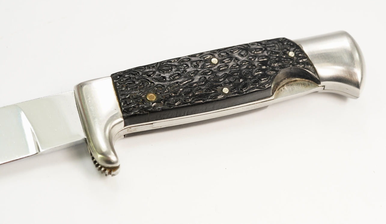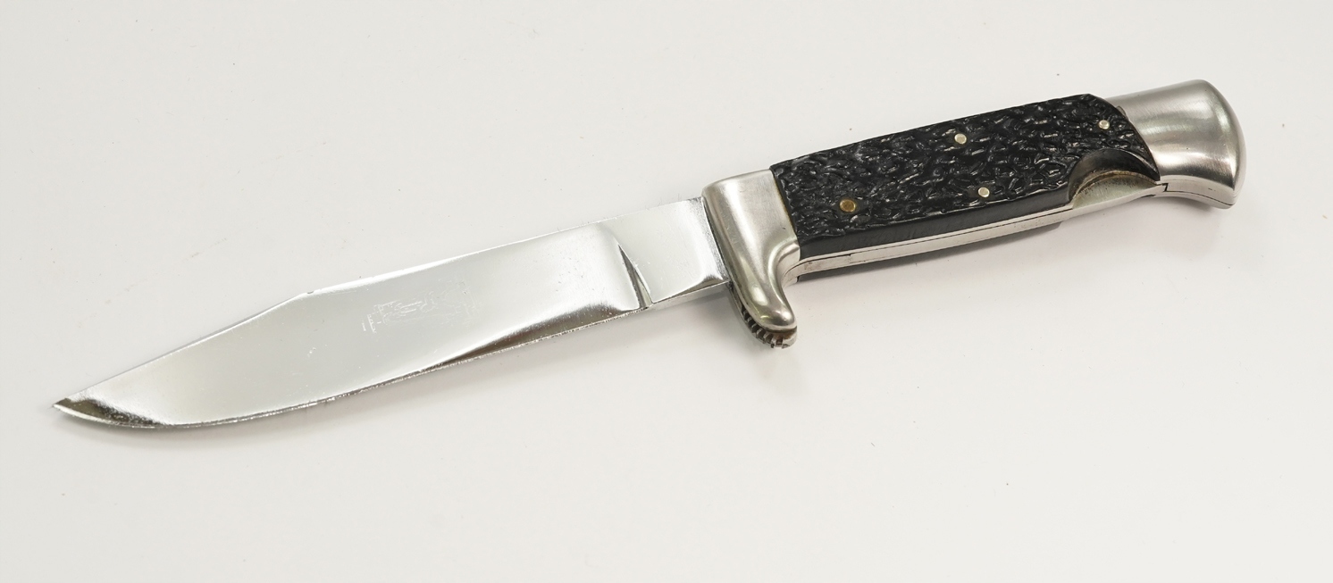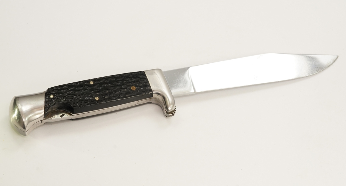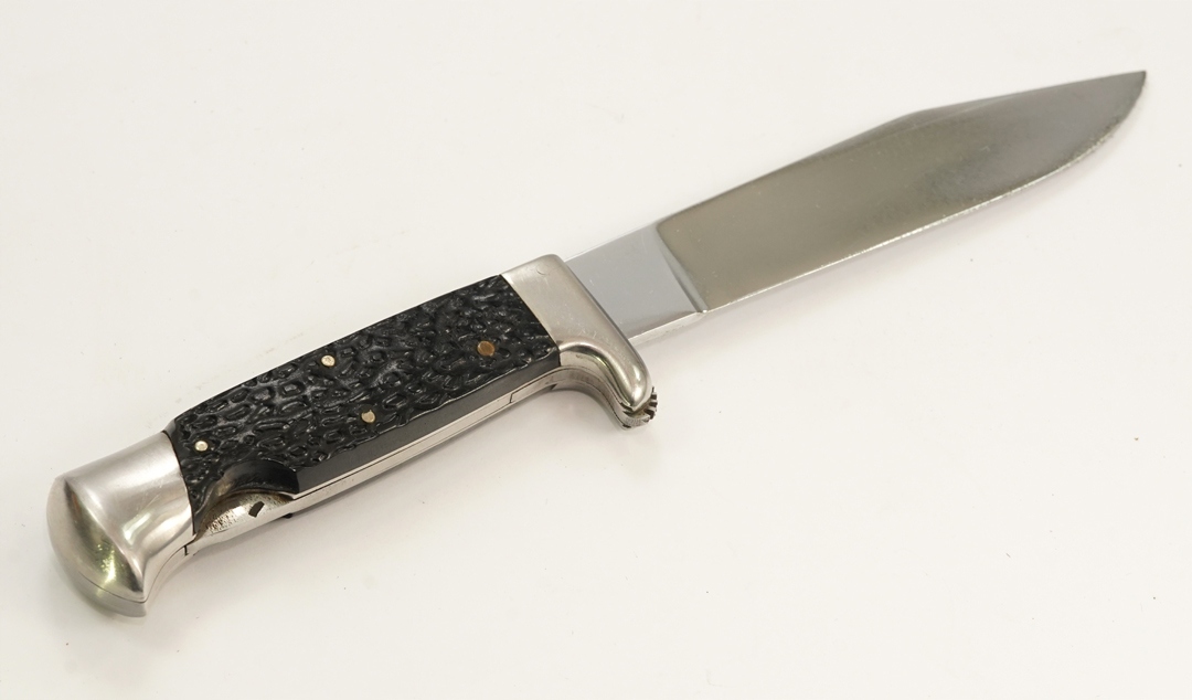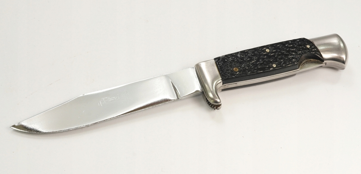 оригінальний надзвичайно приємний старий старий мисливський ніж, підписаний на лезі, сталеве лезо, сталеве нікель, сталева ручка з декоративними кришками бакеліту; Шкіряна піхва з листовою кишеню, розмір: довжина 24 см, довжина леза 13,5 см; Нож має механізм видалення та заміни леза; Дуже хороший стан-цілий стабільний без будь-якої слабкої, піхву без пошкоджень, кінець леза злегка заплямований, надзвичайно приємний цікавий мисливський ніж. Рекомендую, оригінальний рідкісний предмет за доступною ціною. Надзвичайно цікавий рідкісний оригінальний об’єкт. Умова ідеально видно на знімках на описі аукціону.