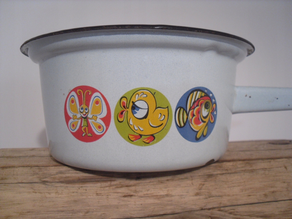 Ласкаво просимо на мій аукціон. На аукціонах я зазвичай пропоную вам предмети з періоду PRL. На цьому аукціоні я пропоную оригінальну стару емальовану та красиву ситечко друшляка з однією ручкою, нанесеною барвистими зображеннями з обох боків. Ситечко з цікавою формою в білому або дуже світло -синьому кольорі з чорним краєм. Через свій вік у нього є кілька менших аварійних чіпсів, знебарвлення. Для свого віку він вижив у справді хорошому стані. Durszlak очистили, а не змащували. Прекрасна прикраса нашого середовища проживання. /див. Фотографії /. P>