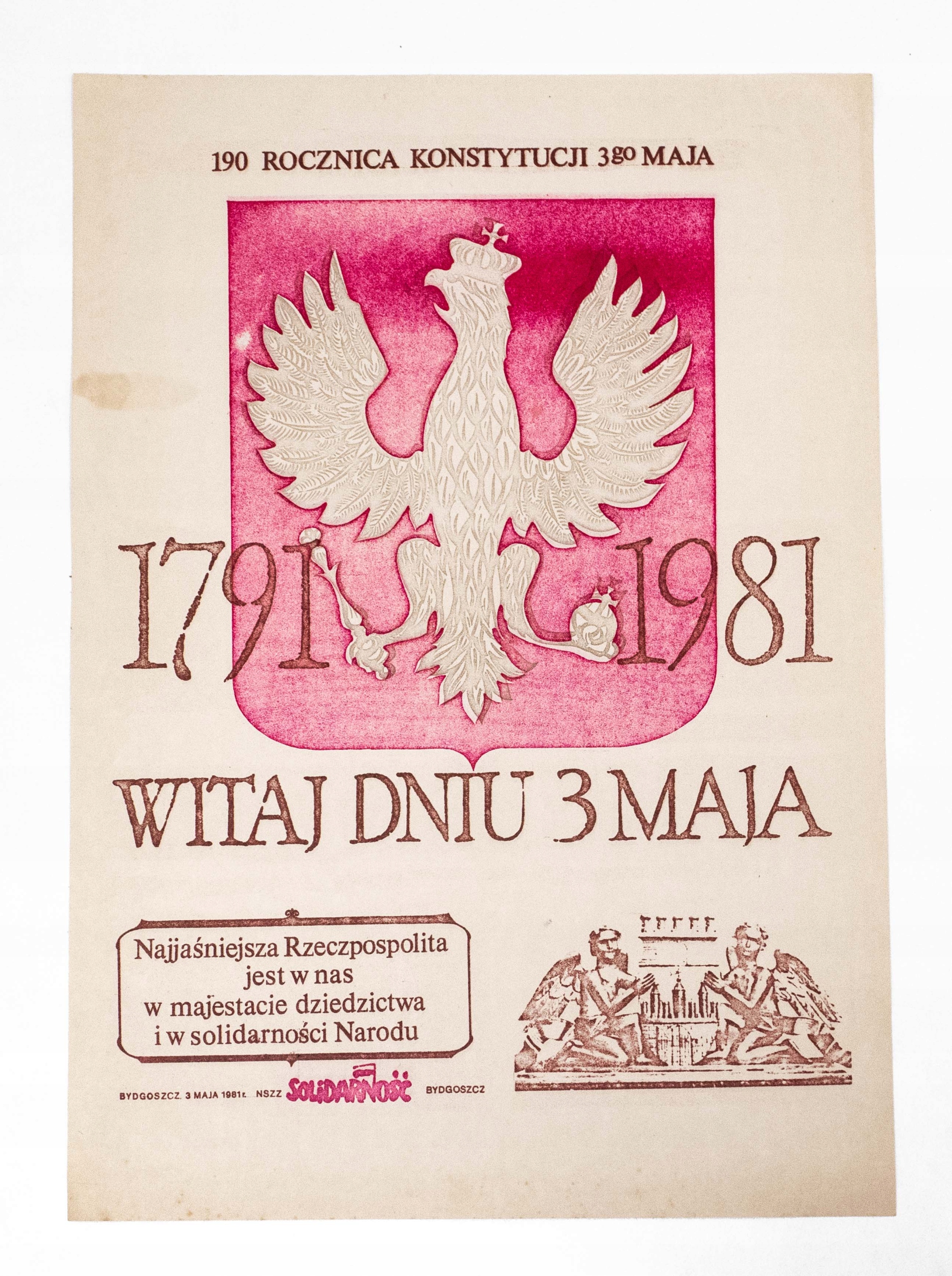 СТАРИЙ ПЛАКАТ СОЛІДАРНОСТІ, 190 РІЧНИЦЯ КОНСТИТУЦІЇ 3 ТРАВНЯ, БИДГОЩ 1981 РОКУ