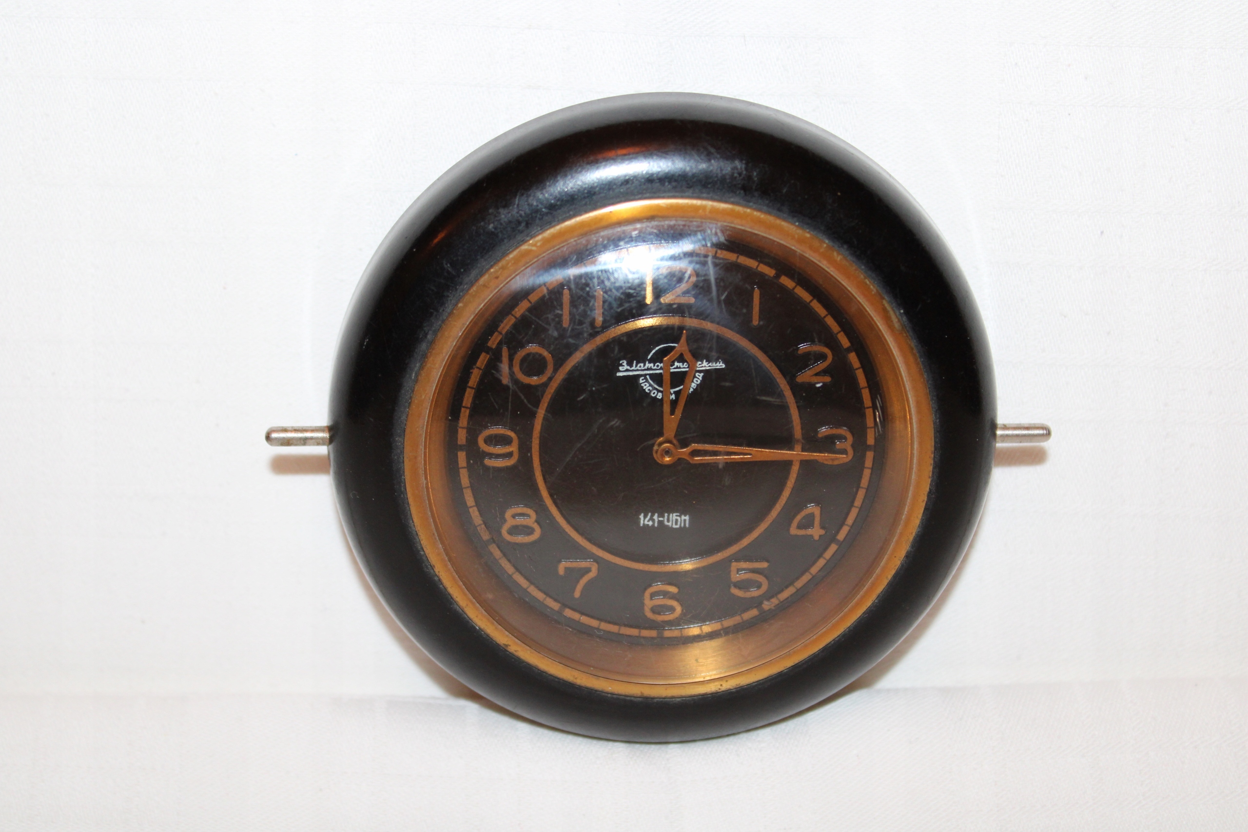 Старий радянський годинник в робочому стані, бакелітовий корпус, латунний корпус і опукле скло, діаметр годинника 10 см.