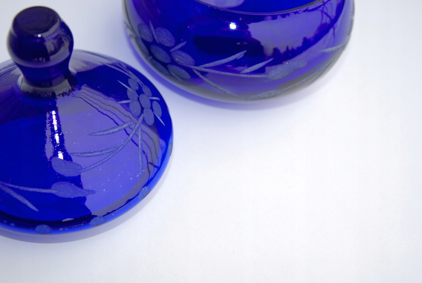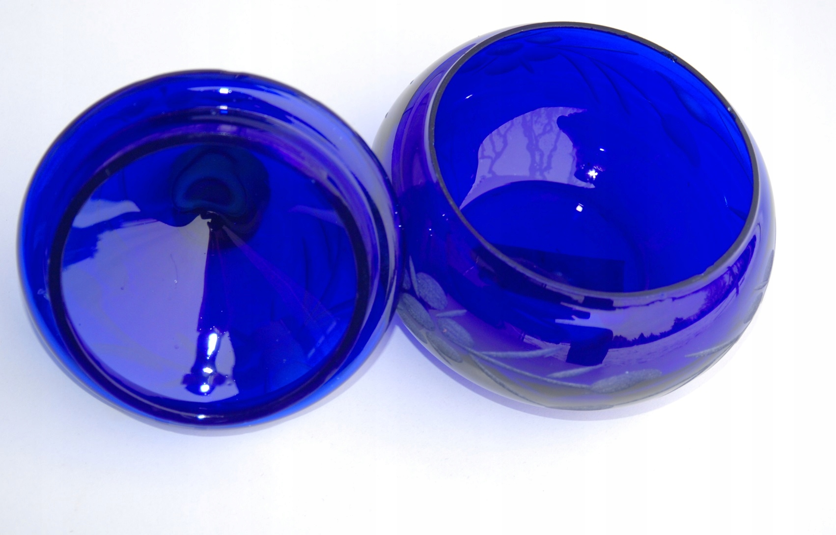 Старенька скляна шоколадна коробка темно-синього кольору, з ручним гравіюванням, антикваріат, предмет колекціонування Польської Народної Республіки