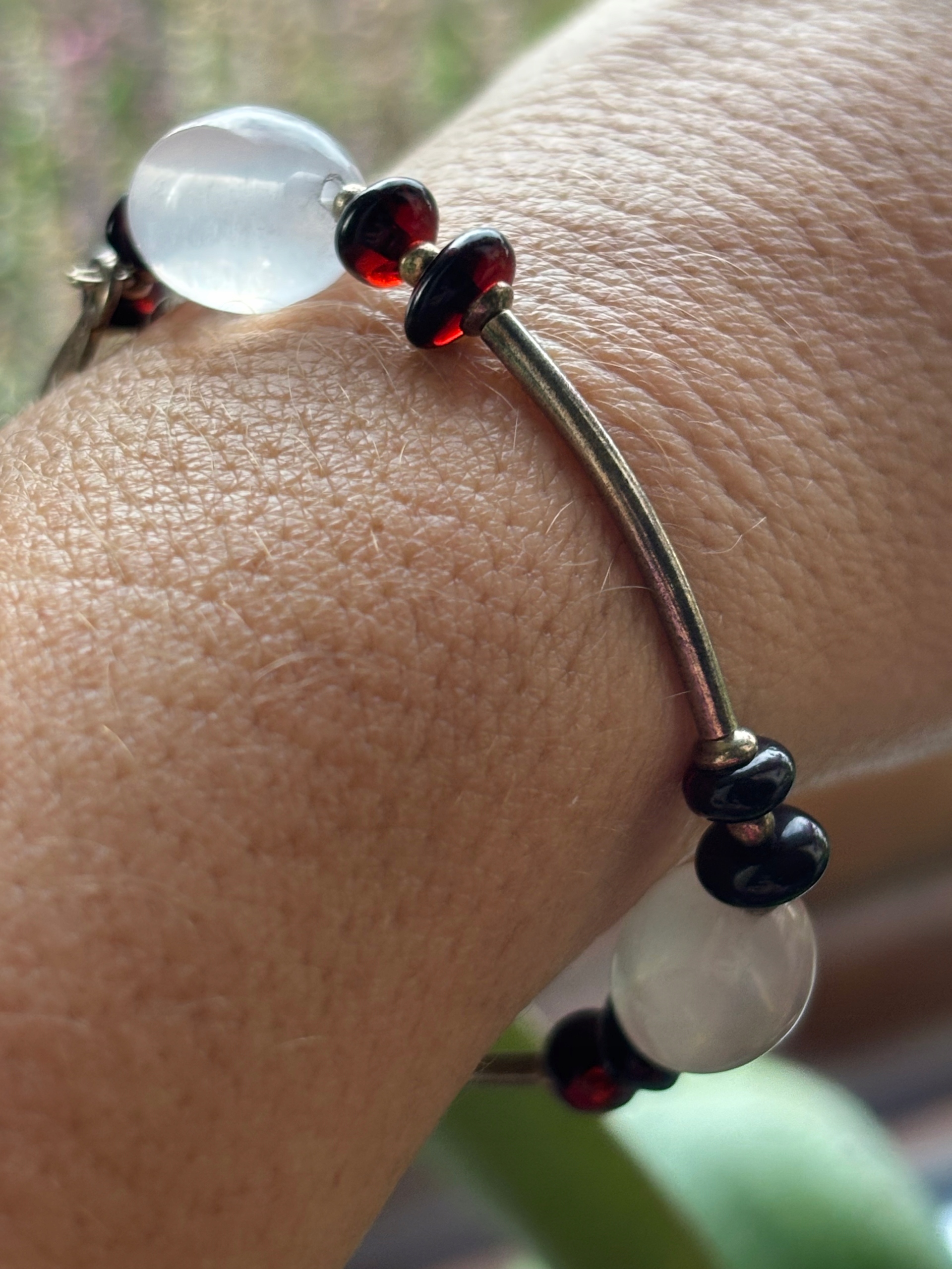Старий срібний браслет, цікавий візерунок, білий камінь, натуральний гранат