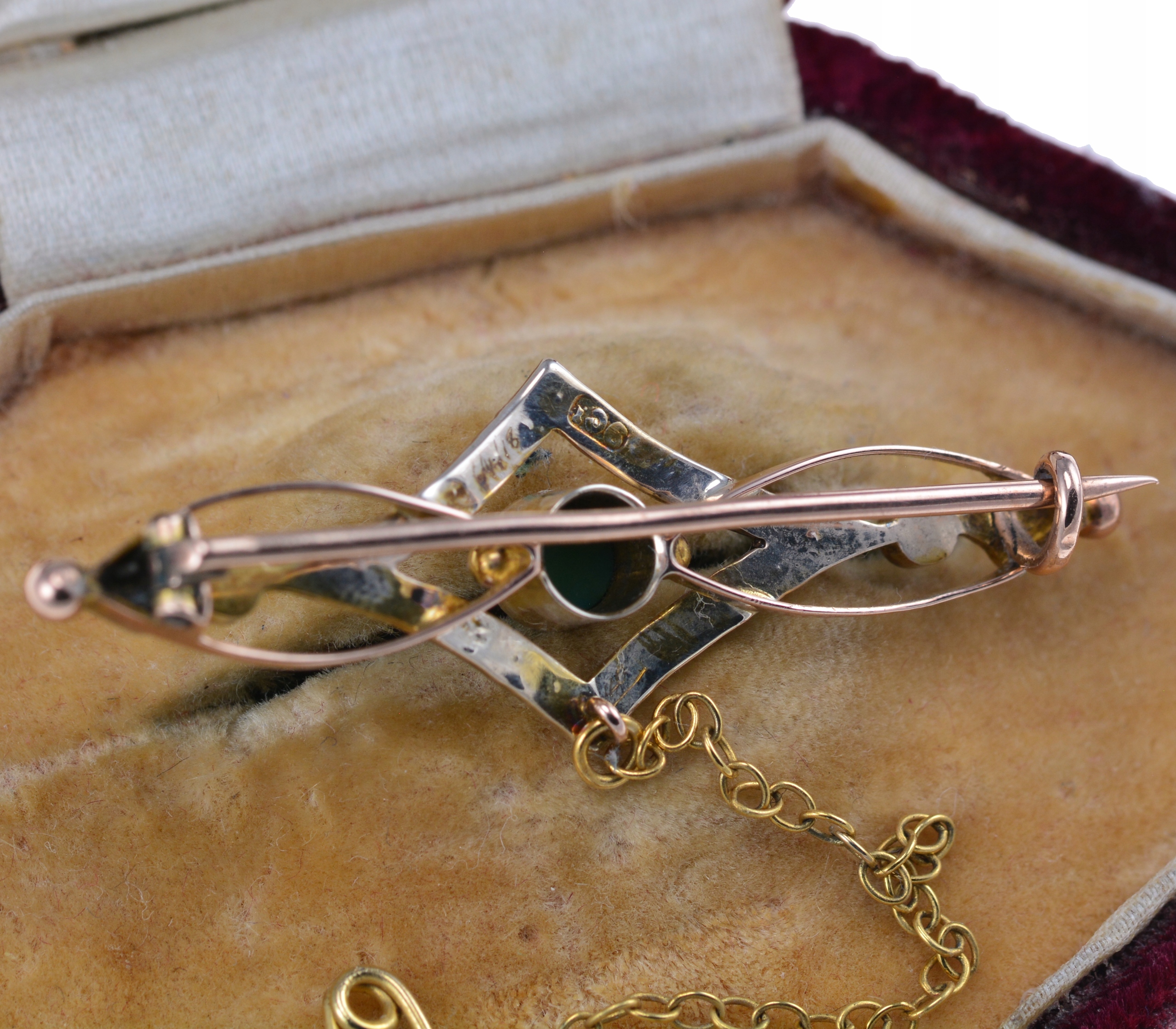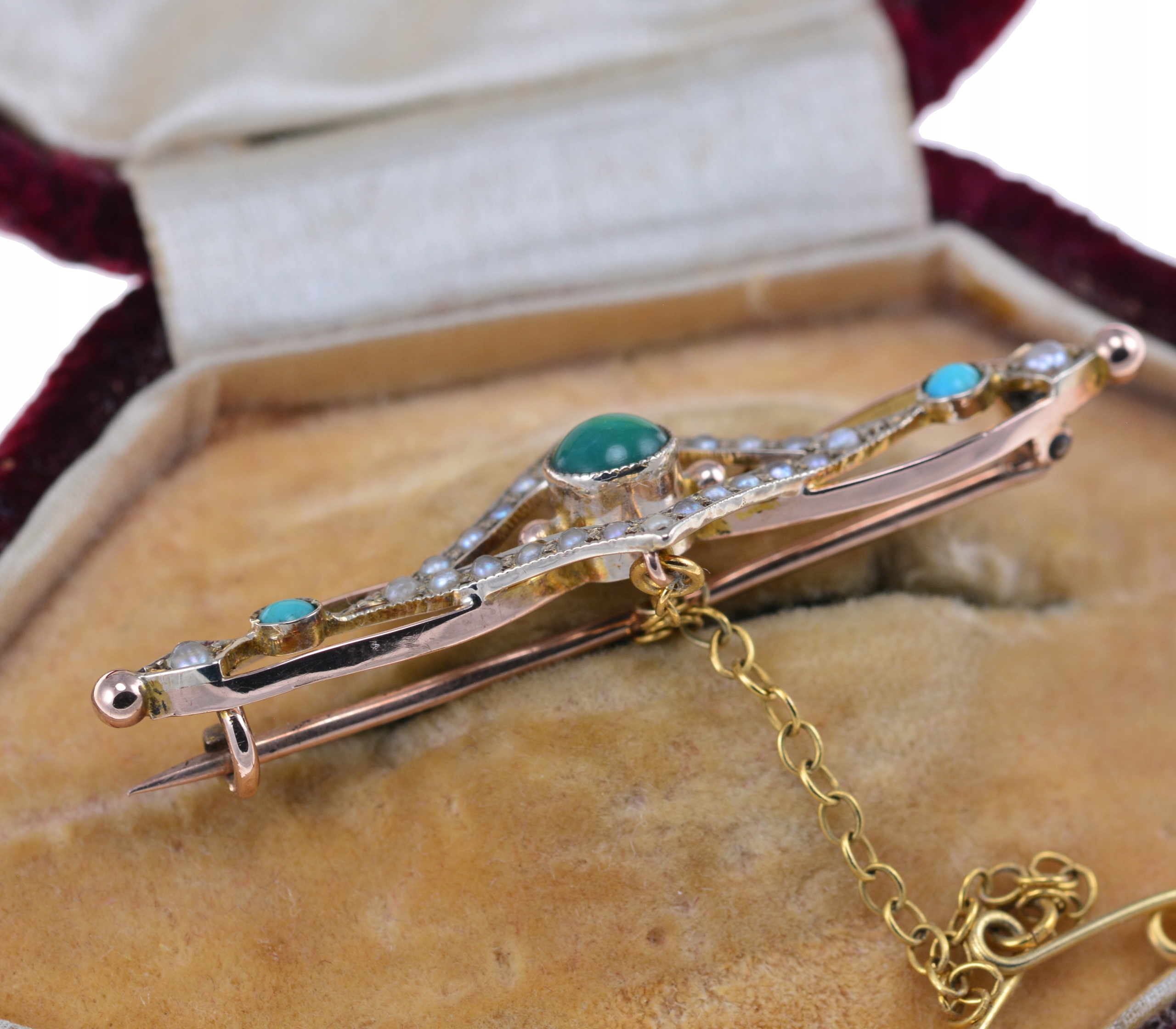 Предмет продажу старовинна англійська брошка прикрашений натуральною бірюзою та річковими перлами. Брошка була створена в Англії на початку 20 століття. Дата карбування 04.06.1918. Дуже хороший стан, оригінальні камені, робоча застібка.