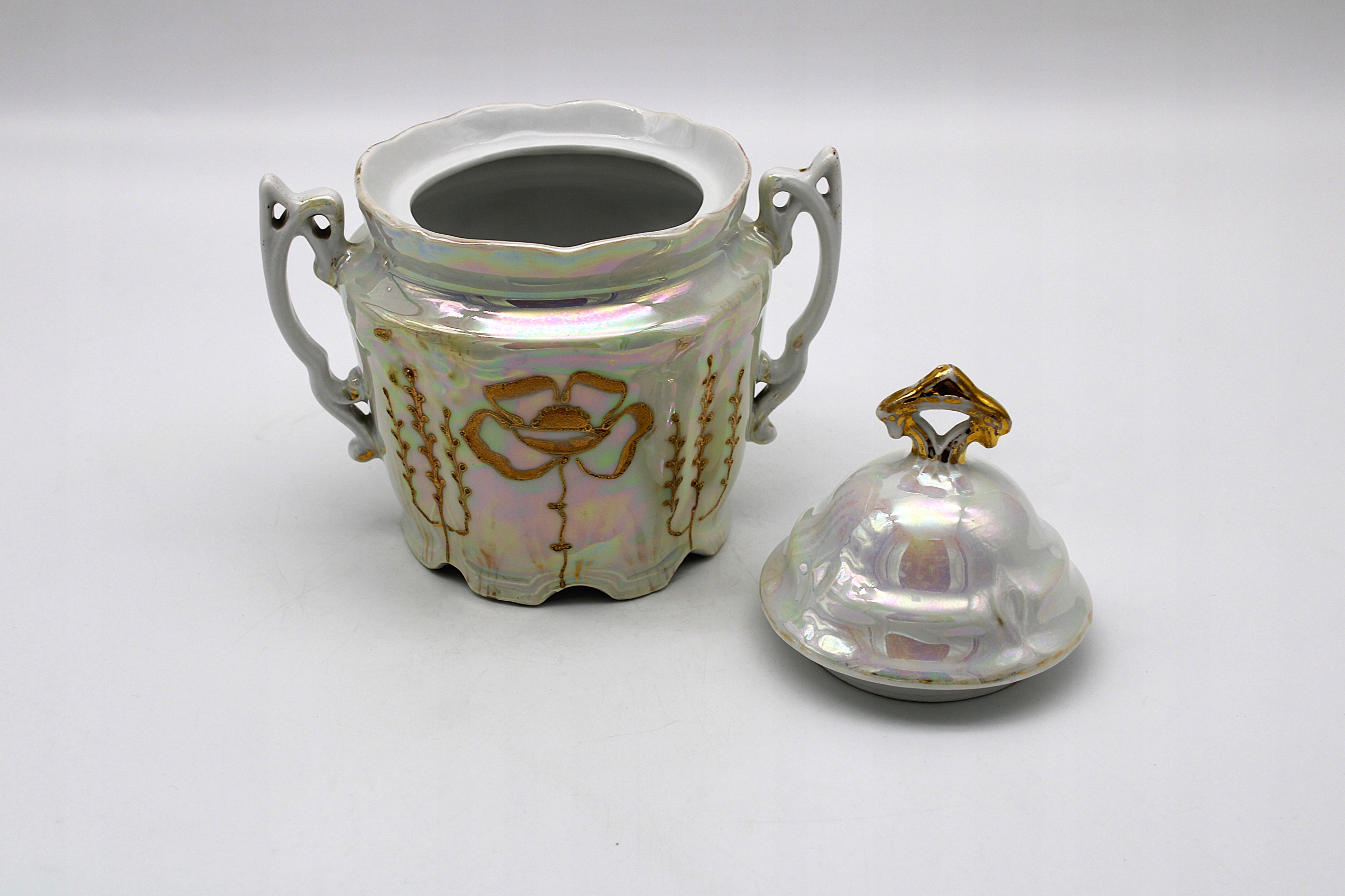 Я рекомендую стару антикварну цукрову миску з порцелянової фабрики в Конігссельті - jaworzyna śląska stary silenesia - все, що відбулася між 1914 - 1919 **, таких як сканування сканування для сканування понад 100 років, має лише природну тимчасову посіву в позолоченій та природній малі. Позолочення та 100 % оригінальний декор