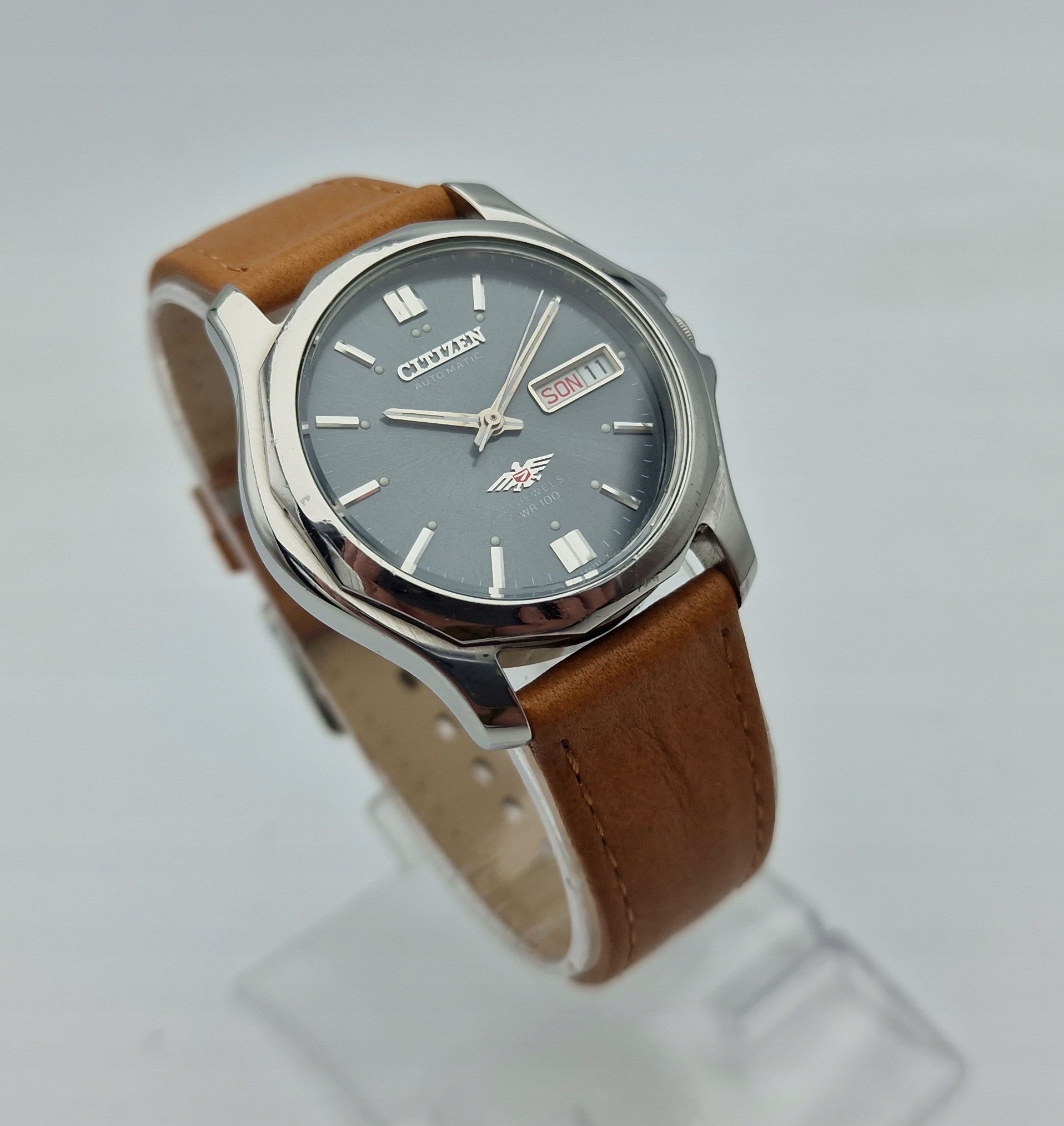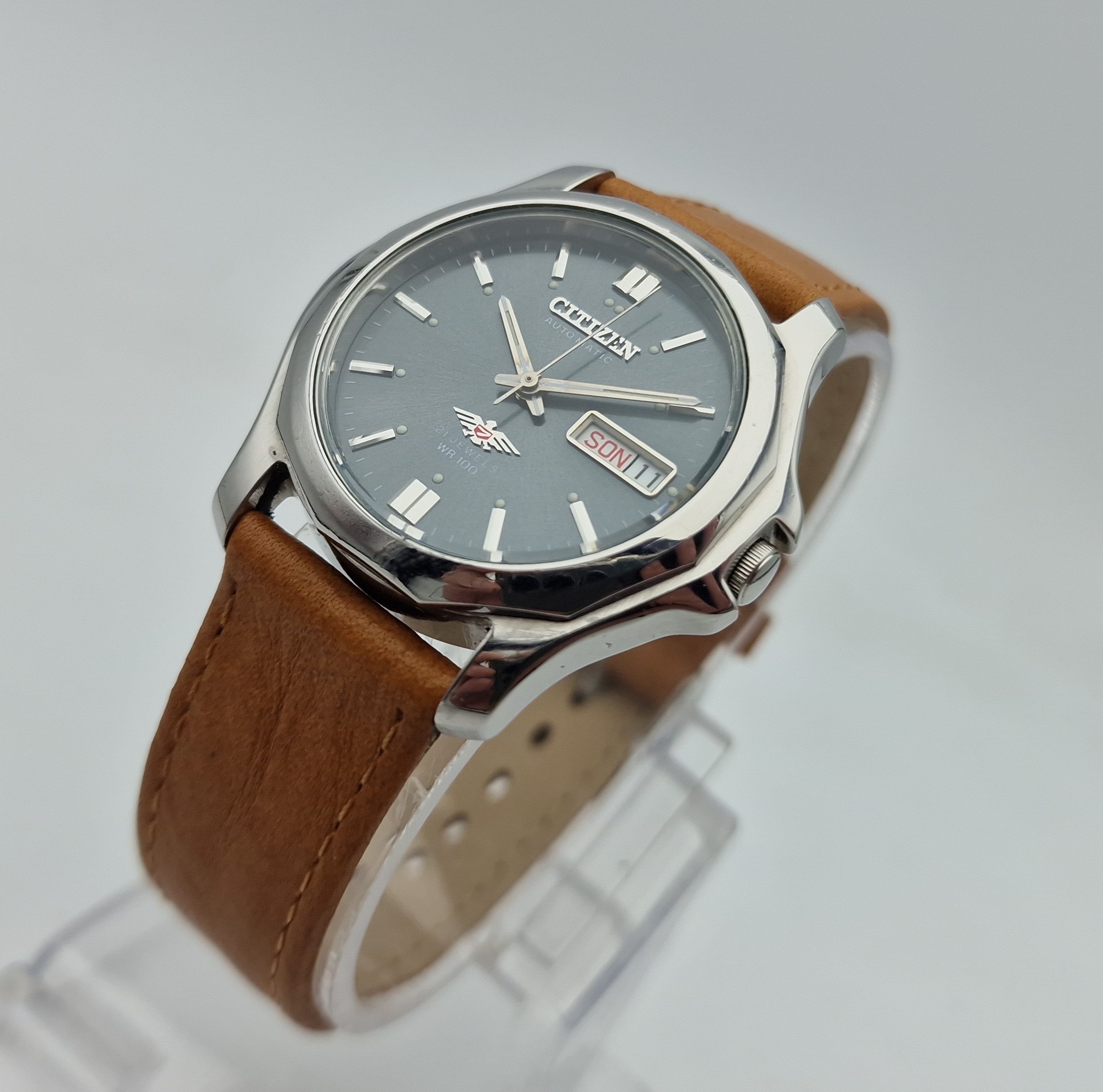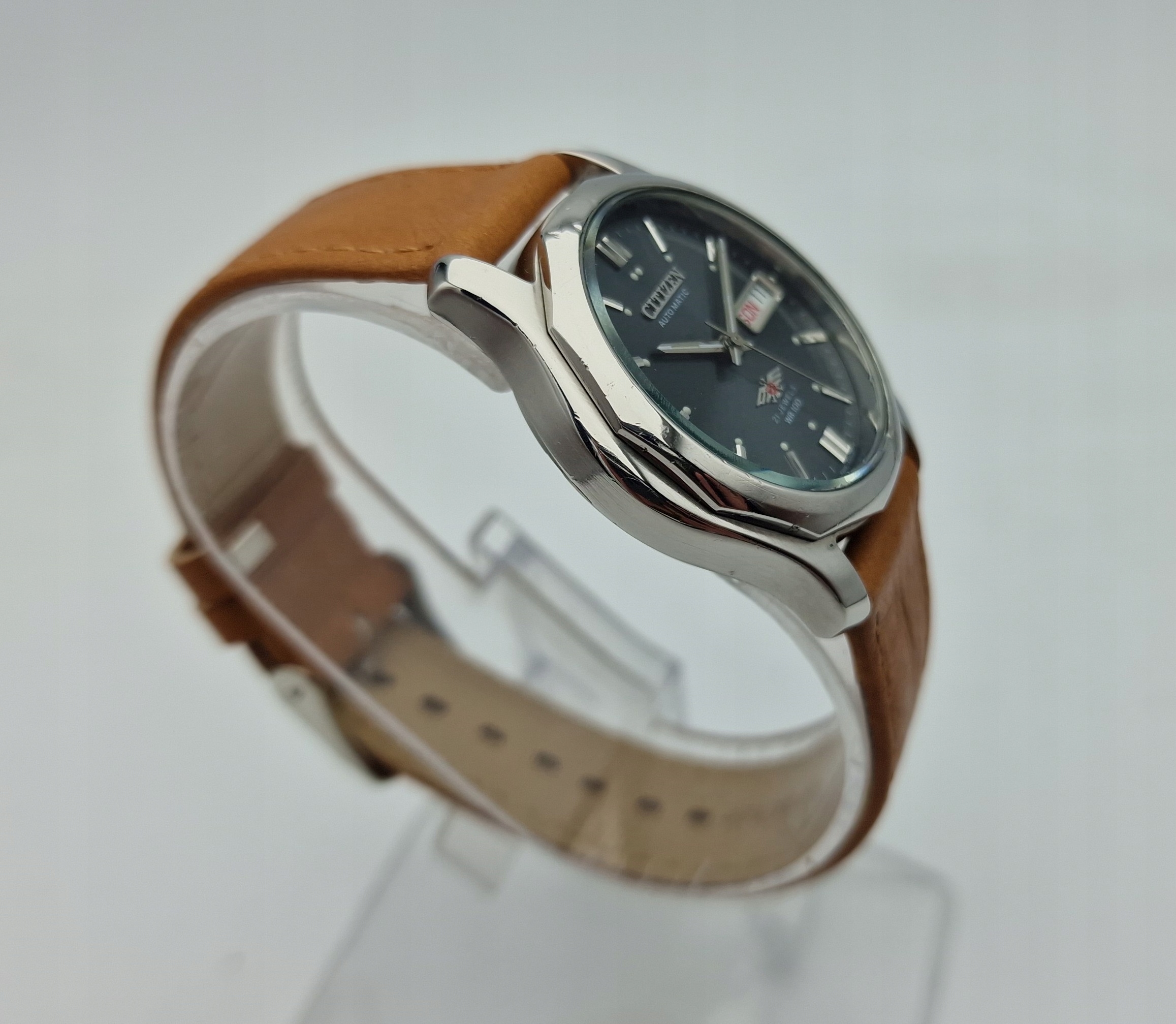 - Сріблястий металевий циферблат із відображенням дати на третій годині. Оригінальний циферблат із підписом: «CITIZEN, AUTOMATIC, 21 JEWELS, WR100, JAPAN». Циферблат в ідеальному стані, як на фото.