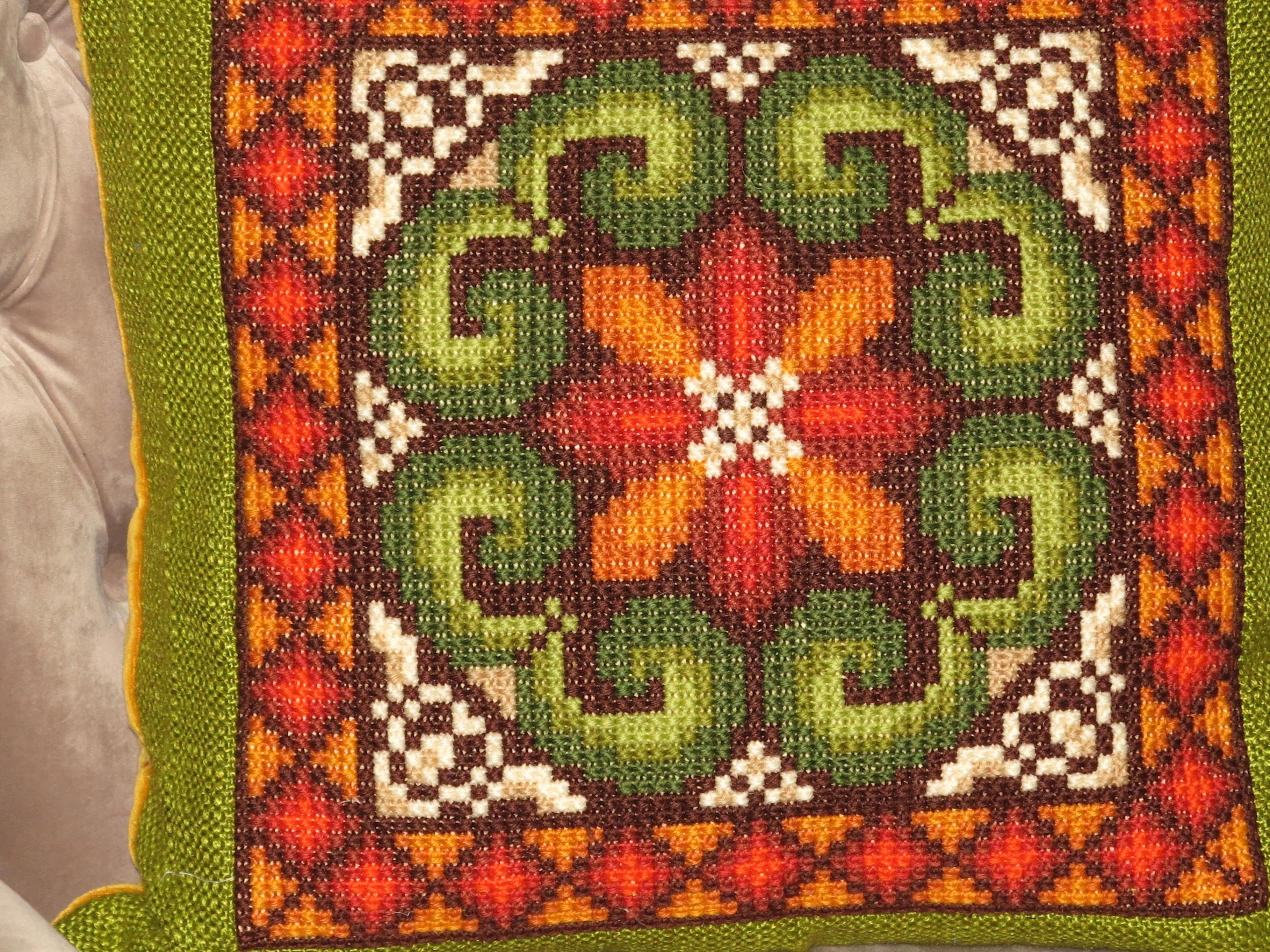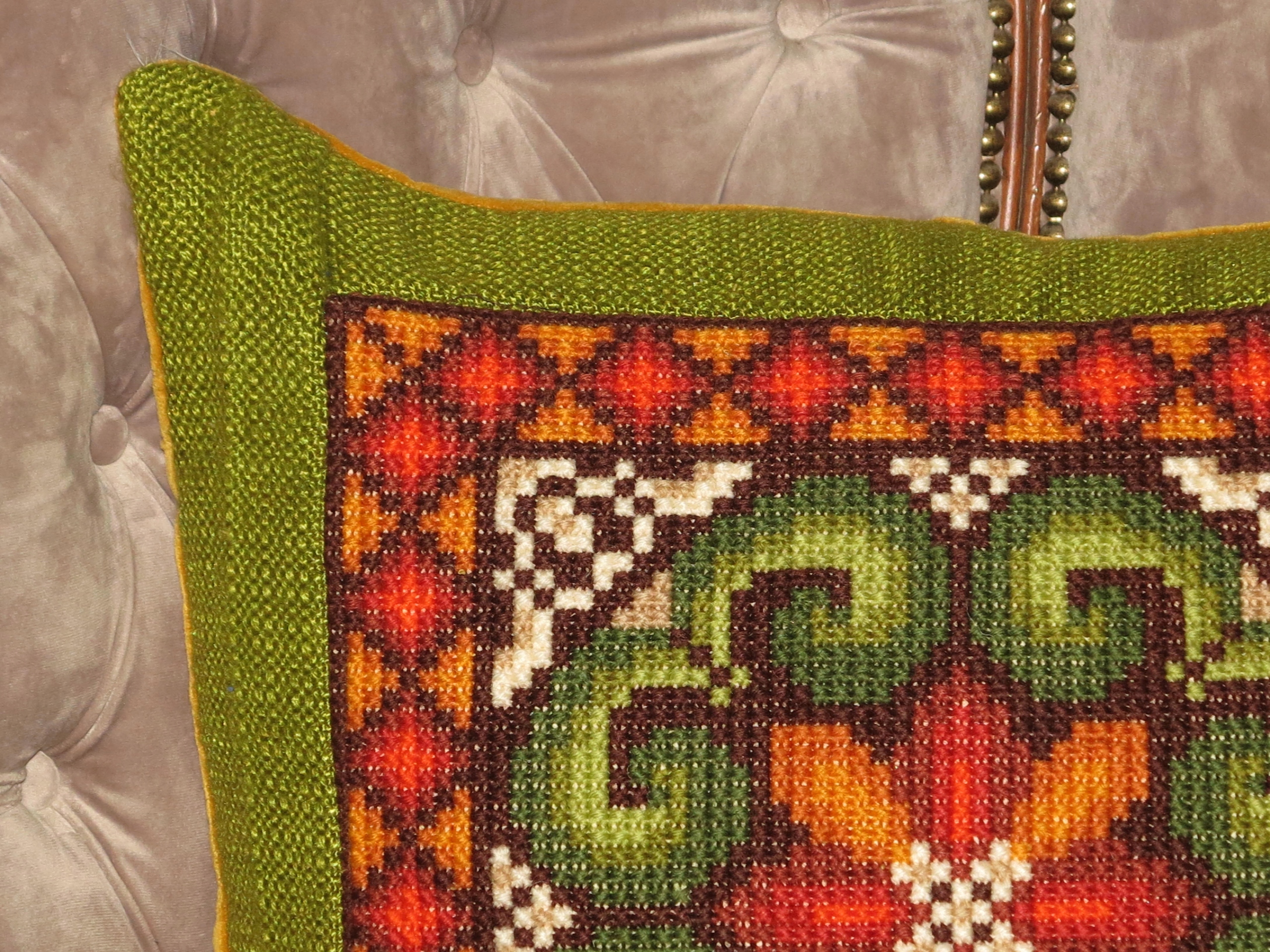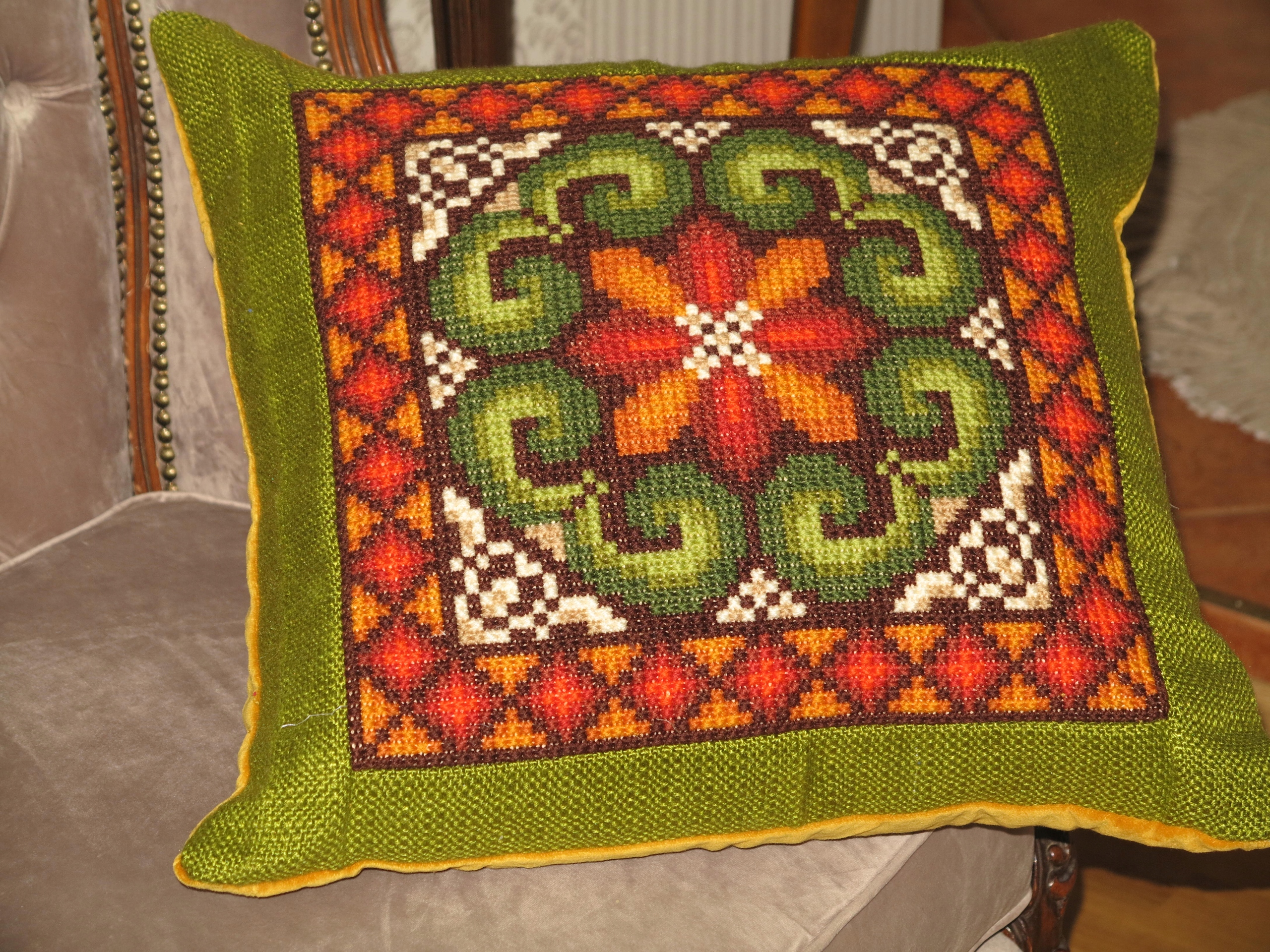 ВИНЯТКОВО ГАРНУ ТА ДУЖЕ ДЕКОРАТИВНУ ВЕЛИКУ СТАРОВИННУ СТИЛЬНУ ПОДУШКУ З НАПОВНЮВАЧОМ, СПЕРЕДУ З ТУСТНОЮ ВИШИВКОЮ РУЧНИМ ХРЕСТИКОМ, ВИШИТА ВЕРСТЯНОЮ НИТКОЮ. СПИНКА ИЗ БАВОВНИ ОКСАМИТ