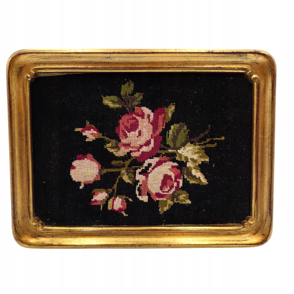 СТАРОВИННА РУЧНА ВИШИВКА - ТЕМА ТРОЯНД В РАМЦІ ЗОЛОТОГО КОЛЬОРУ 20х15 см