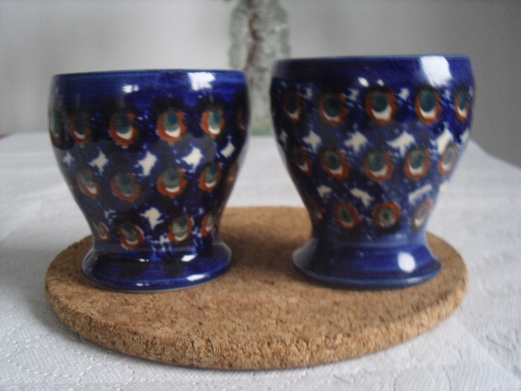 Ласкаво просимо на мій аукціон. На аукціонах я зазвичай пропоную вам речі часів Польської Народної Республіки. На цьому аукціоні пропоную ОРИГІНАЛЬНІ старовинні керамічні кухлі цікавої форми, ніби стоять на ніжці, малюнок павиного ока нагадує Болеславець, але без підпису, глазуровані. Чашки цілі, помиті, прямо на полиці. На фото все видно. Ви купуєте 2 шт. /див. фото/