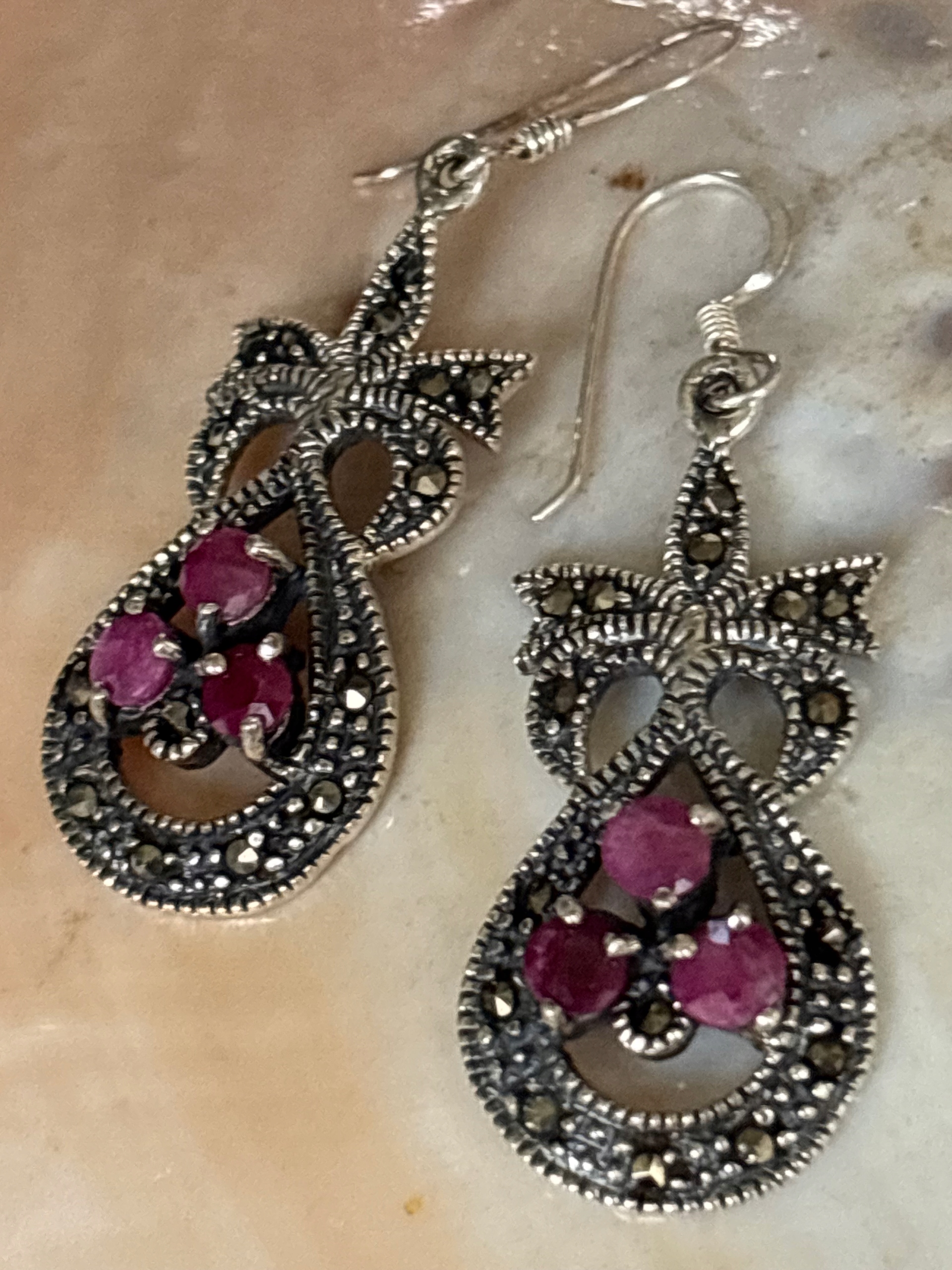 Старовинні срібні підвісні сережки з натуральними рубіновими марказитовими каменями