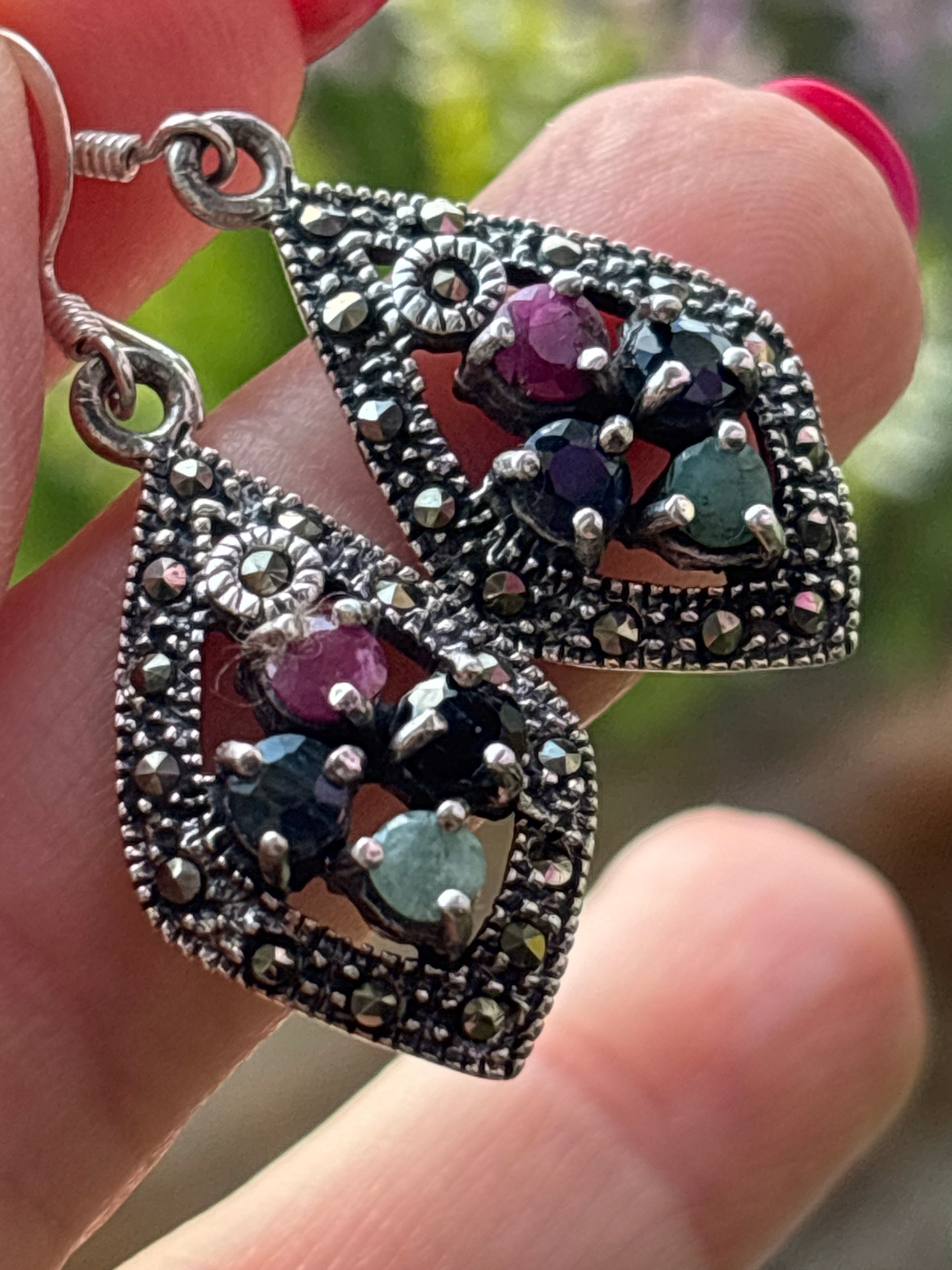 Старовинні срібні сережки, висячі натуральні камені, рубін, гранат, смарагд