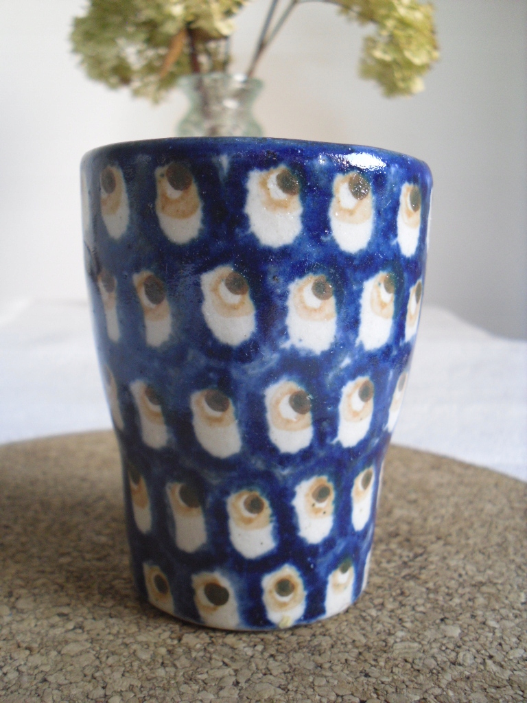 Ласкаво просимо на мій аукціон. На аукціонах я зазвичай пропоную вам речі періоду Польської Народної Республіки. На цьому аукціоні пропоную ОРИГІНАЛЬНУ старовинну керамічну кухоль, візерунок павиних очей нагадує Болеславець, але без підпису, глазурована. Кружка миється і ставиться прямо на полицю. На фото все видно. /див. фото/