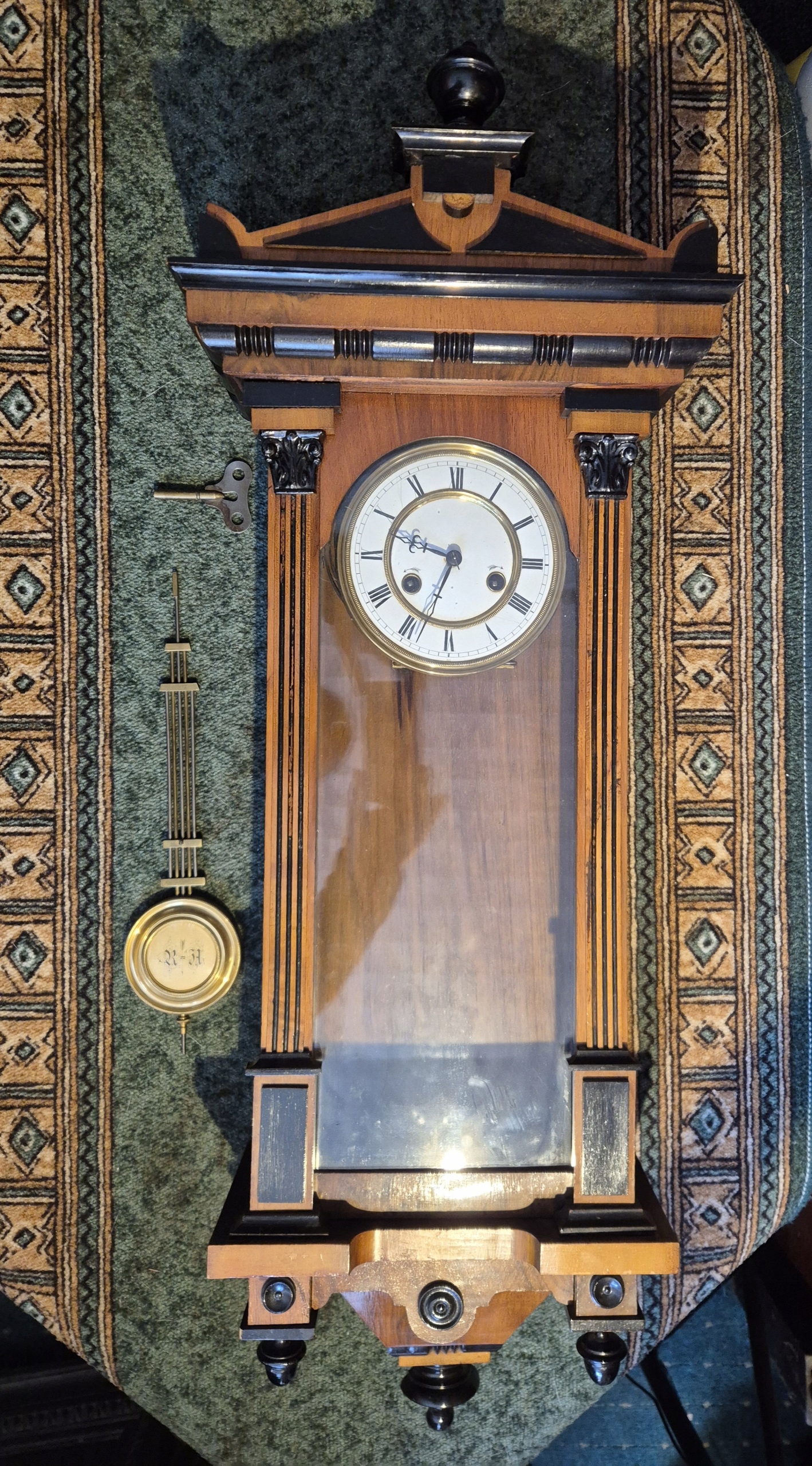 Висячий маленький шведський годинник (?). Хороший стан. Без короїдів. Годинник працює, ходить вже 10 днів. Дзвонить кожні півгодини і б'є цілу годину. Ключ в комплекті. Вага прибл. 2 кг. Висота макс. 85 см, ширина 33 см, РЕКОМЕНДУЮ. Перед транспортуванням з годинника знімуть маятник і заводну головку.