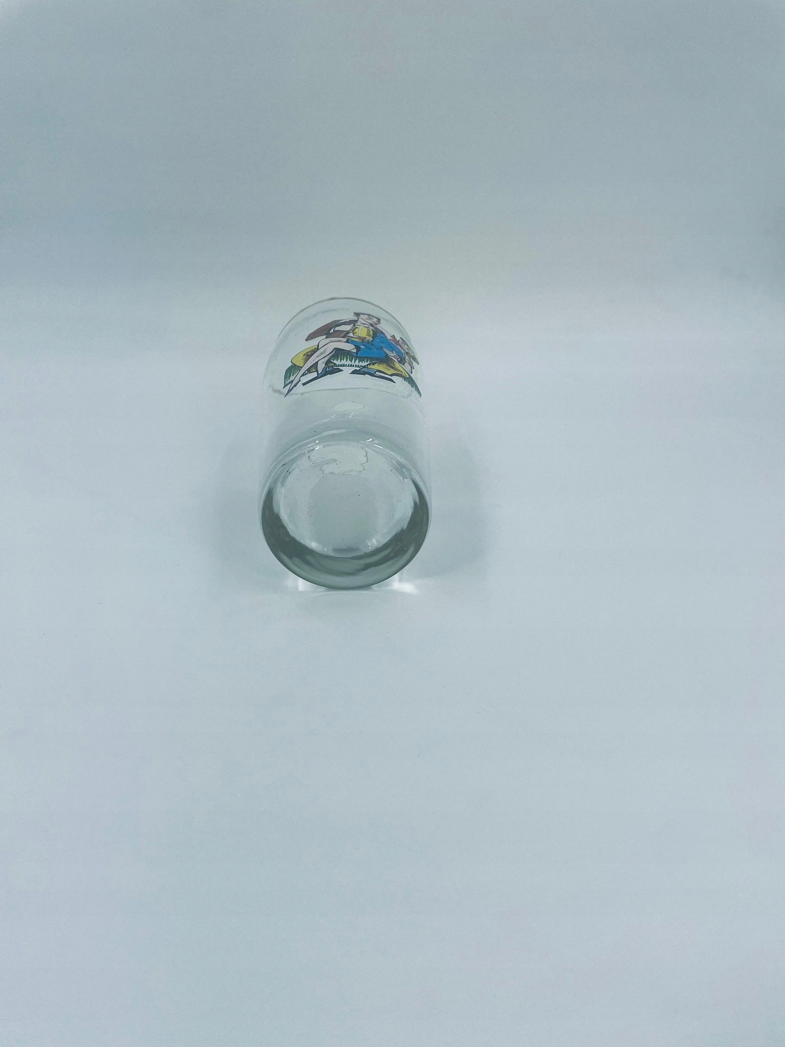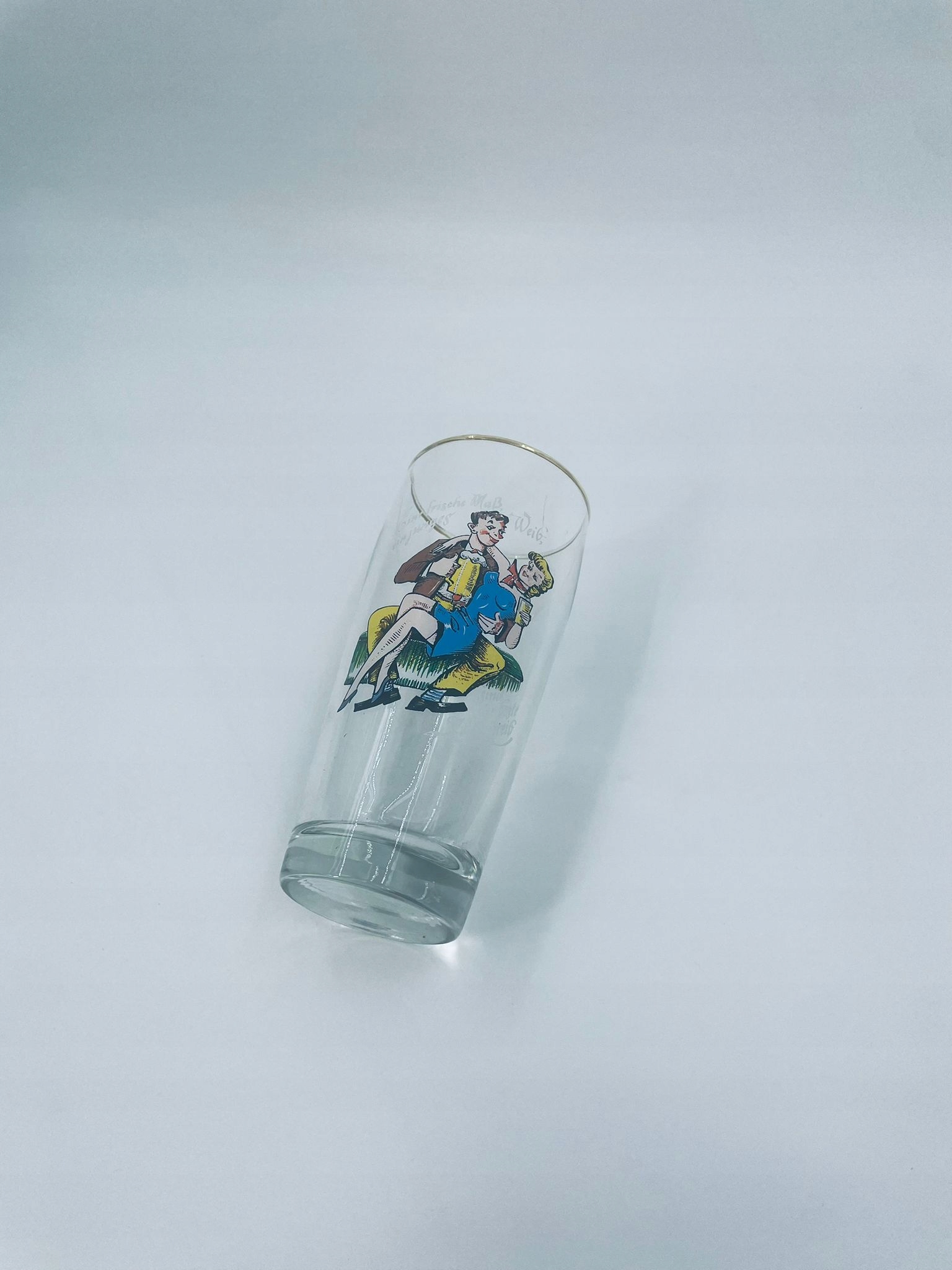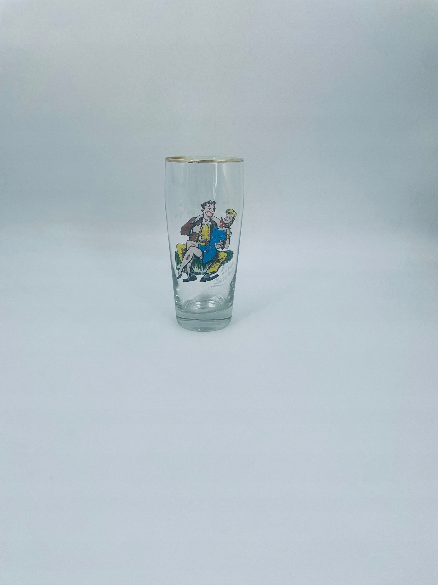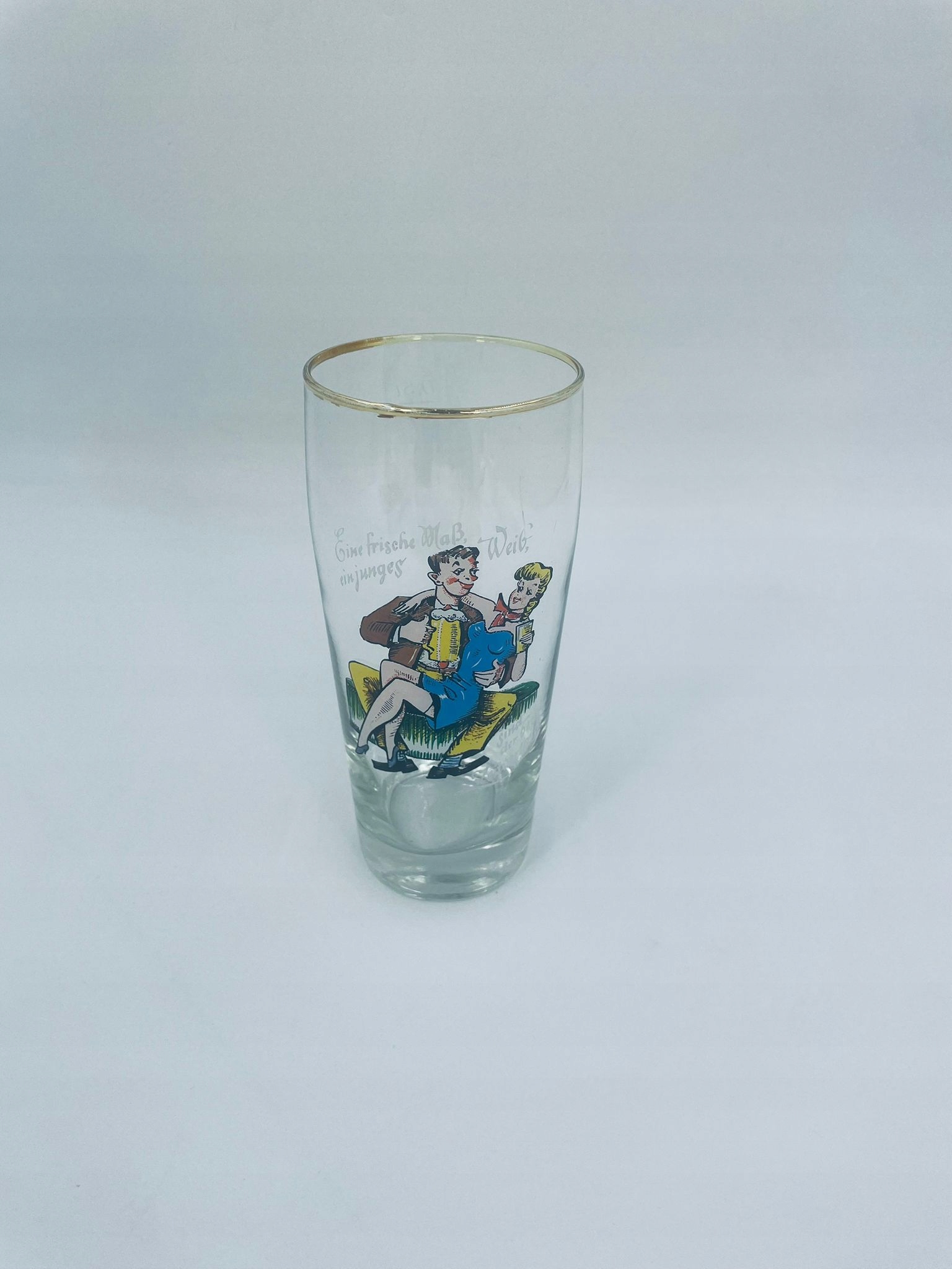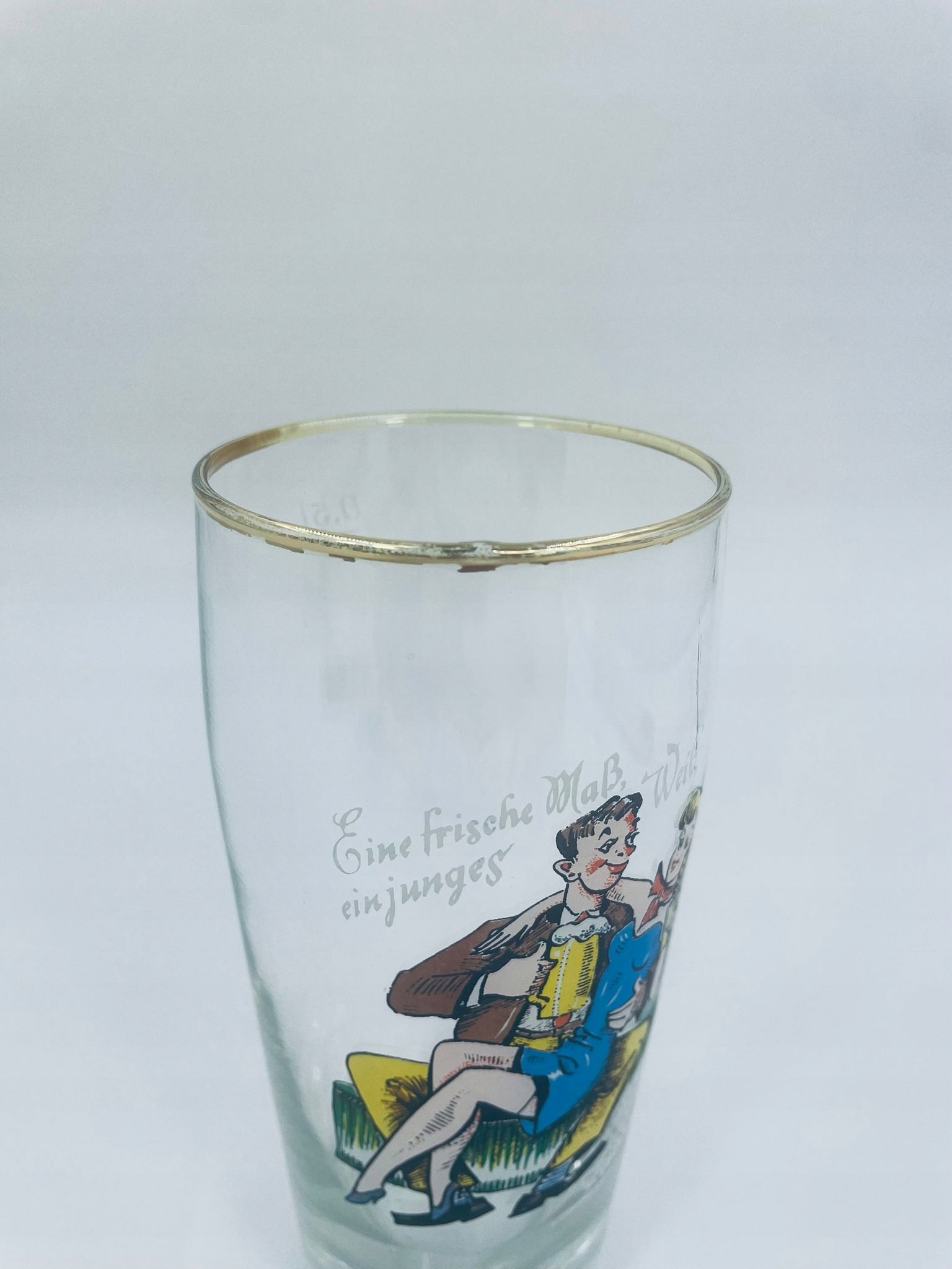 Старовинний пивний кухоль у Вінтажному стилі, виготовлений з високоякісного товстого прозорого скла, з товстішою основою. На кухлі є жартівливий малюнок, на якому зображений чоловік, який тримає кухоль з пивом, а жінка на колінах. Має потертості на позолоті на верхньому краї та невелику подряпину.