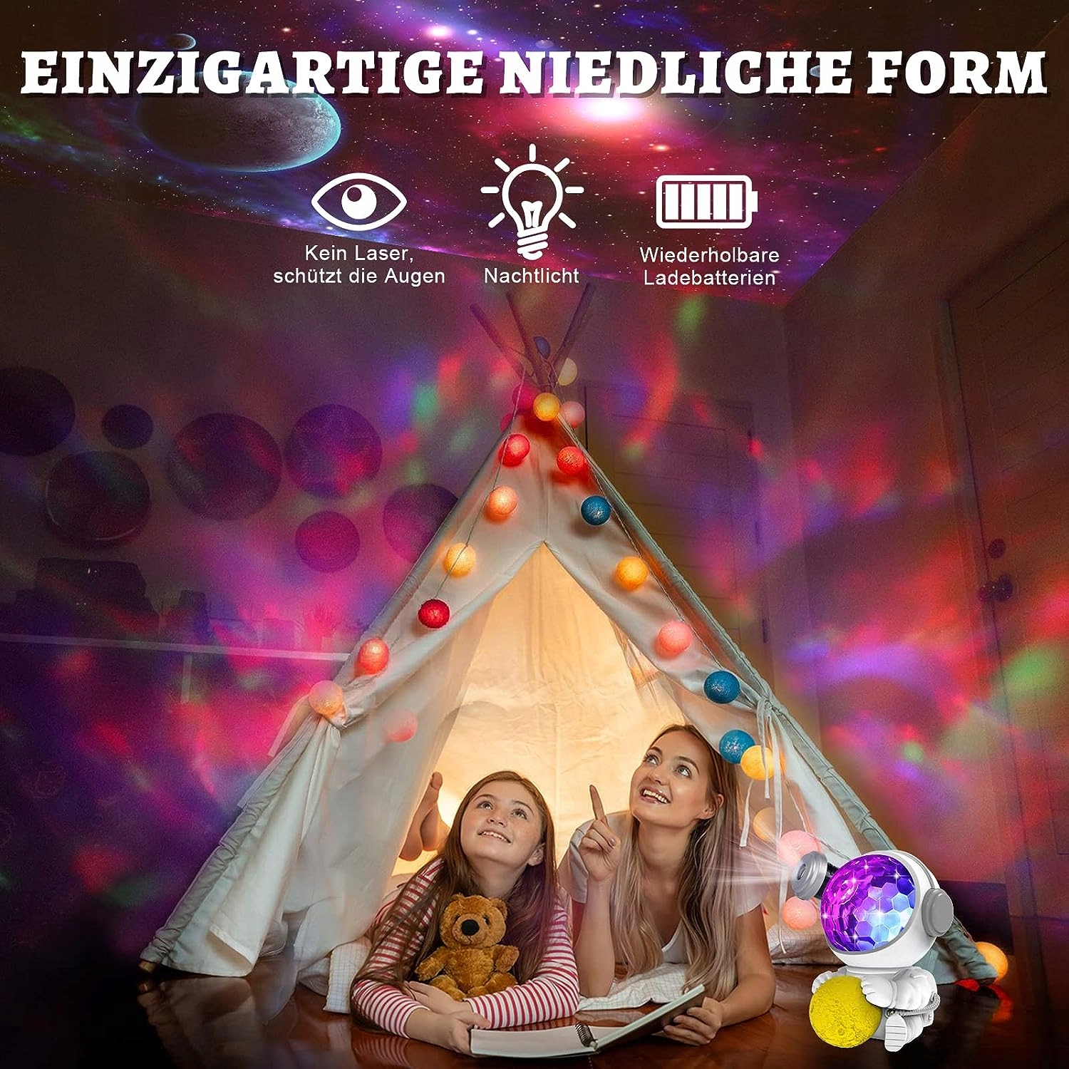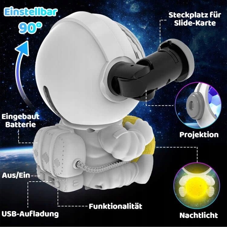 Оснащено вбудованою батареєю Recoargebale, зовнішнє джерело живлення не потрібне, а Astronaut Night Light проектор легко переносити.