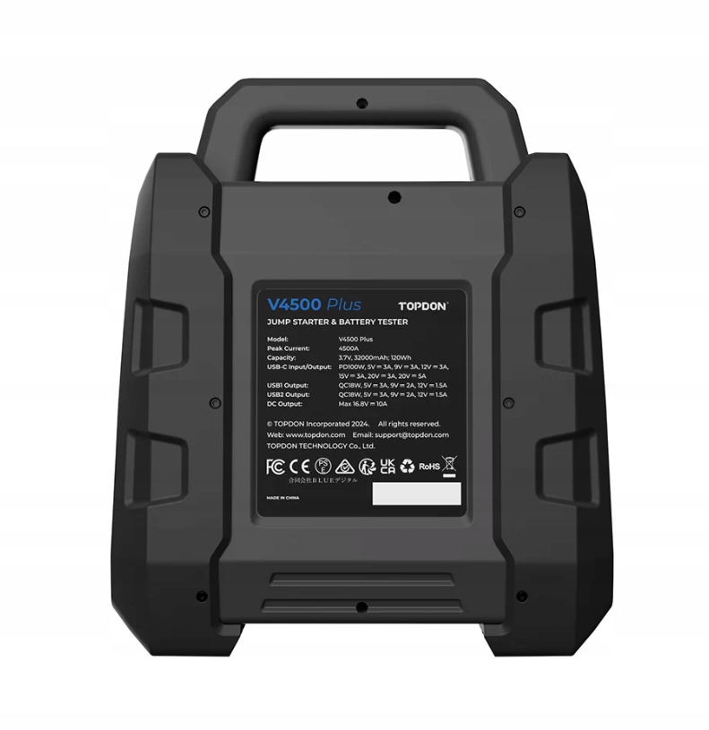 Topdon V4500 Plus Jump Starter Starter пропонує найкращі енергетичні рішення для автомобілів великої ємності, таких як вантажівки з причепами та причепами. Завдяки піковому струму 4500, він спеціально розроблений для 12 В автомобілях, що підходить для бензинових та дизельних транспортних засобів з потужністю двигуна до 16 літрів.