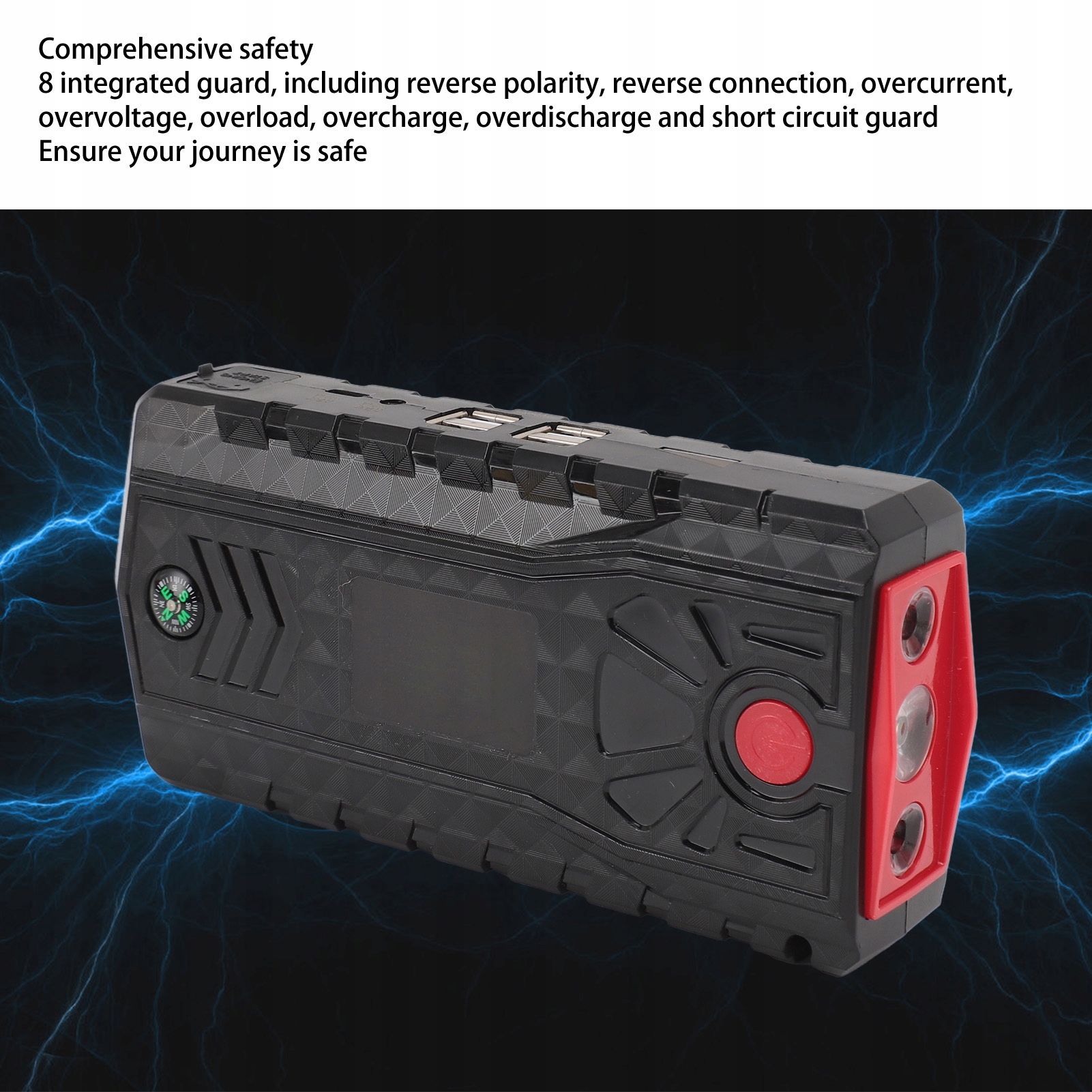 5. КОМПЛЕКСНА БЕЗПЕКА: цей портативний літієвий автомобільний пусковий пристрій має 8 інтегрованих засобів захисту, включаючи захист від зворотної полярності, зворотного підключення, захисту від надточного струму, перенапруги, перевантаження, перезаряду, надмірного розряду та короткого замикання. Переконайтеся, що ваша подорож безпечна.