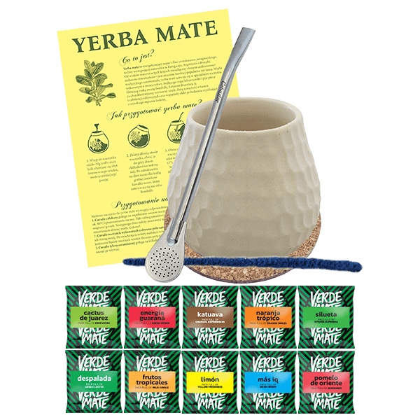 Кажуть, що йерба мате схожий на вино. Безліч брендів і видів вражає, і кожен з них пропонує дещо інший досвід для смаку. Отже, як вибрати ідеальний продукт для себе? Відповідь проста: скуштувавши сам! Ось чому ми включили ДЕСЯТЬ зразків по 50 г кожен. Як пити йербу? Бомбілла Мерседес буде важливою. Це спеціальна фільтрувальна трубка, яка відокремить ароматний настій від кавової гущі. У набір також входить відповідна посудина для подачі напою - гарбуз з високоякісної кераміки. Він точно прослужить багато років! Все це доповнюється пробковою підкладкою, очисником і листівкою з необхідною інформацією.