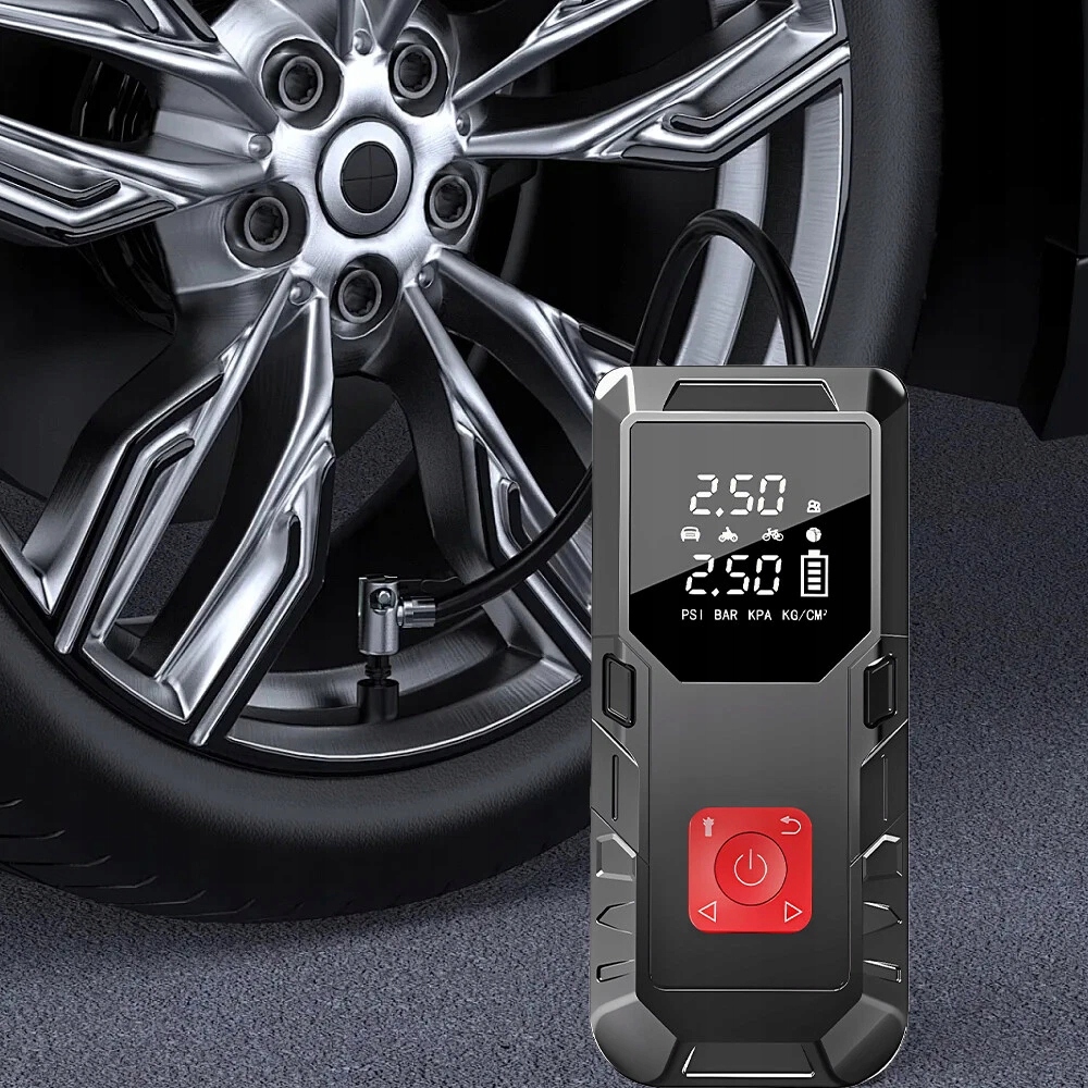 🚗🚗Насос стисненого повітря 150 фунтів на квадратний дюйм зі світлодіодним дисплеєм:Цей автомобільний акумуляторний підсилювач потужністю 150 фунтів на квадратний дюйм постачається зі знімним повітряним шлангом, щоб ви могли будь-коли надути свої шини, повітряні кулі тощо. Автомобільний зарядний пристрій оснащено інтелектуальним РК-дисплеєм, який дає змогу зчитувати в реальному часі стартер, стан роботи та тиск у шинах внутрішньої батареї.