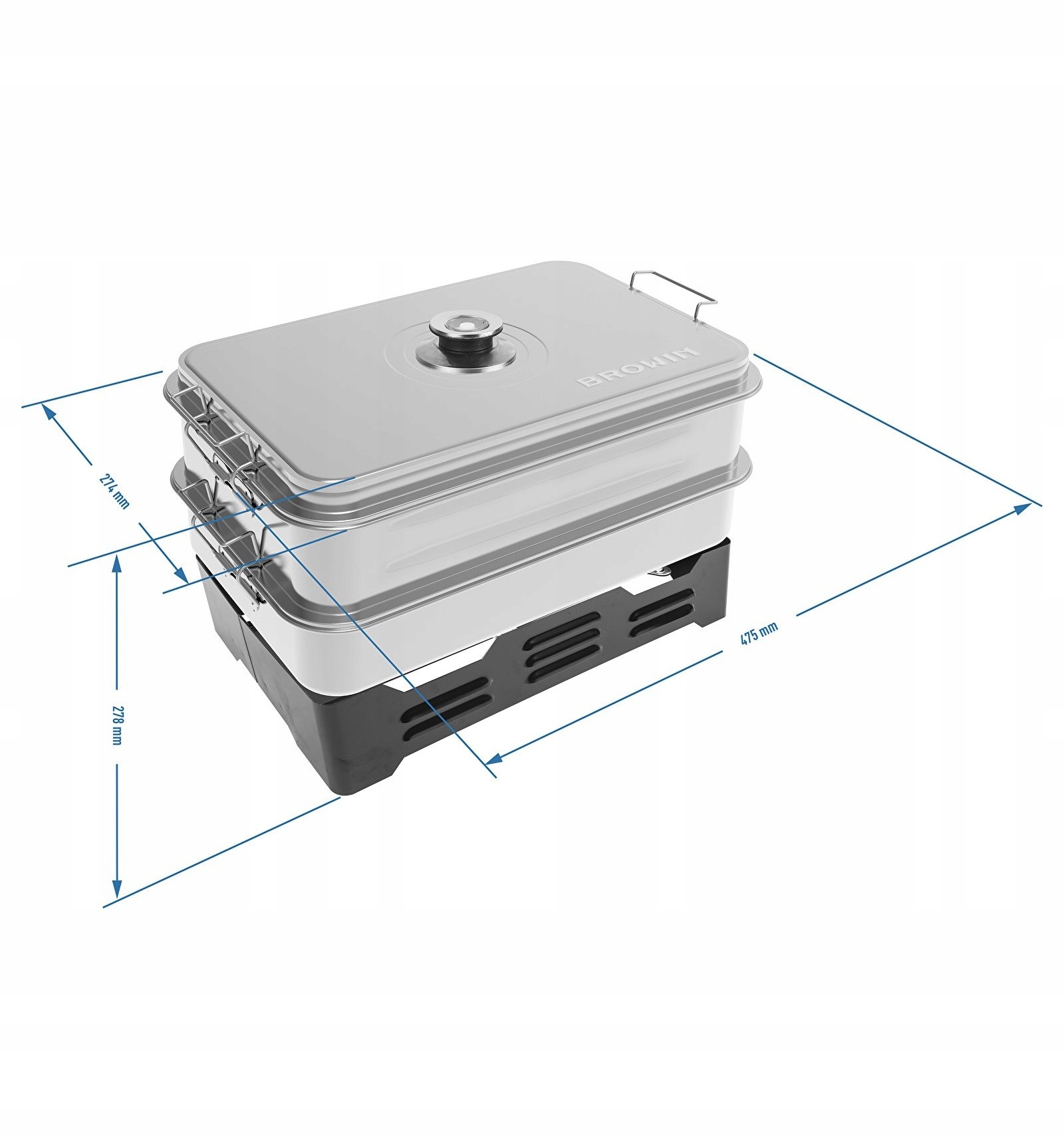 Домашня коптильня Browin ідеально підходить для копчення різних видів продуктів. Має додаткове розширення з другою решіткою, що дозволяє готувати більшу кількість їжі одночасно. Виріб виготовлено з високоякісної нержавіючої сталі, призначеної для контакту з харчовими продуктами. Коптильня має дві конфорки з регульованим полум'ям і три решітки. Працює на гелевому паливі, що забезпечує копчення без запаху та диму. Оснащений термометром, що дозволяє контролювати температуру в камері протягом усього процесу копчення.