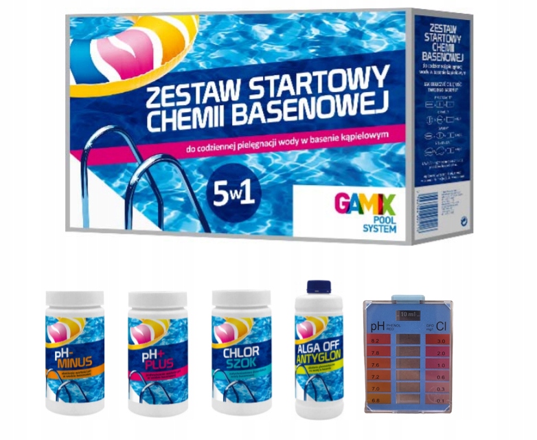 ZESTAW STARTOWY 5w1 CHEMII DO BASENU BASENOWEJ CHLOR ANTYGLON PH TEST GAMIX