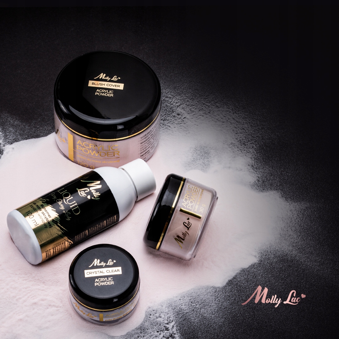 Акрилові пудри MollyLac ідеально тонкі, за текстурою нагадують розсипчасту пудру. Крім того, вони стійкі до кристалізації, не жовтіють під впливом сонячних променів, а також їх додатковою перевагою є простота обробки.