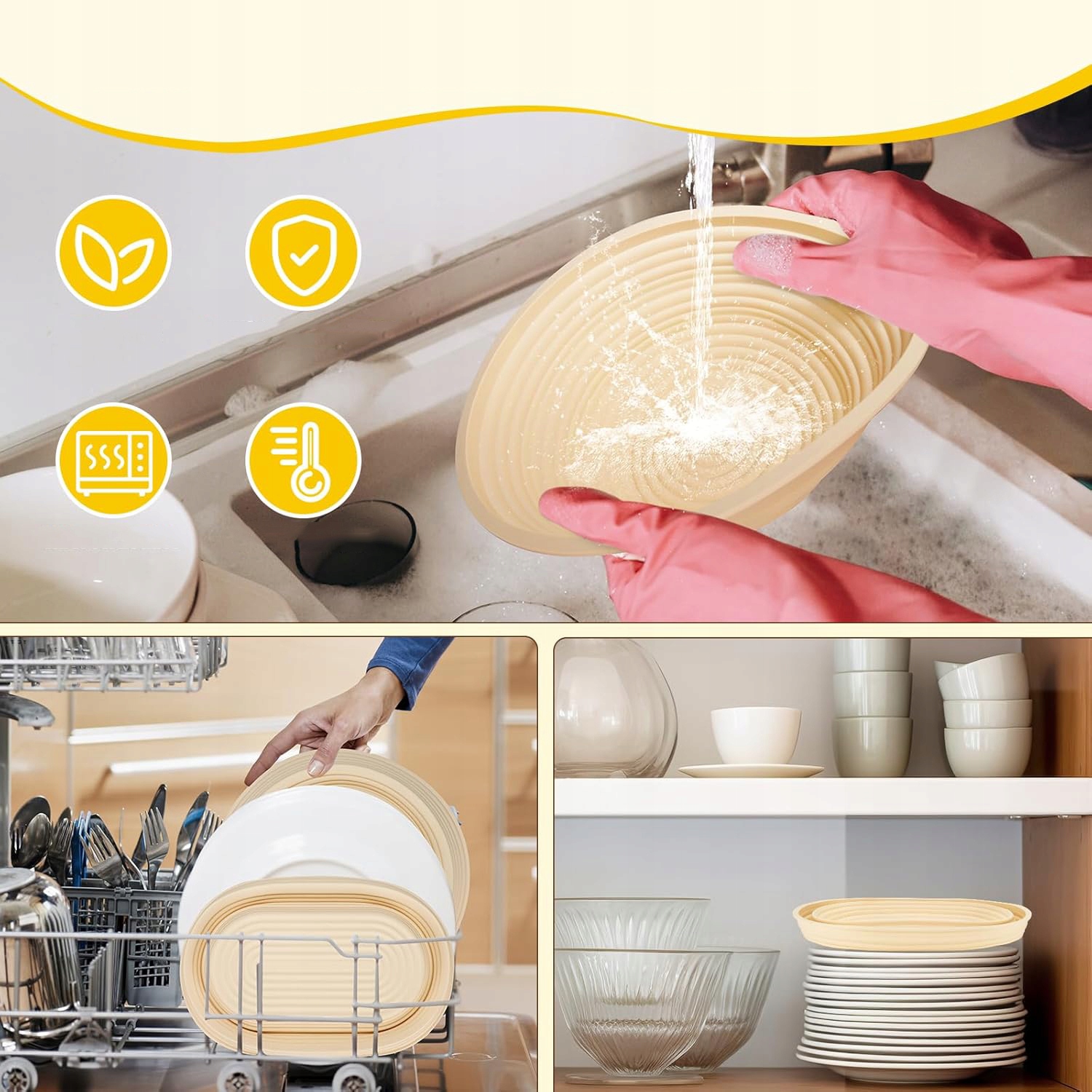 🍞 Харчовий силіконовий матеріал: наші кошики для випічки хліба виготовлені з високоякісного силікону. Вони не тільки міцні, але й не містять BPA, свинцю, латексу або BPS. Порівняно з ротанговими чи дерев’яними кошиками вони не пліснявіють і набагато безпечніші для сімейного використання