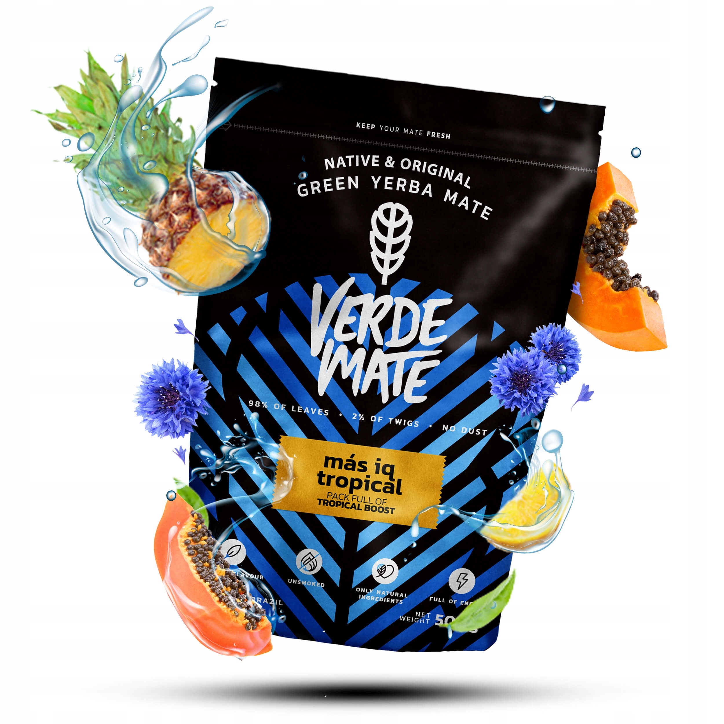 Солодкі аромати дикої троянди, папайї та плодів дракона приваблюють своїм чудовим ароматом і спонукають спробувати. Справжній потенціал Verde Mate Green Más IQ Tropical полягає в додаванні гуарани, яка має стимулюючі властивості та додатково підсилює дію йерба мате. Смак і ефект йерба мате також доповнюються додаванням женьшеню та гінкго білоба.