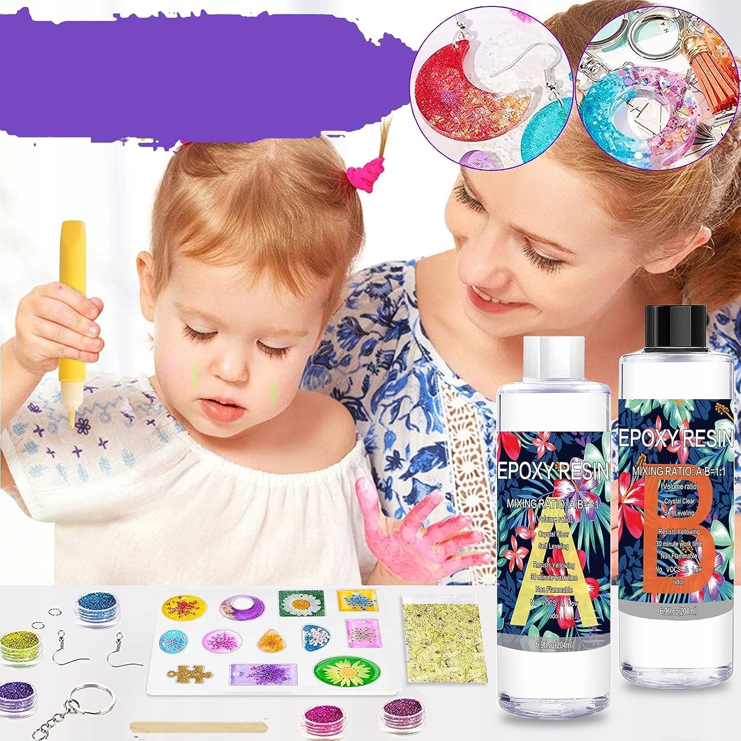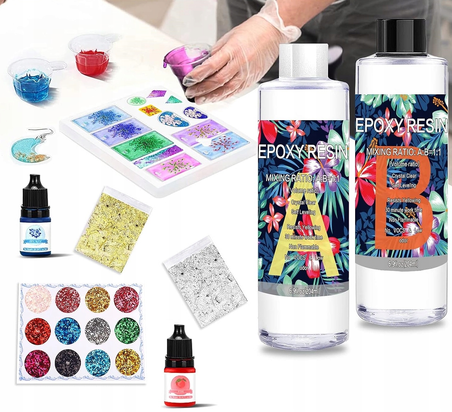 ? Усе, що вам потрібно, в одному наборі: наш набір містить широкий вибір аксесуарів, тож ви можете почати творити одразу. Тут ви знайдете 3 різні силіконові форми для прикрас, 2 ємності по 200 мл компонентів A/B, а також 8 відтінків смоляного пігменту, 12 видів блискіток, набір сухоцвітів, гачки для сережок, шкіряні ланцюжки, брелоки, стрибучі кільця, люверси, гвинти та багато інших елементів.