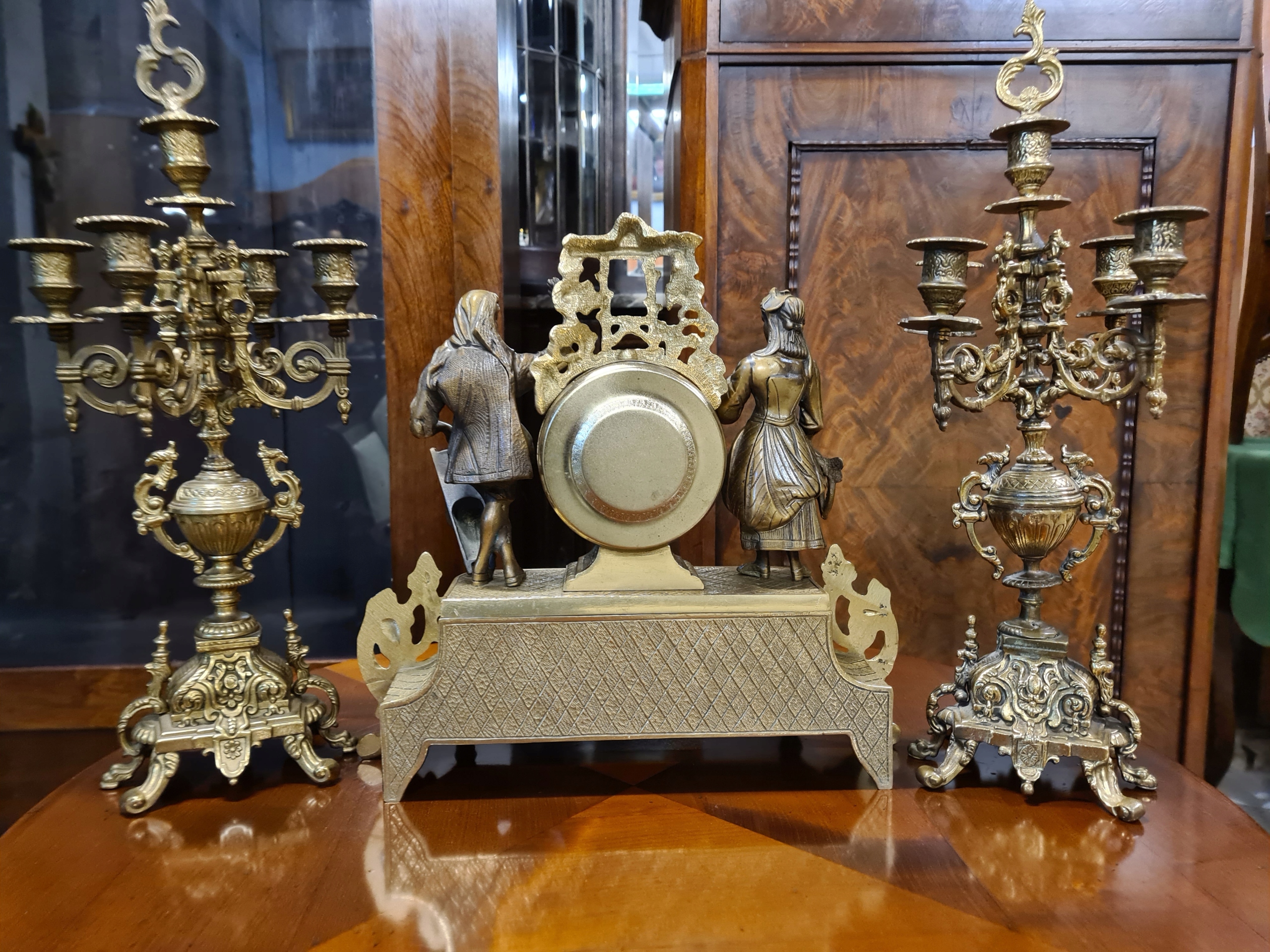 Stary ładny Zegar + dwa świeczniki Komplet Kominkowy Mosiądz