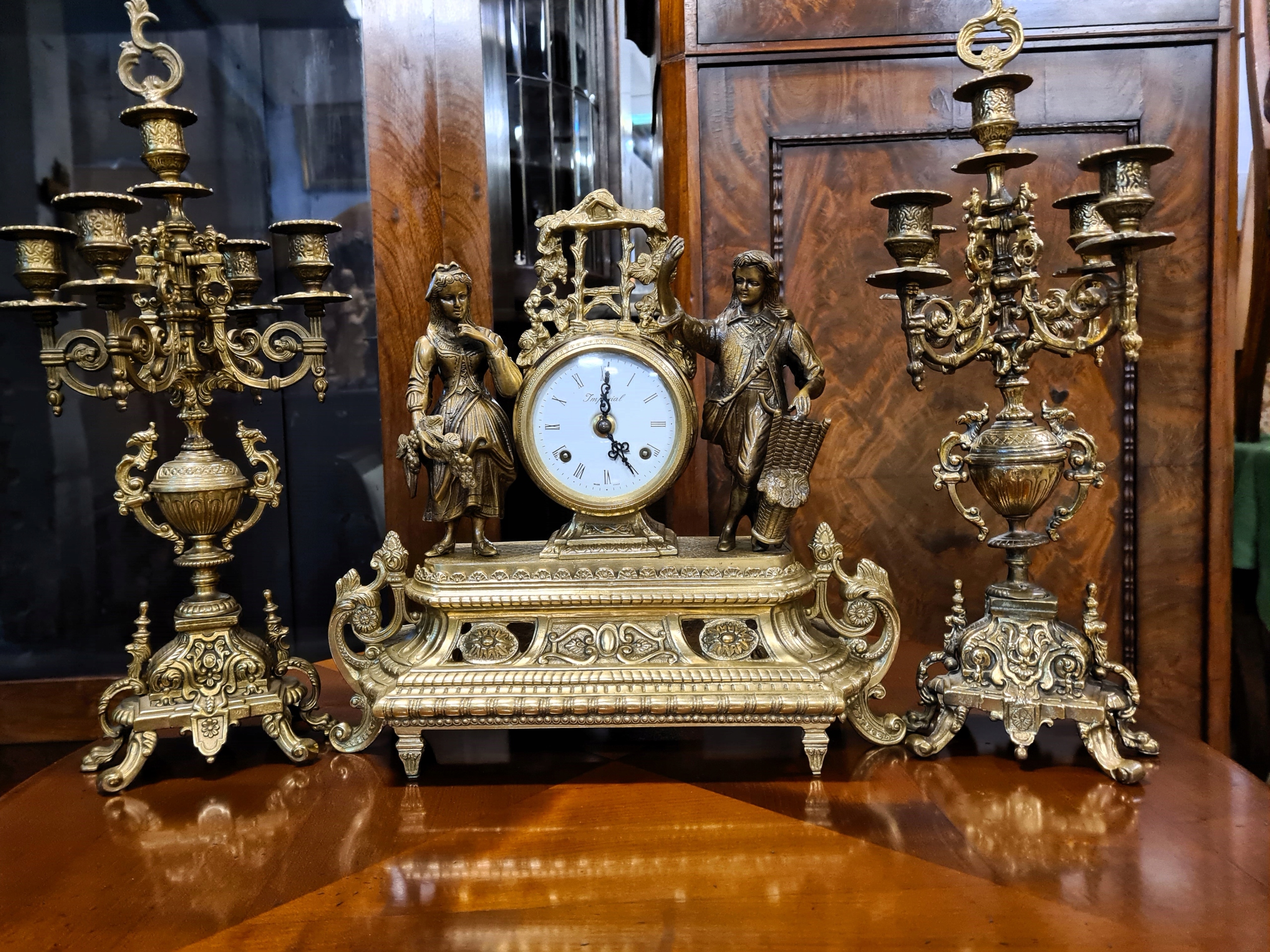 Stary ładny Zegar + dwa świeczniki Komplet Kominkowy Mosiądz