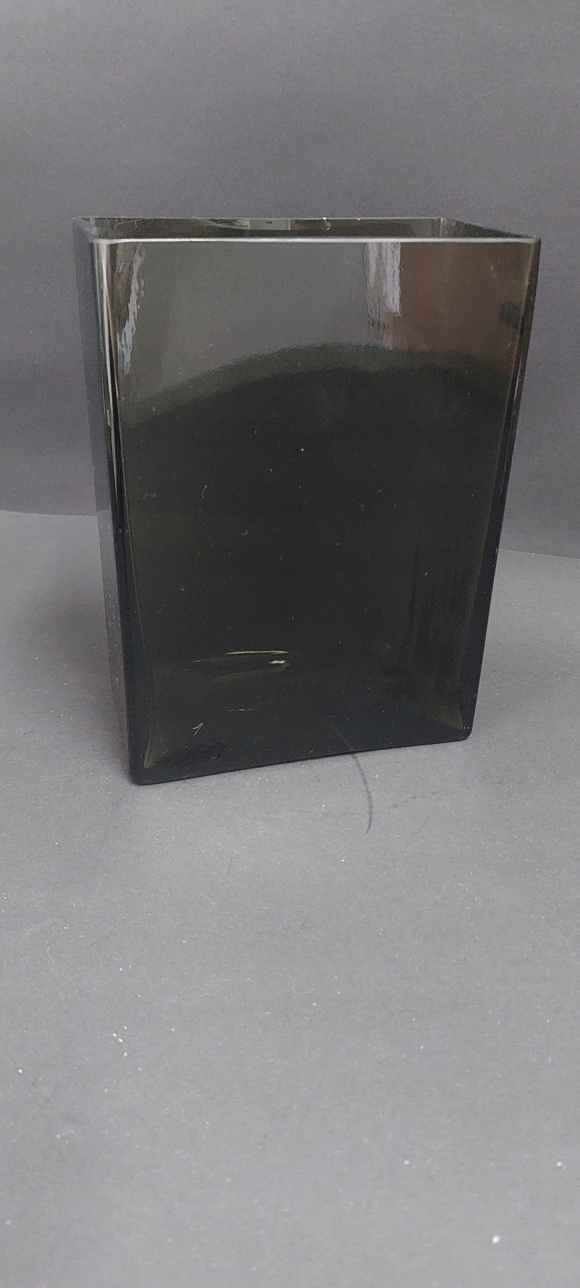 Стара гарна скляна ваза, кольору гнилого темно-зеленого, має три невеликі дефекти у верхній частині біля настою, в іншому стані