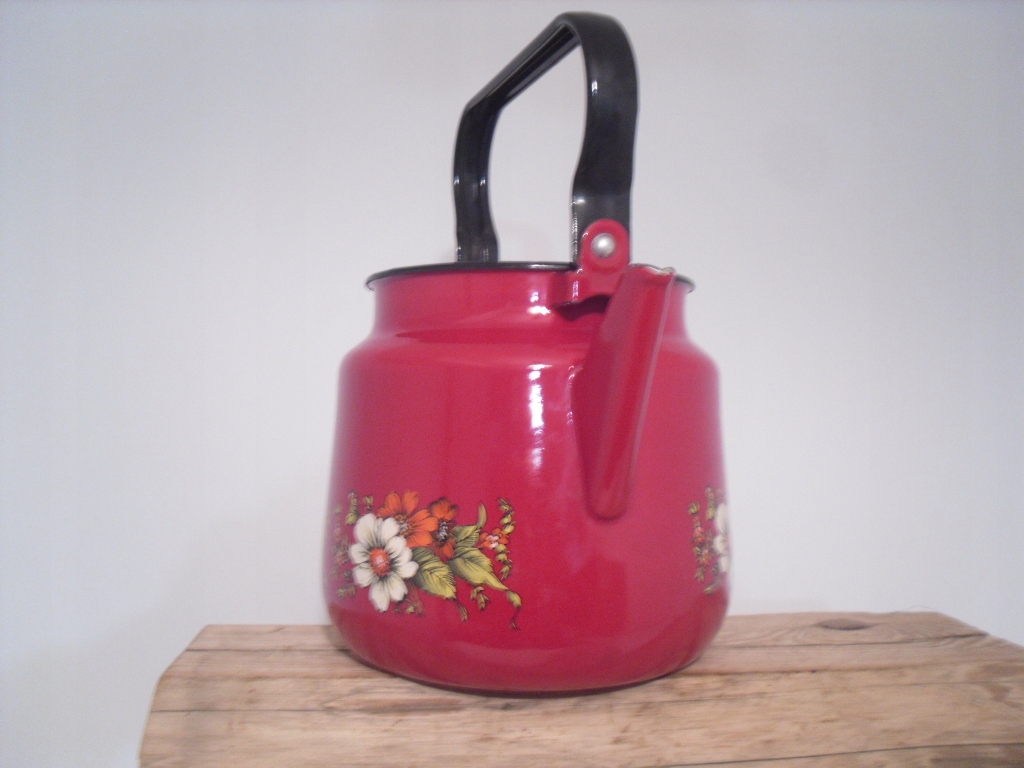 Stary duży czajnik dzbanek emaliowany zdobiony ogród czajniczek czerwony 3l