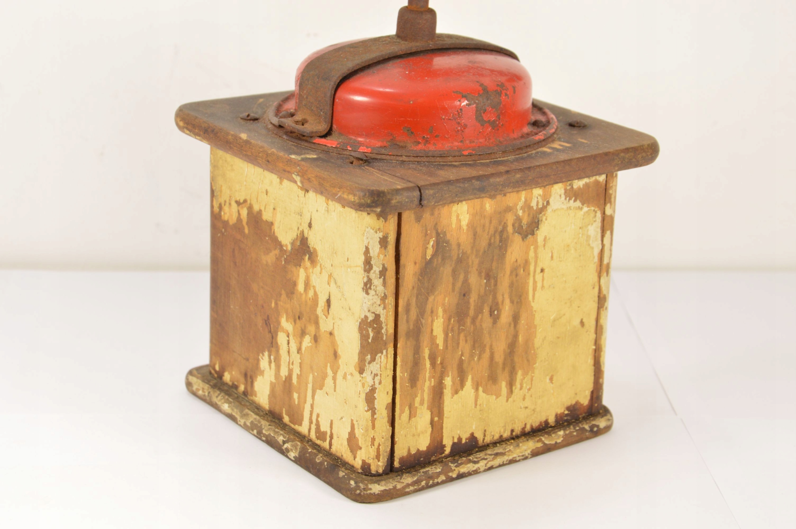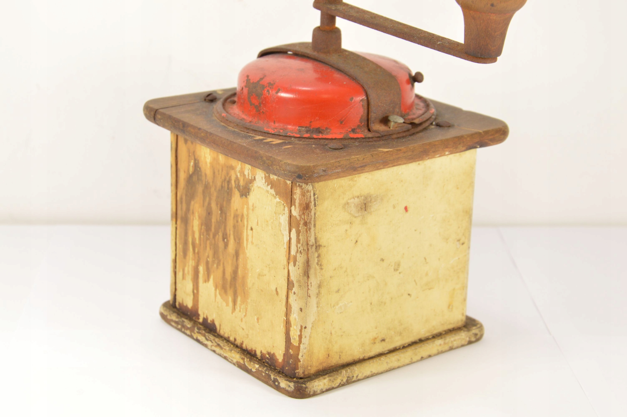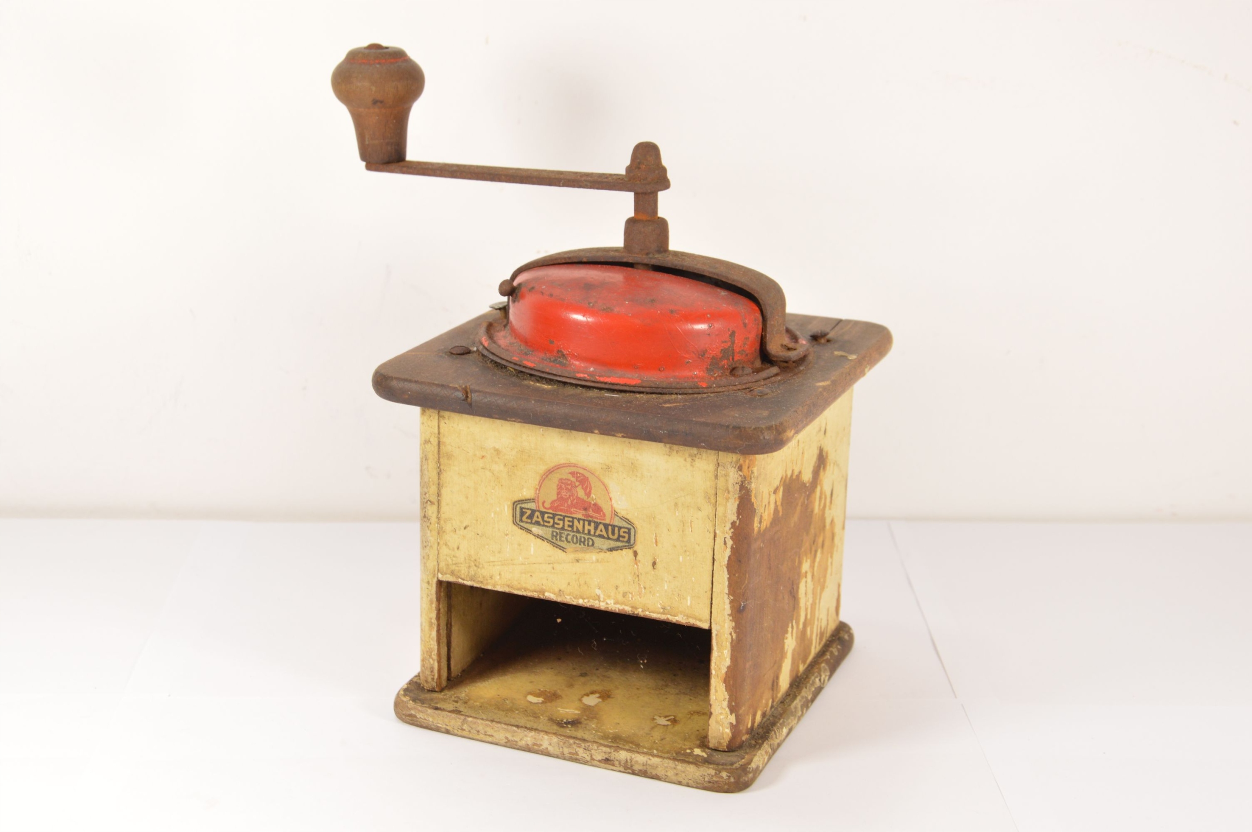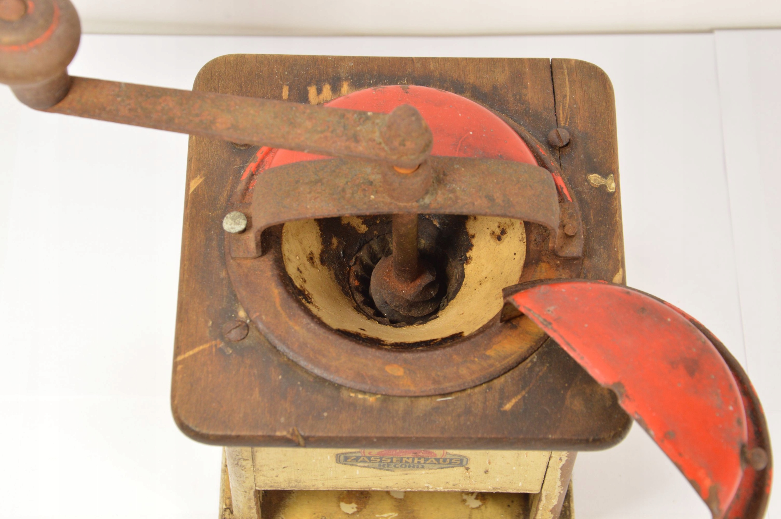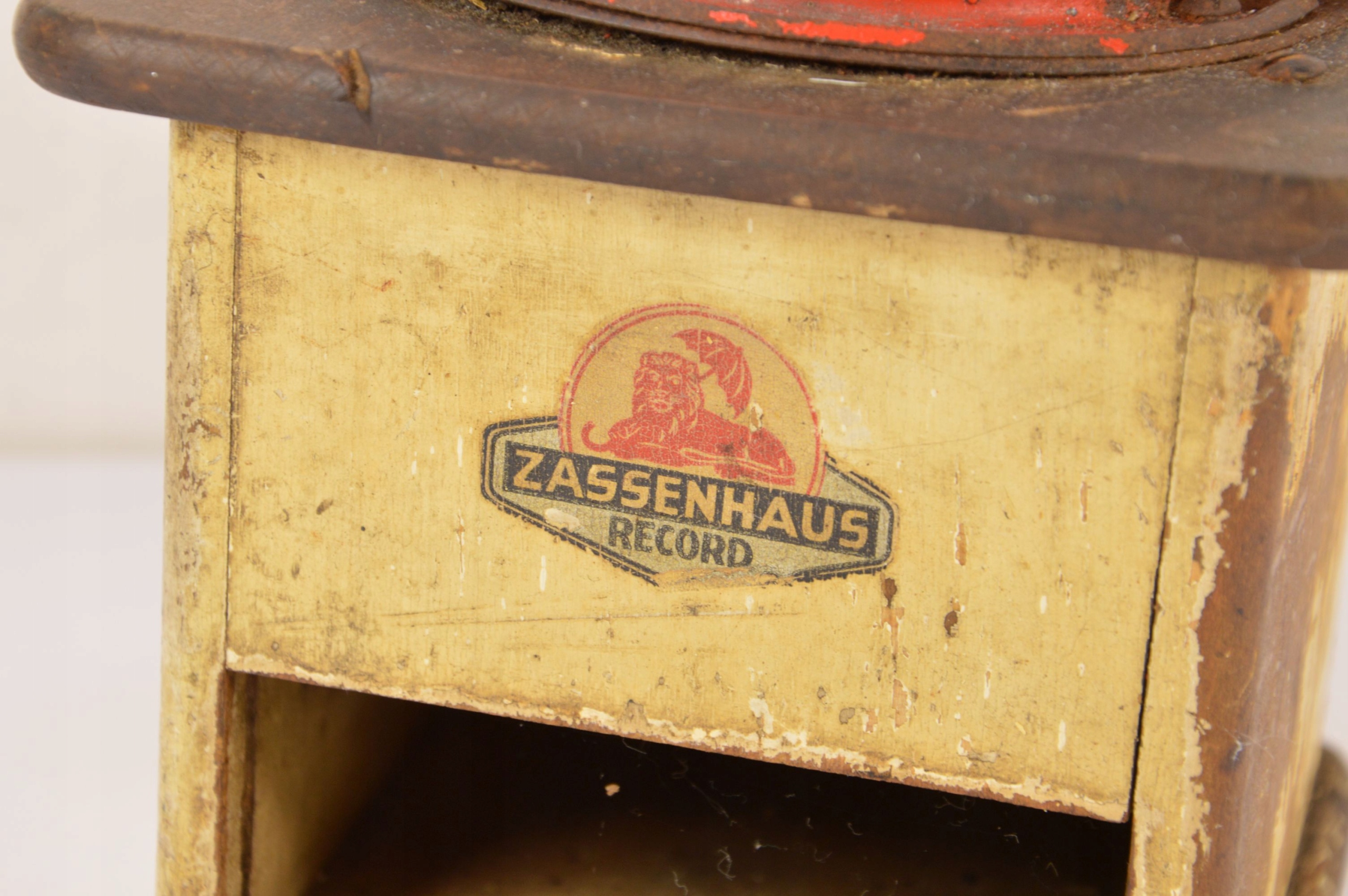 Стара, підписана, велика млинка Zassenhaus Record. Дерев'яна шліфувальна машина з металевою шліфувальною частиною. Видимі потертості фарби, подряпини та відсутність ящика.
