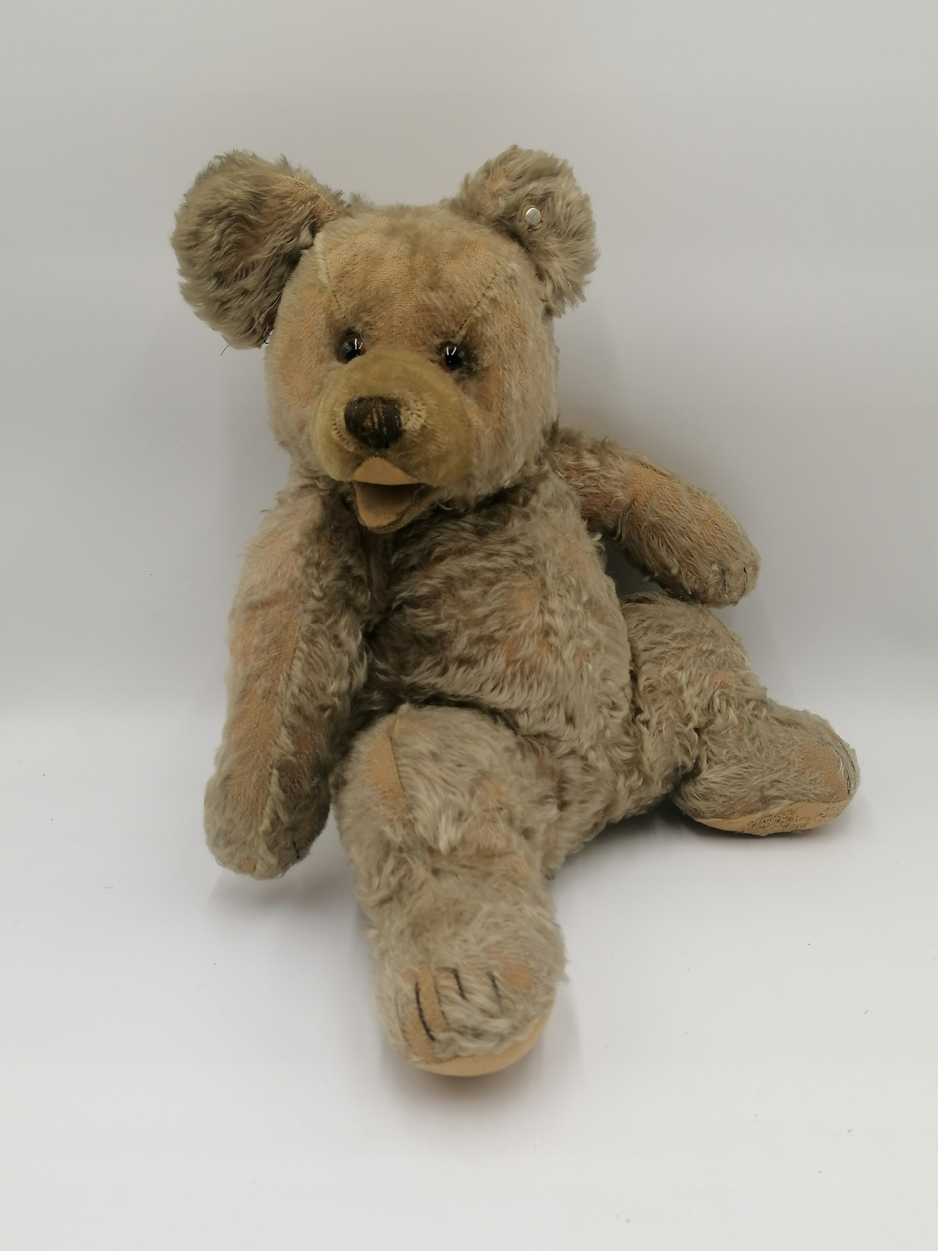 У ведмедика є сліди використання, помітна втрата шерсті, проколене вухо та штопані лапи.