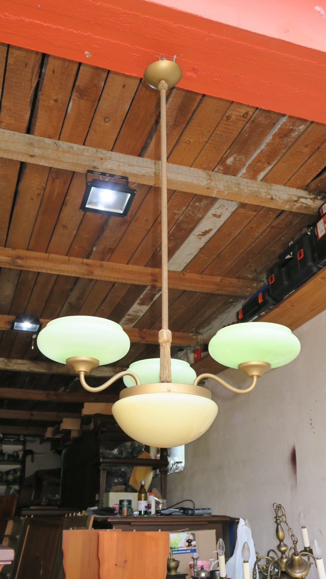 Старий унікальний Люстра з 3 кронштейнами і центральною лампою. Люстра датується 1920-ми роками. Вона має три плеча з легкими зеленими абажурами та центральну лампу з кремовим абажуром. Все оригінальне і 100% справне. Можливо в стилі арт-деко.
