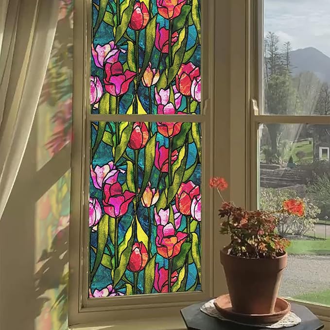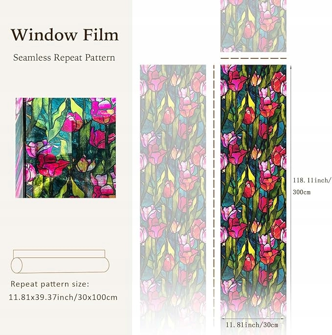 СТАТИЧНА ВІКОННА ФОЛЬГА ВИТРАЖ ДВЕРНІ КВІТИ 30х300СМ