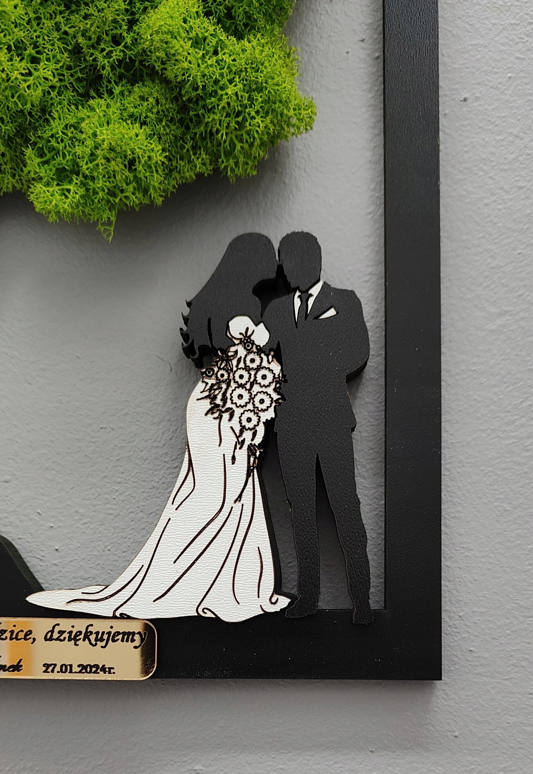Бонсай - дерево щастя в подарунок батькам/свідкам. Дерево, прикрашене мохом. У дерево включена фігура нареченого і нареченої - вона в білій сукні, він в чорному костюмі і білій сорочці. Додатково оправу прикрашає красива незвичайна табличка із золотого дзеркала. Золоте дзеркало надає елегантності та шарму. Гравірування на пластині можна вільно змінювати.