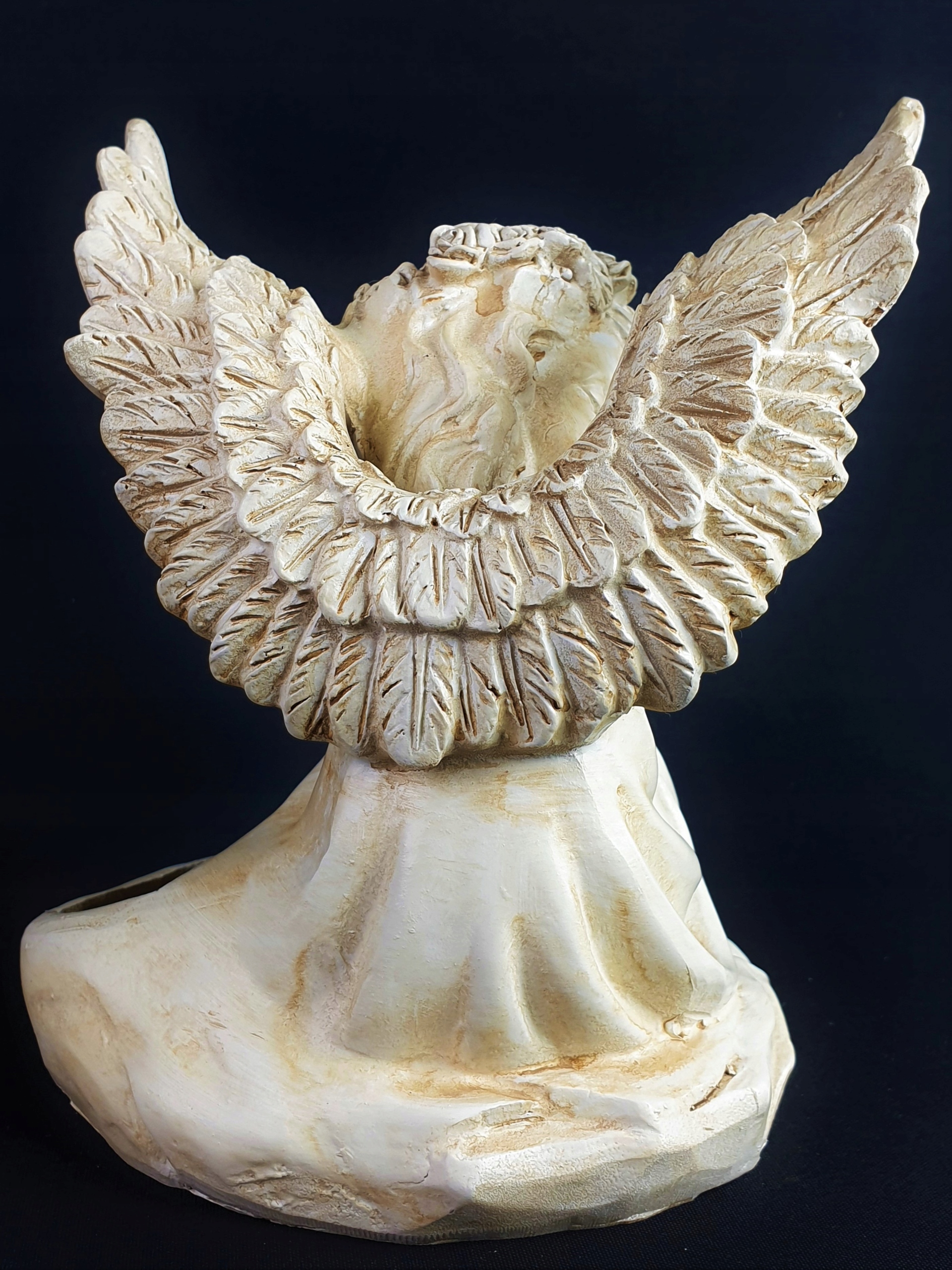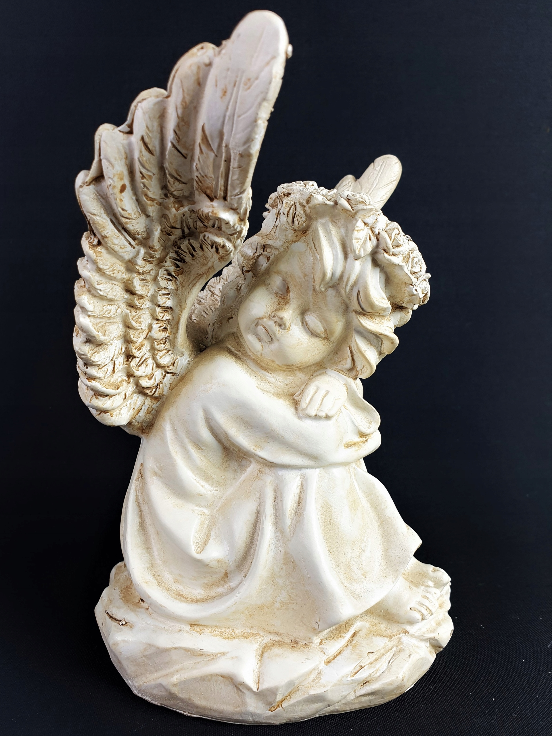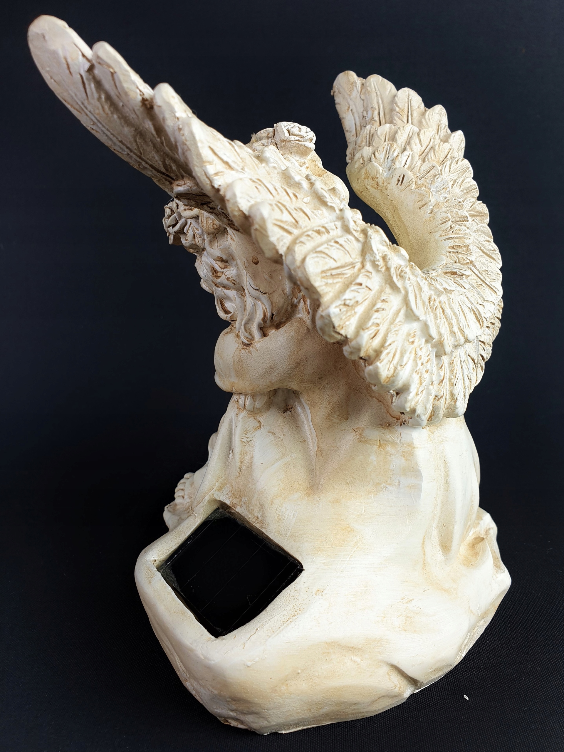 Ангел виготовлено з альбарію та смоляного матеріалу який був просочений, завдяки цій обробці він може бути ідеальною прикрасою як для інтер’єрів, так і для екстер’єрів, наприклад, могил, садів, балконів.