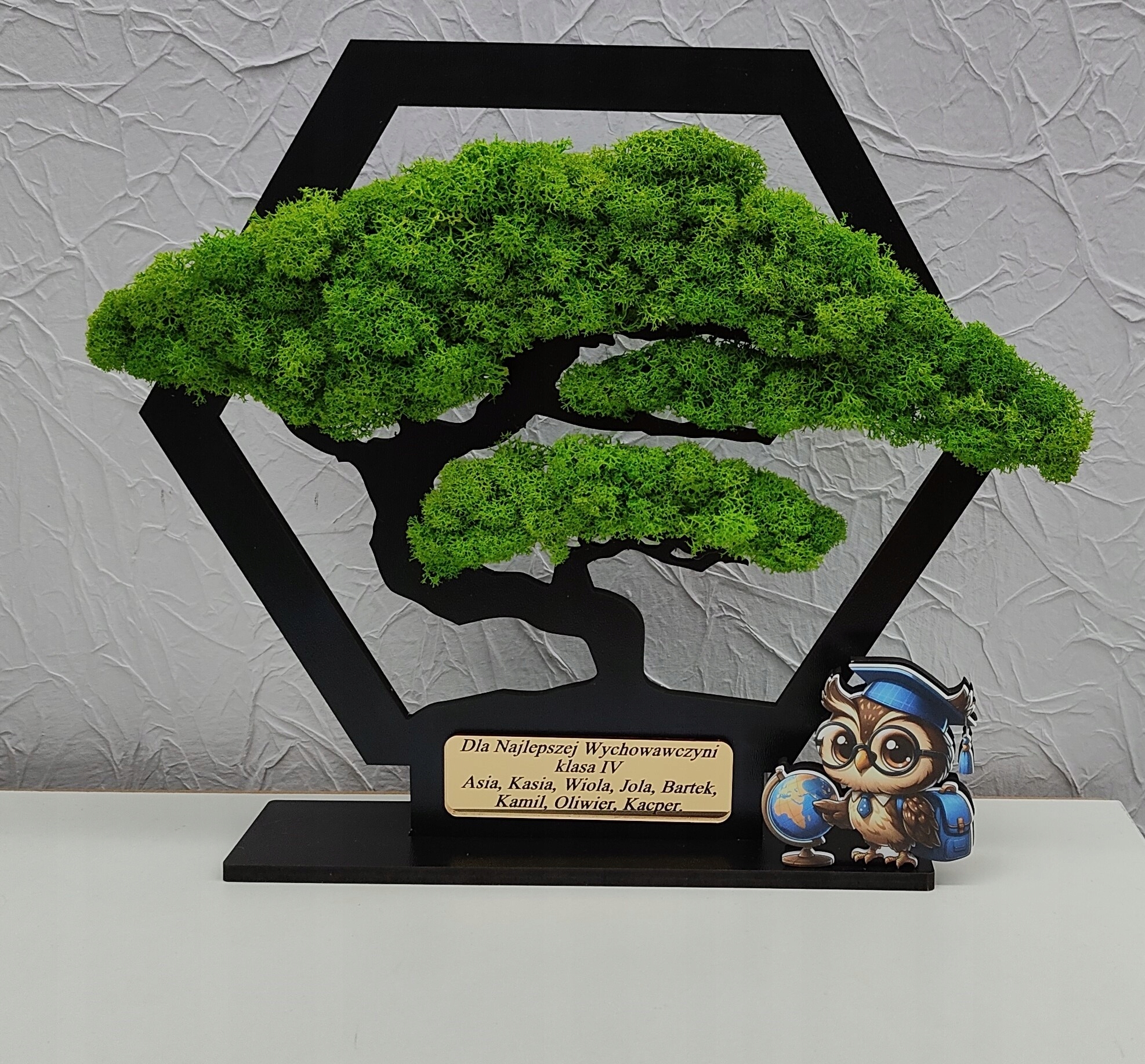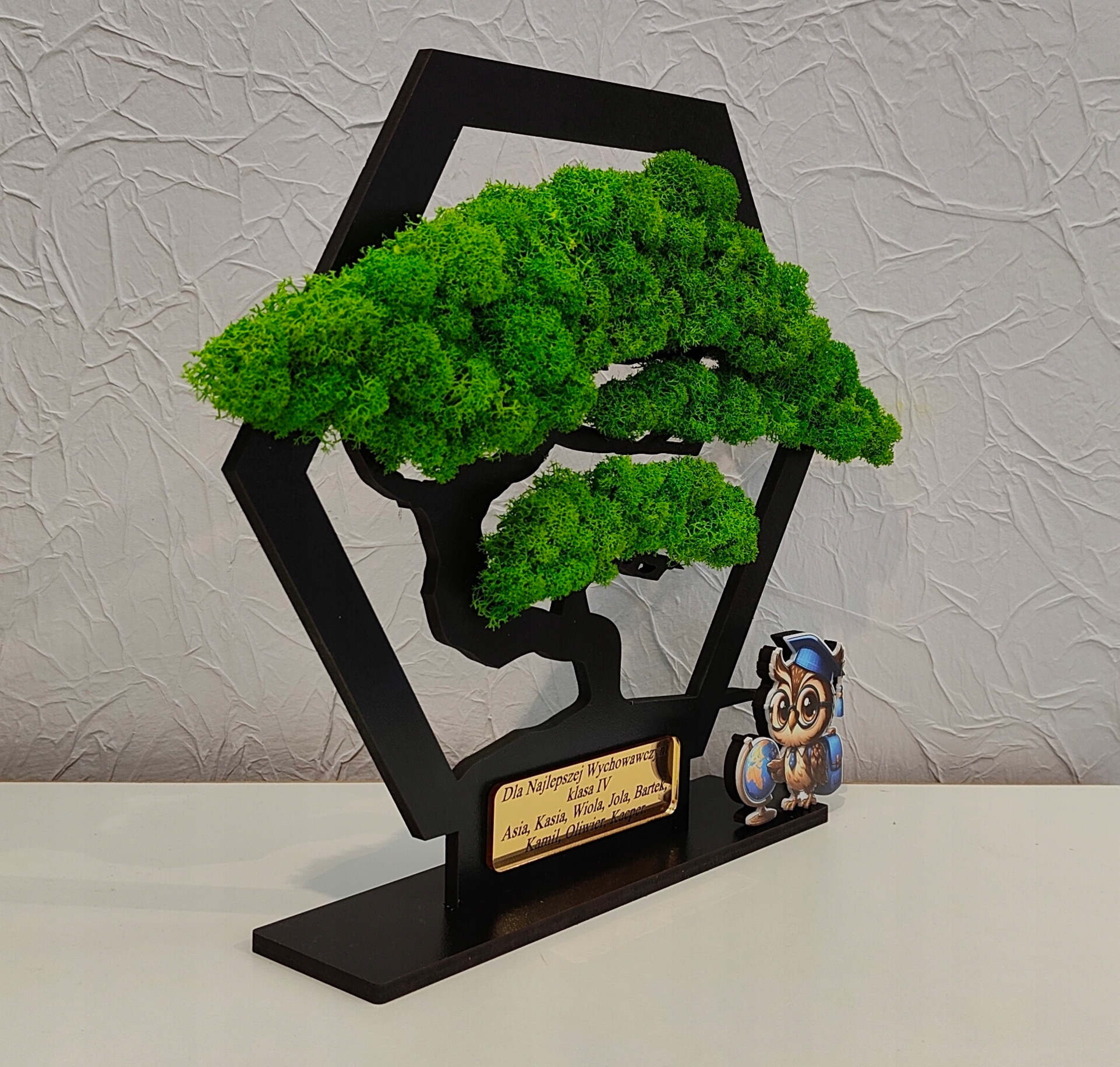 Статуетка бонсай - дерево щастя з мохом, як подяка вчителю в кінці уроку навчального року або з нагоди Дня освіти. Дерево, прикрашене мохом.