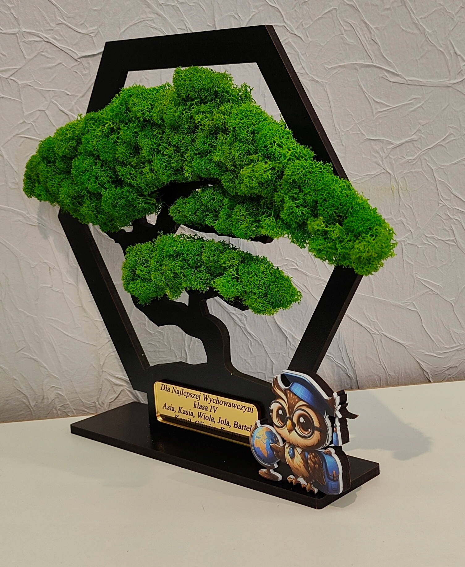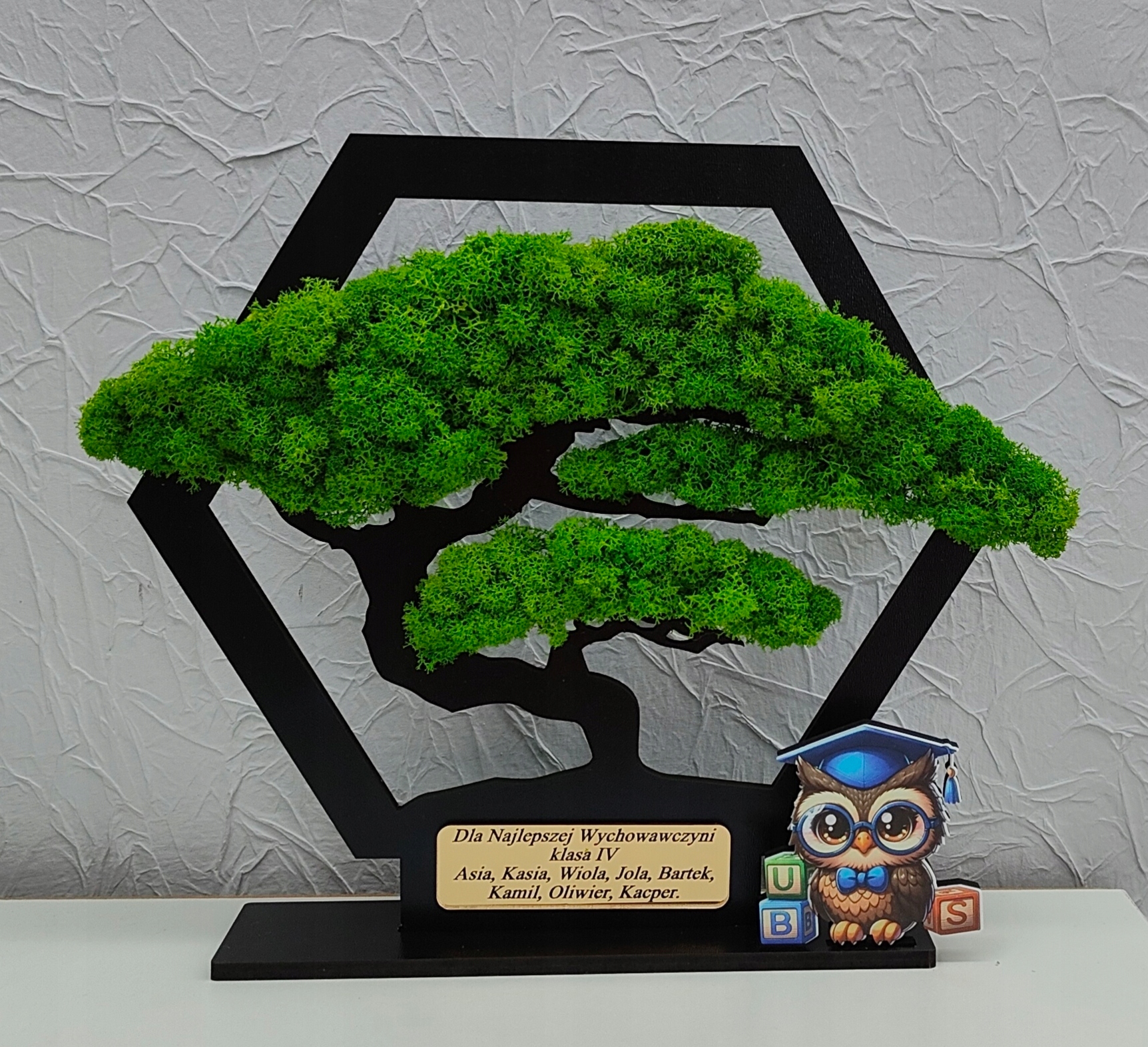 Статуетка бонсай з мохом, день вчителя, кінець року, різнобарвна сова