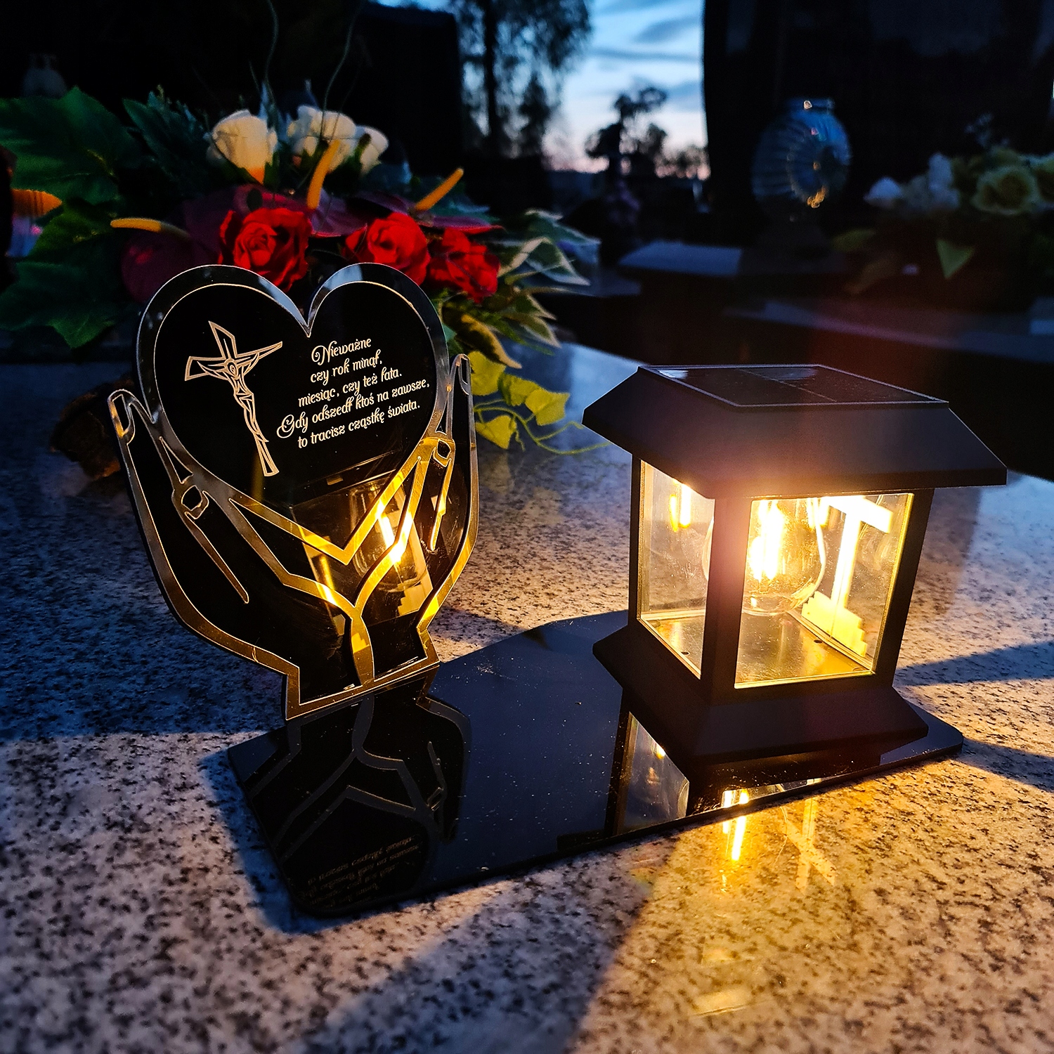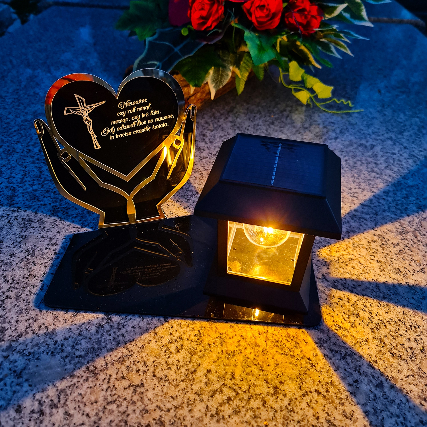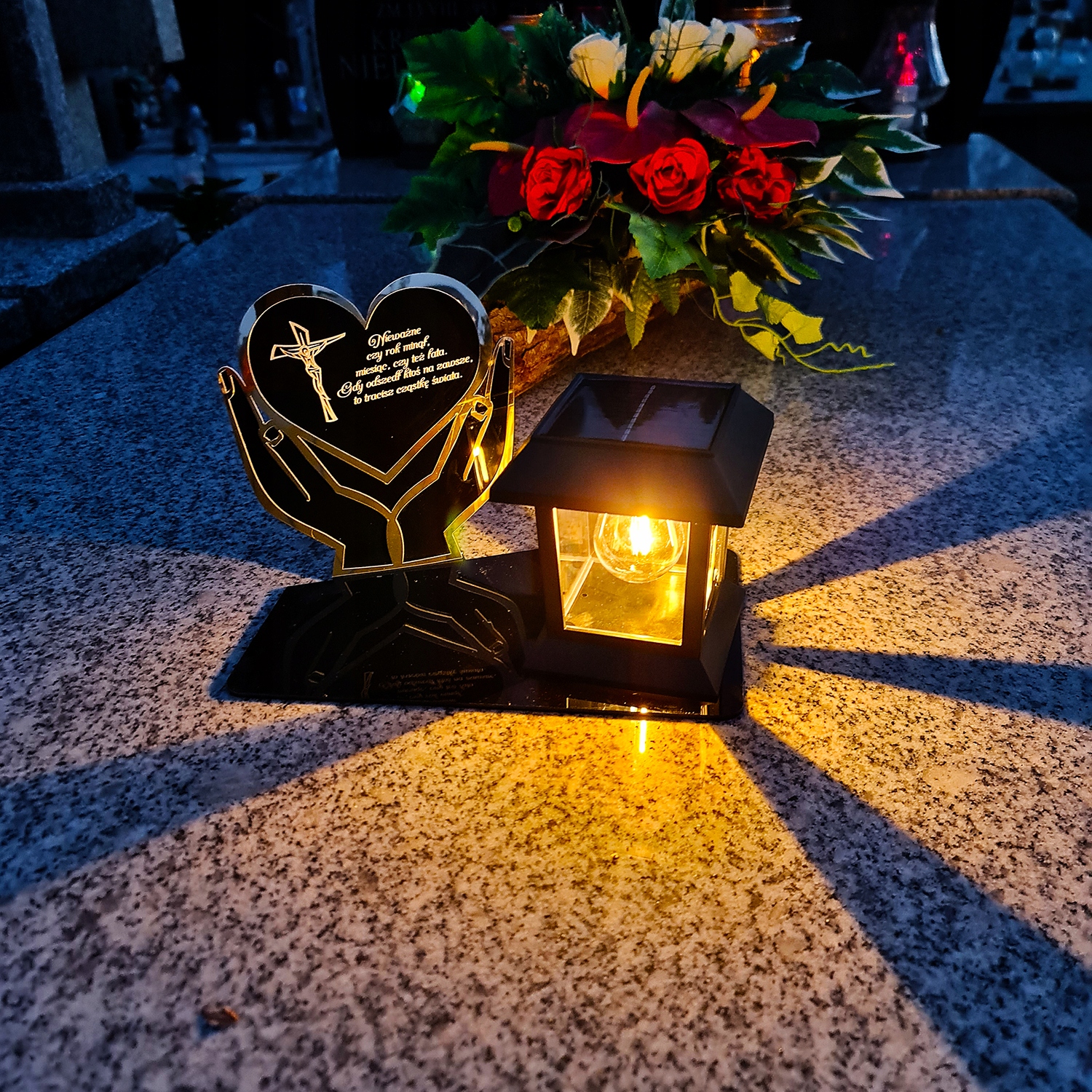 Eternal solar candle for a grave with an engraved acrylic glass stands decorated with the motif of golden hands with heart h2>