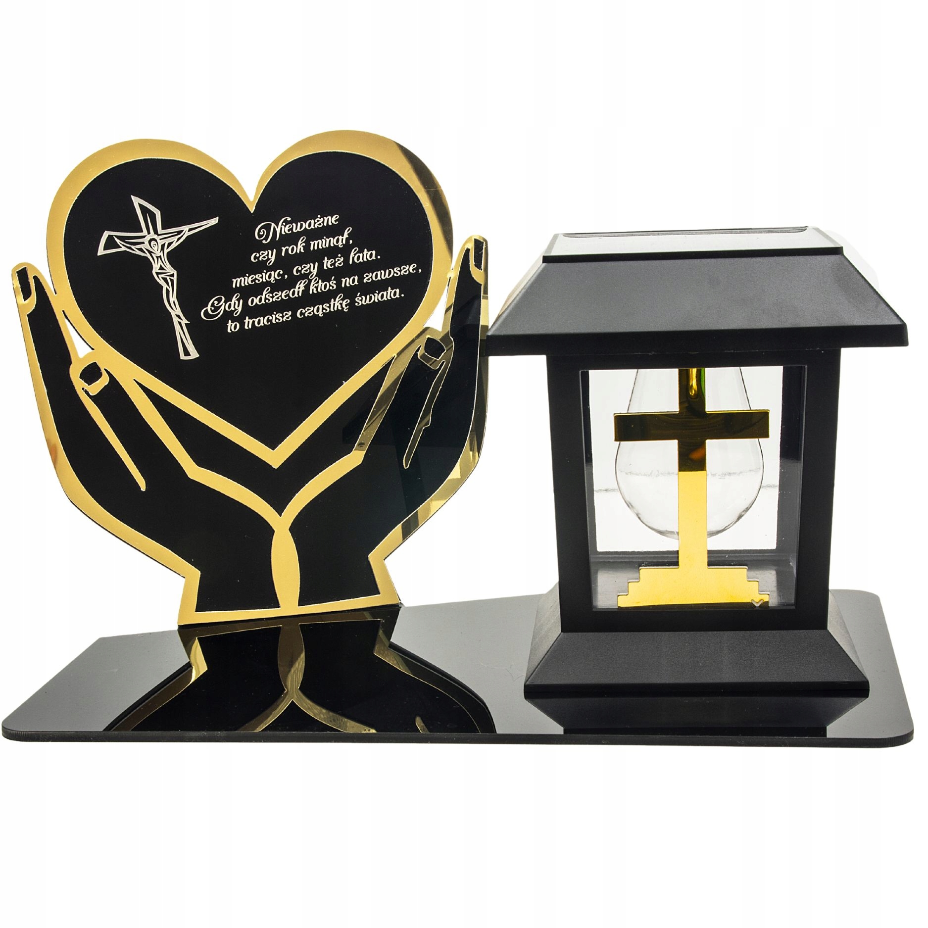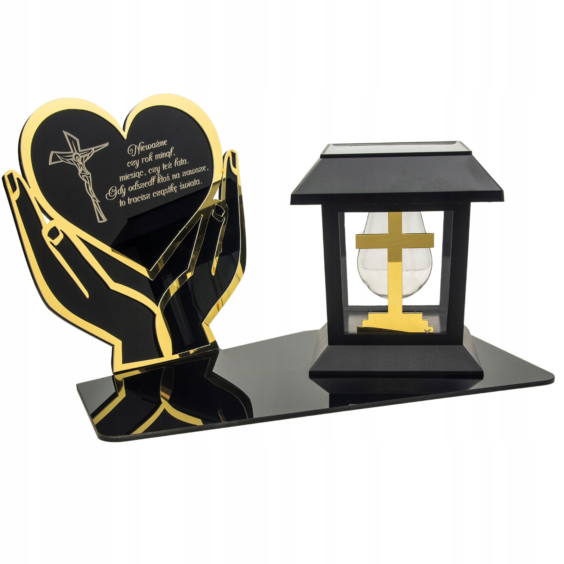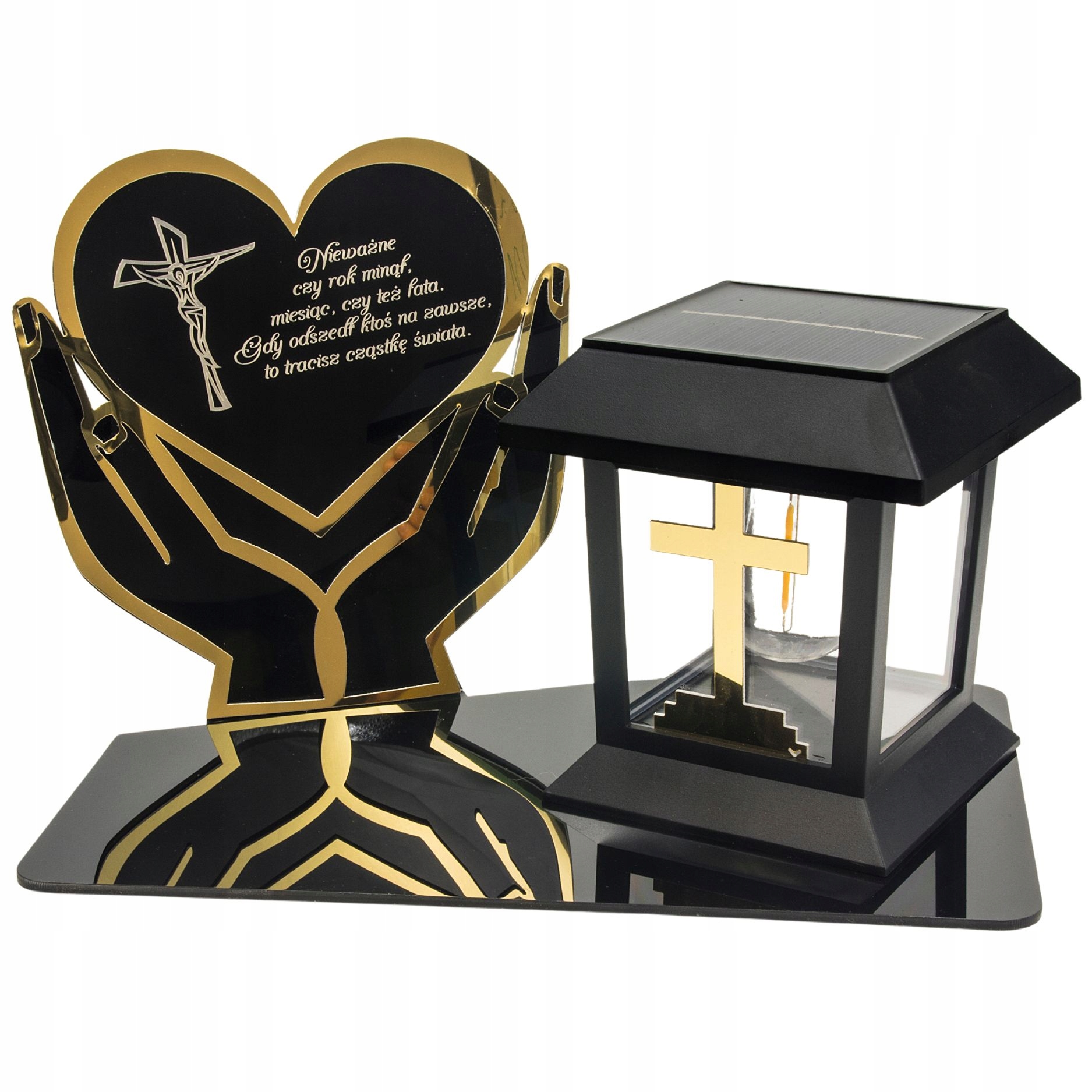 Eternal solar candle for a grave with an engraved acrylic glass stands decorated with the motif of golden hands with heart h2>