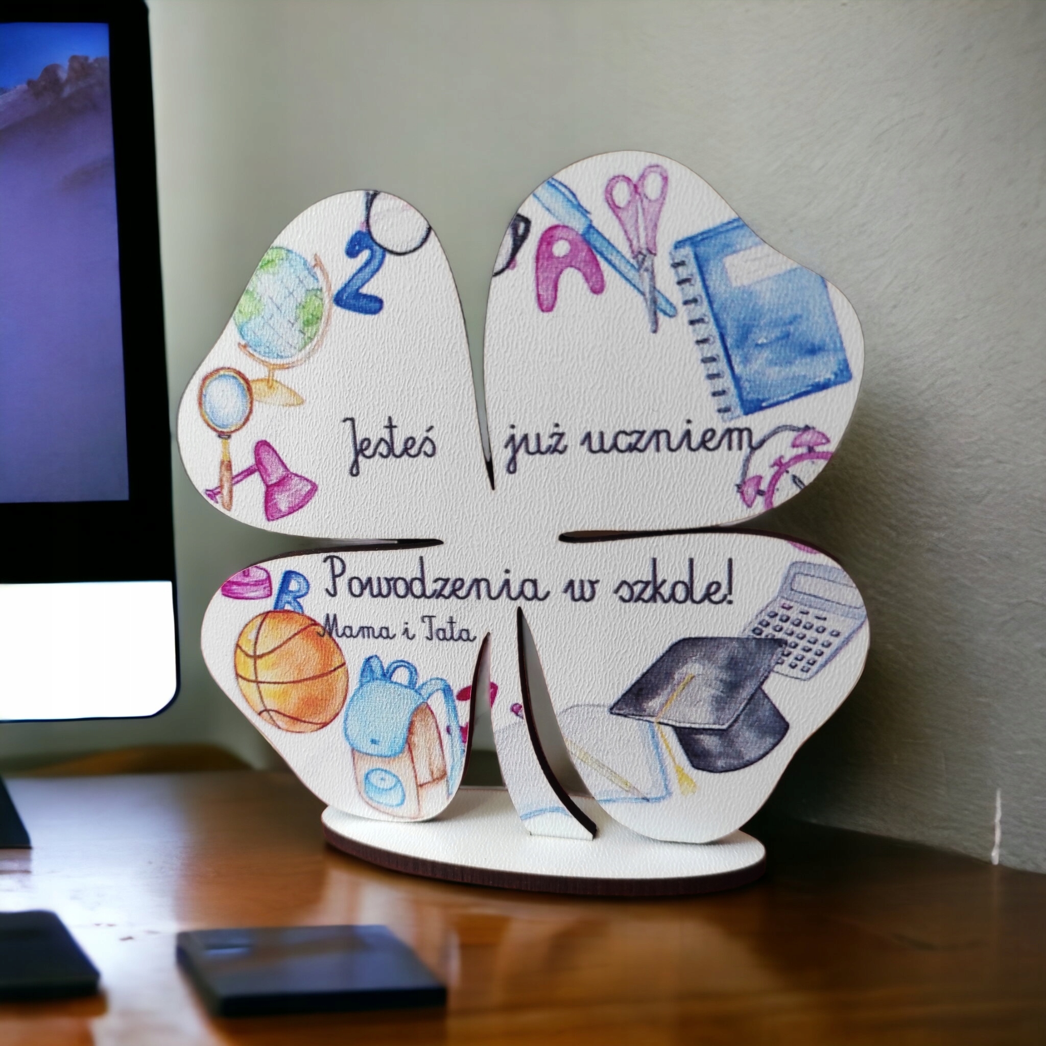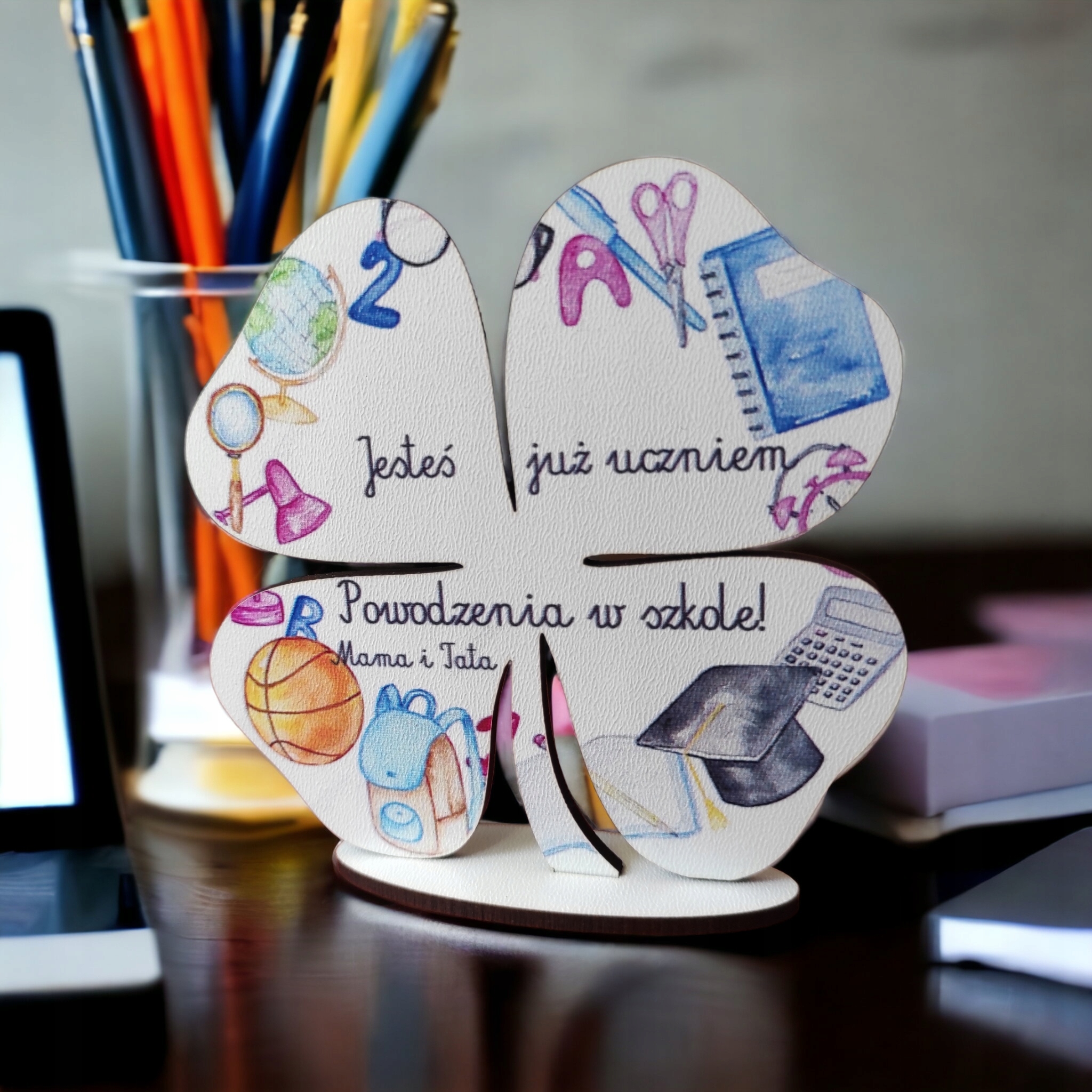 Фігурка на основі, вирізана з належною точністю. Має гарний, барвистий сувенірний принт. Ідеальний подарунок для студента, який починає свою пригоду з навчання. Це буде чудовий подарунок на випускний студенту. Форма конюшини робить його амулетом удачі. Буде чудовою прикрасою і буде сувеніром на довгі роки.