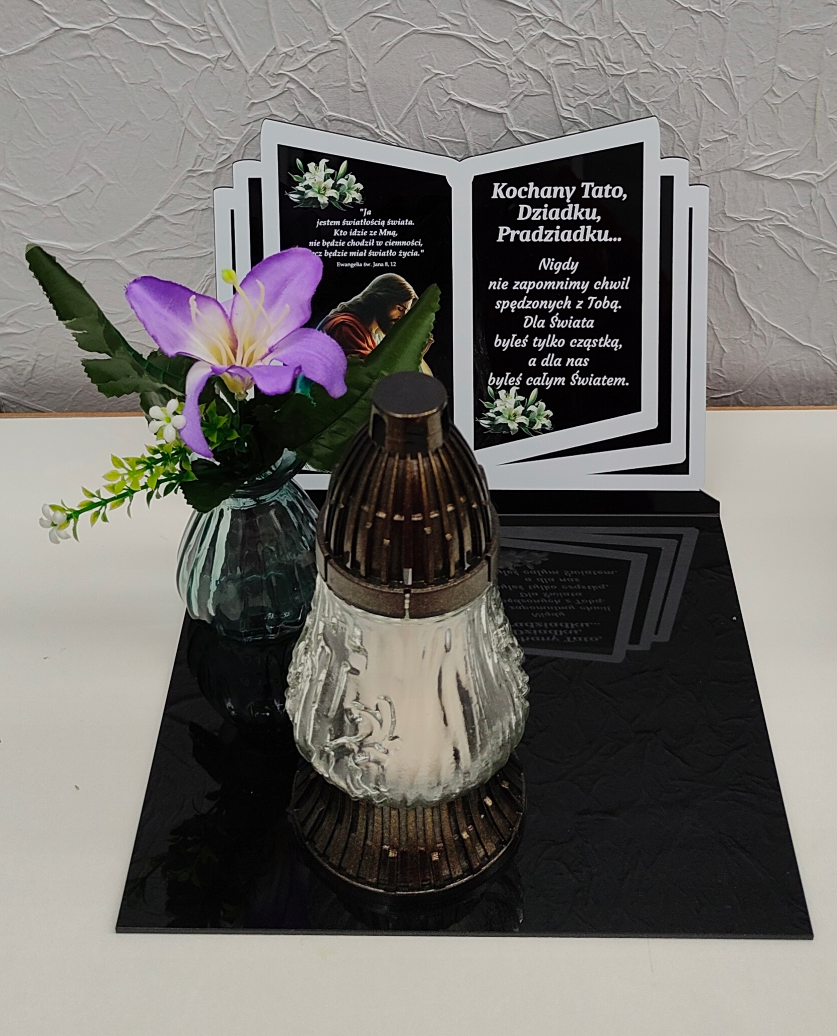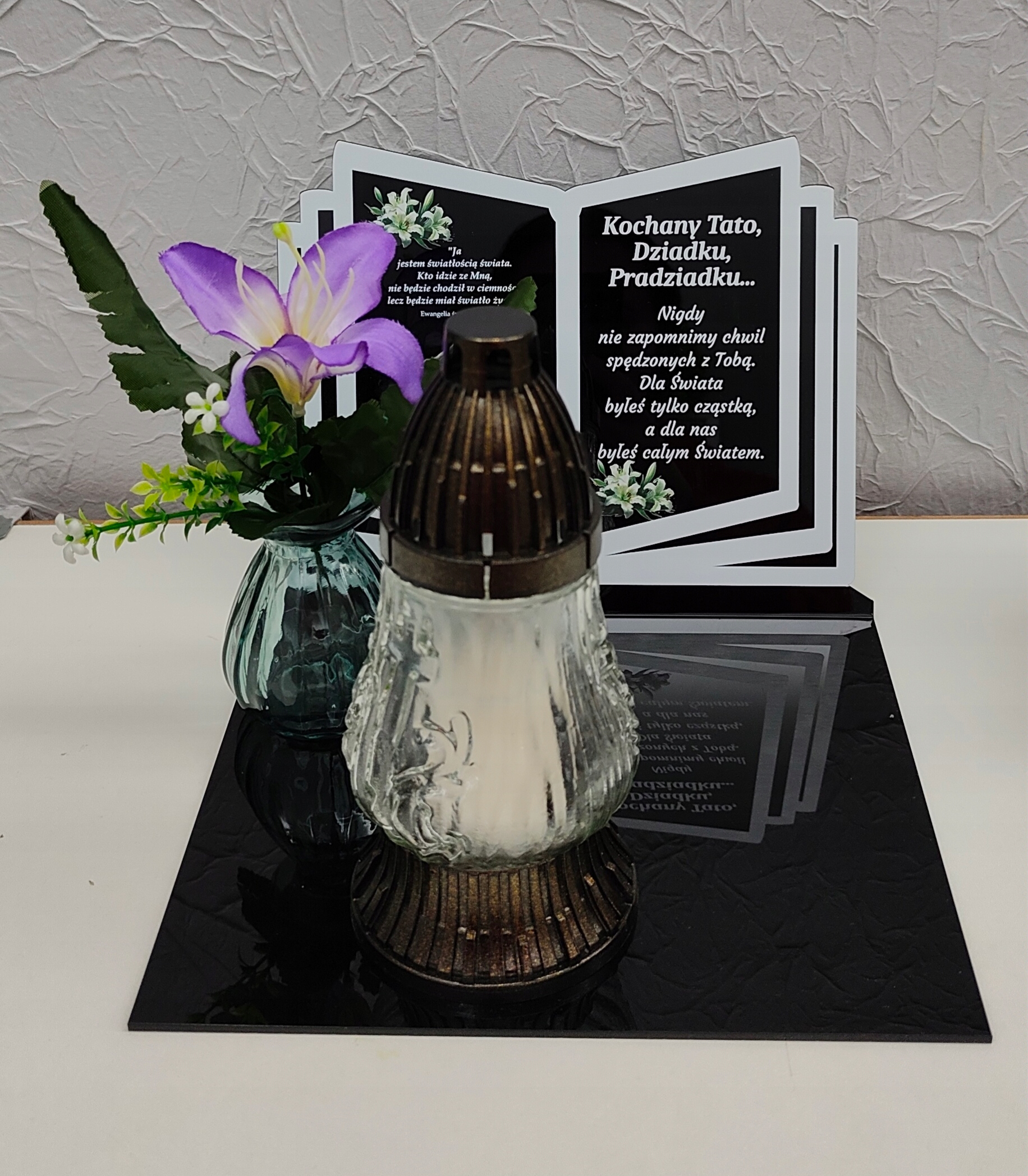Могильна прикраса у вигляді відкритої книги, на якій ми надрукуємо фотографію вашого коханого / фігуру Ісуса / Марії та ваша відданість.