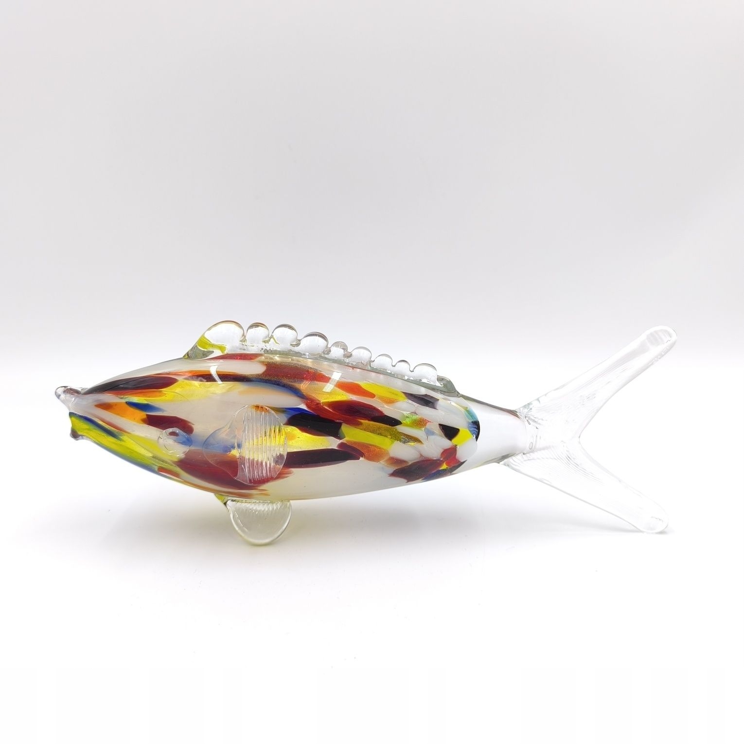Декоративна фігурка у формі риби з художнього скла. Поверхня прикрашена різнокольоровими плямами, які надають всьому виробу неповторний характер і красиво підкреслюють майстерність ручної роботи. Прозорі елементи, такі як хвіст або плавники, додають легкості та елегантності, а яскраві кольори створюють ефектну гру світла. Це унікальна річ, яка відмінно підійде як прикраса будь-якого інтер'єру.