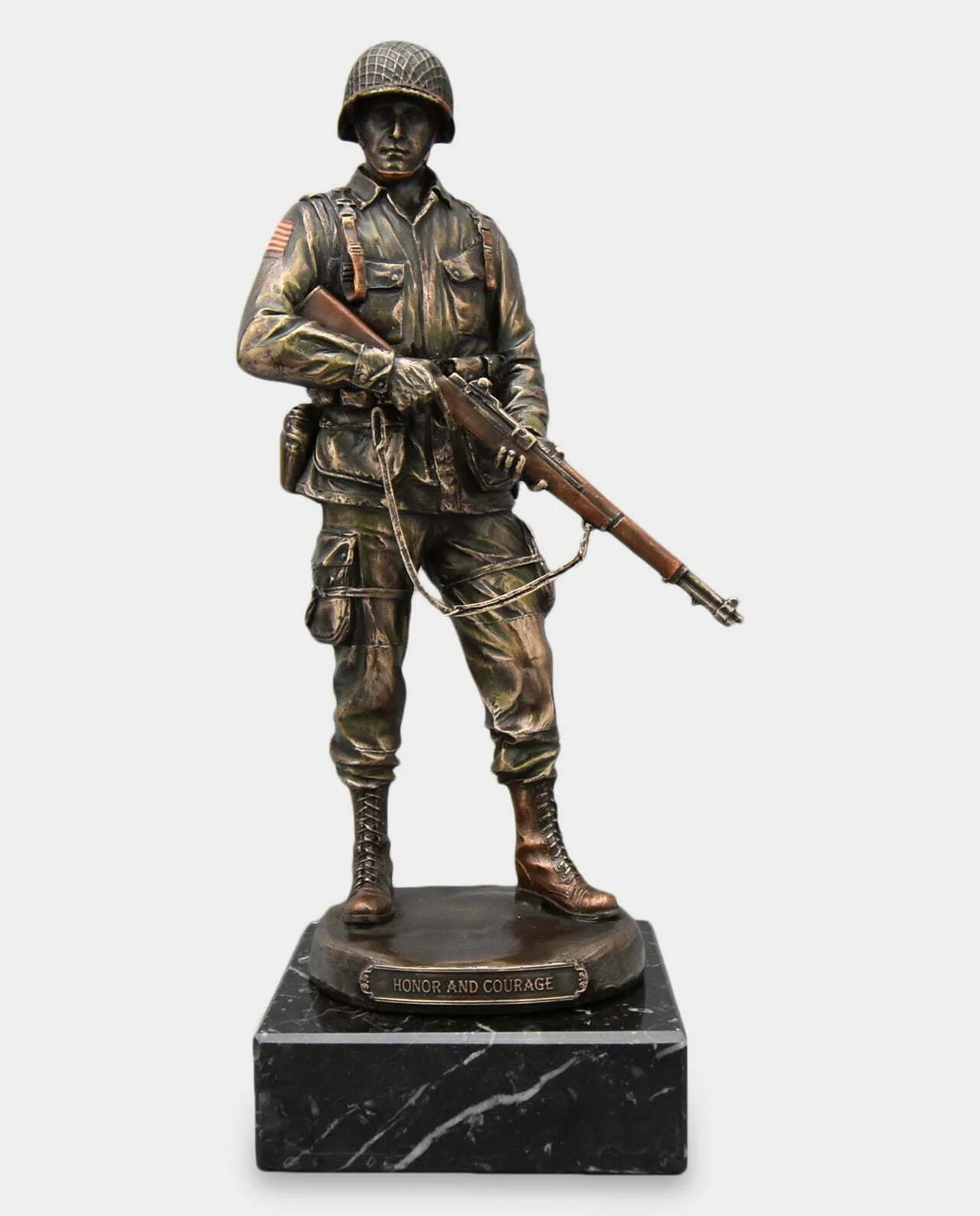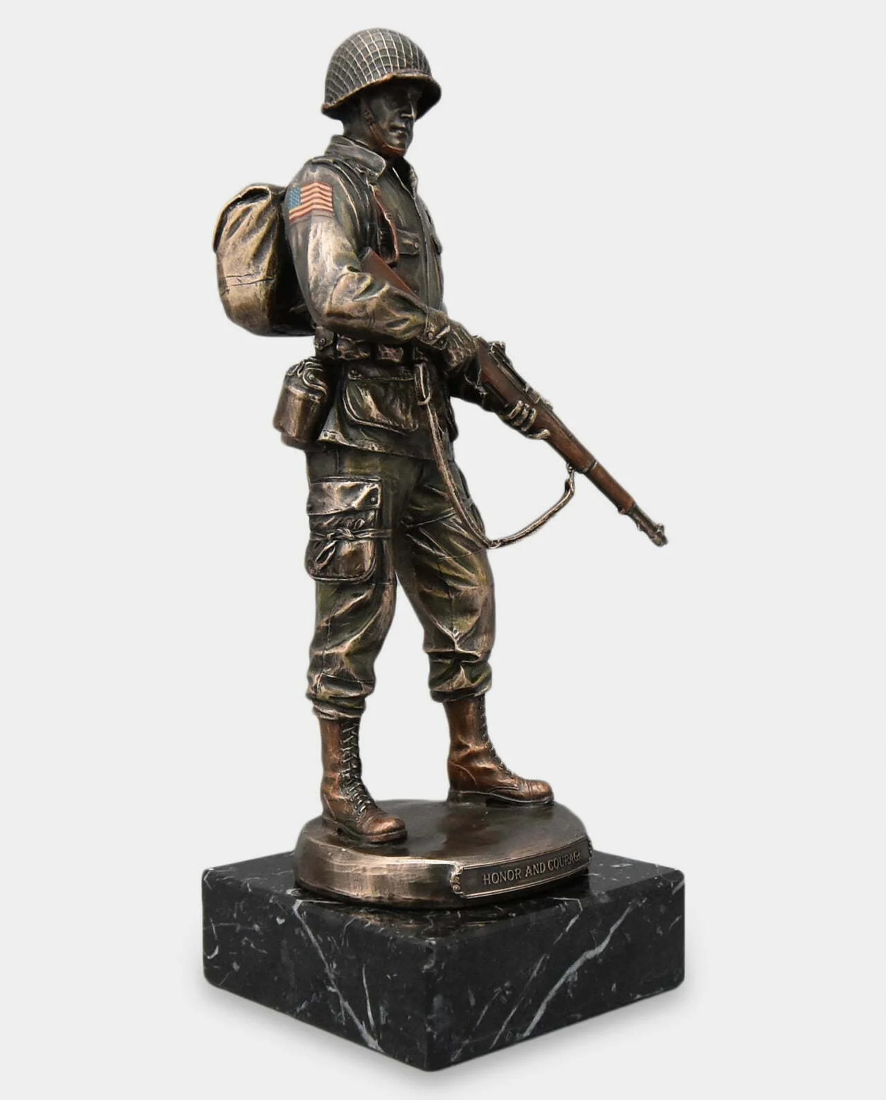 реалістична скульптура із зображенням солдата в бойовому обладнанні. Скульптура, встановлена на основі чорного мармуру з гравірованою табличкою з вашою відданістю. Він створює ідеальну ідею подарунка для військової. Ви можете поставити текст із побажаннями з нагоди просування, дякую за службу чи іншу відданість, також логотип військової одиниці. Статуетка зробила дуже точно, з увагою до найменших деталей. Це справляє чудове естетичне враження і має позачасовий стиль.