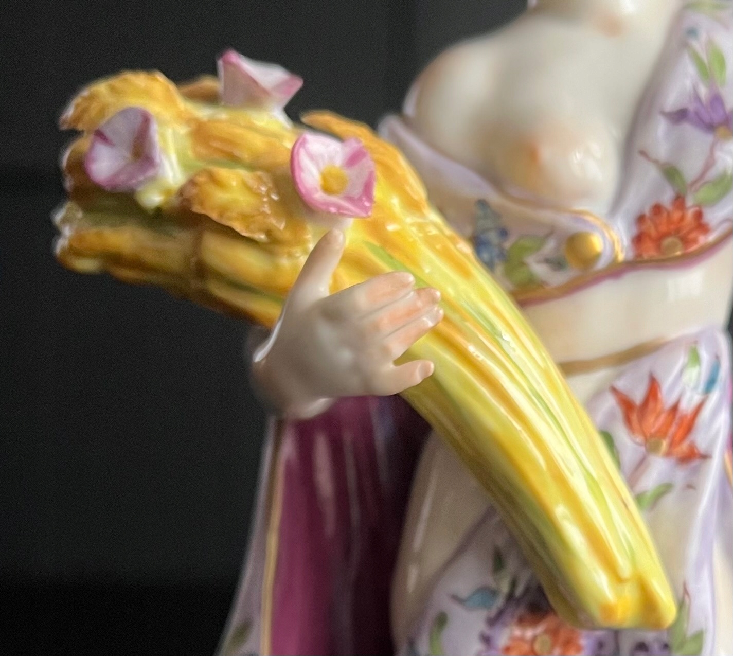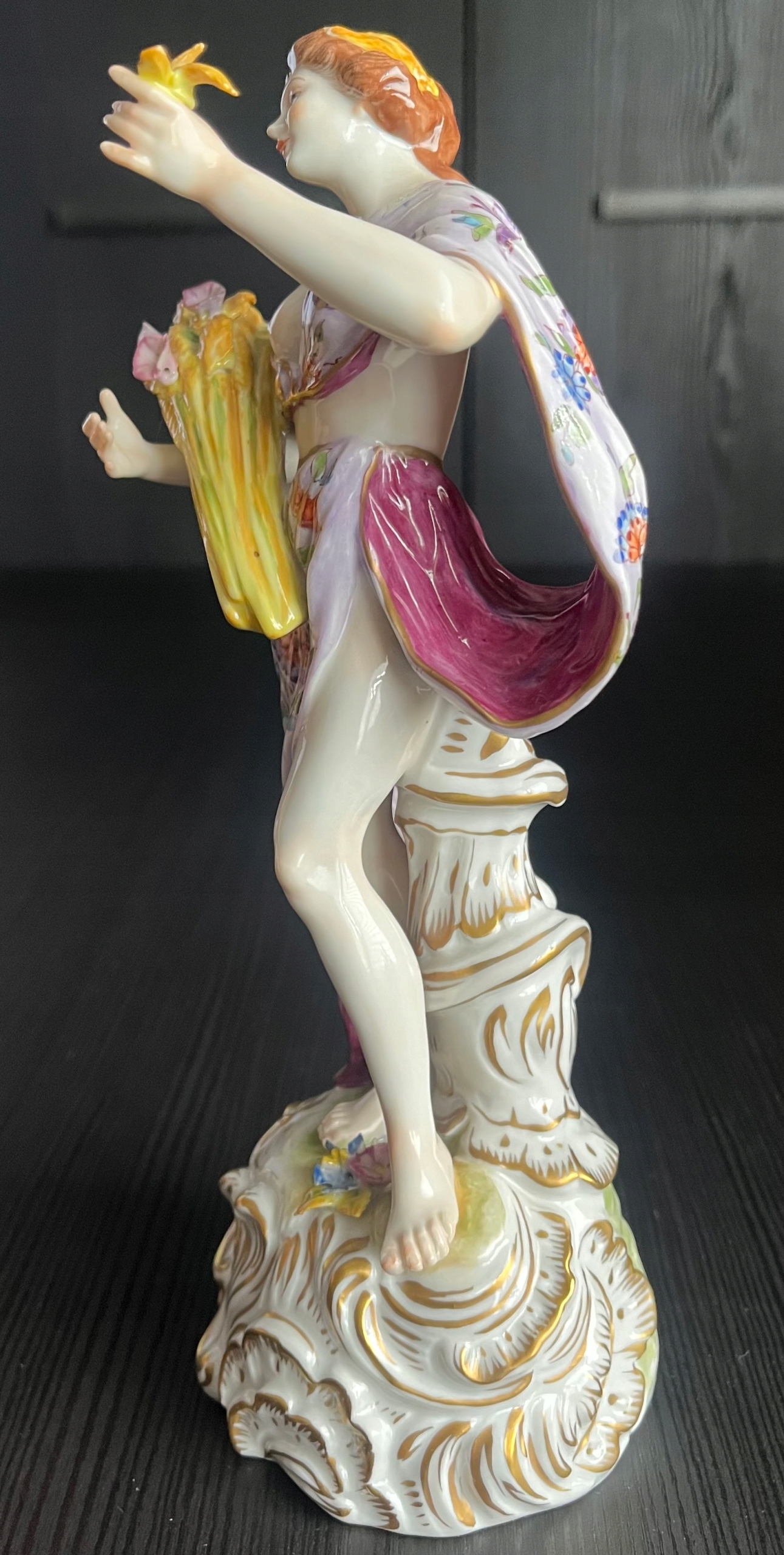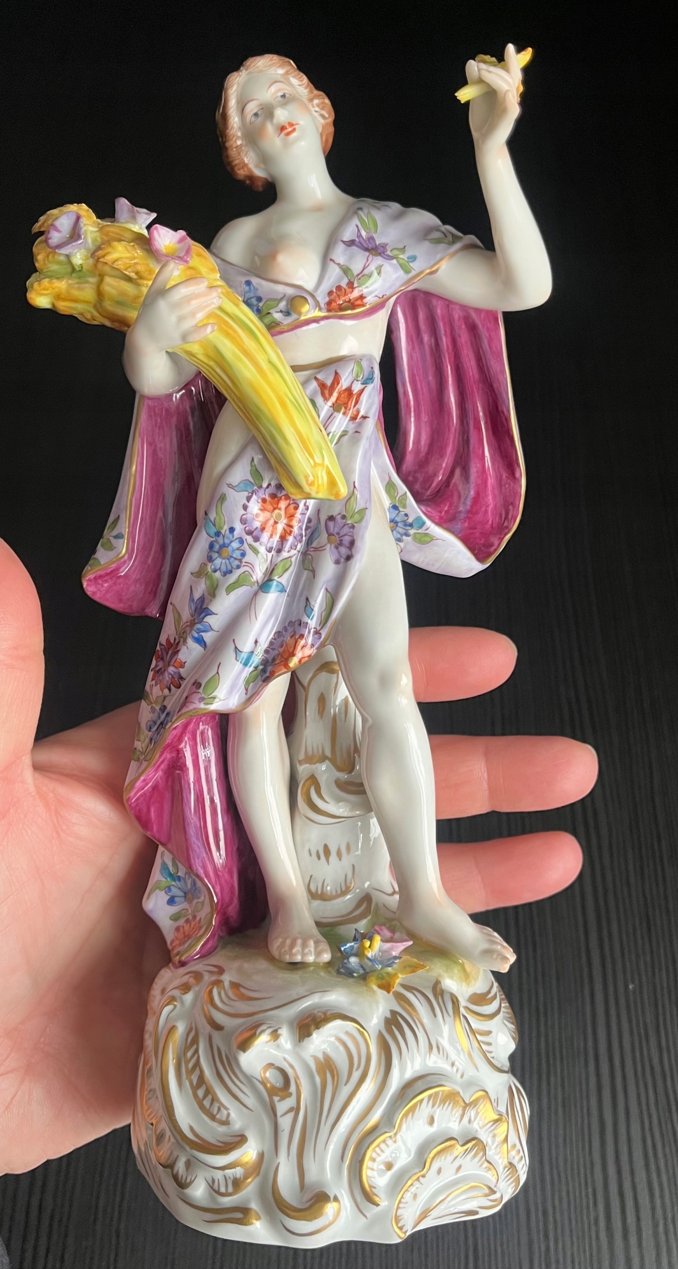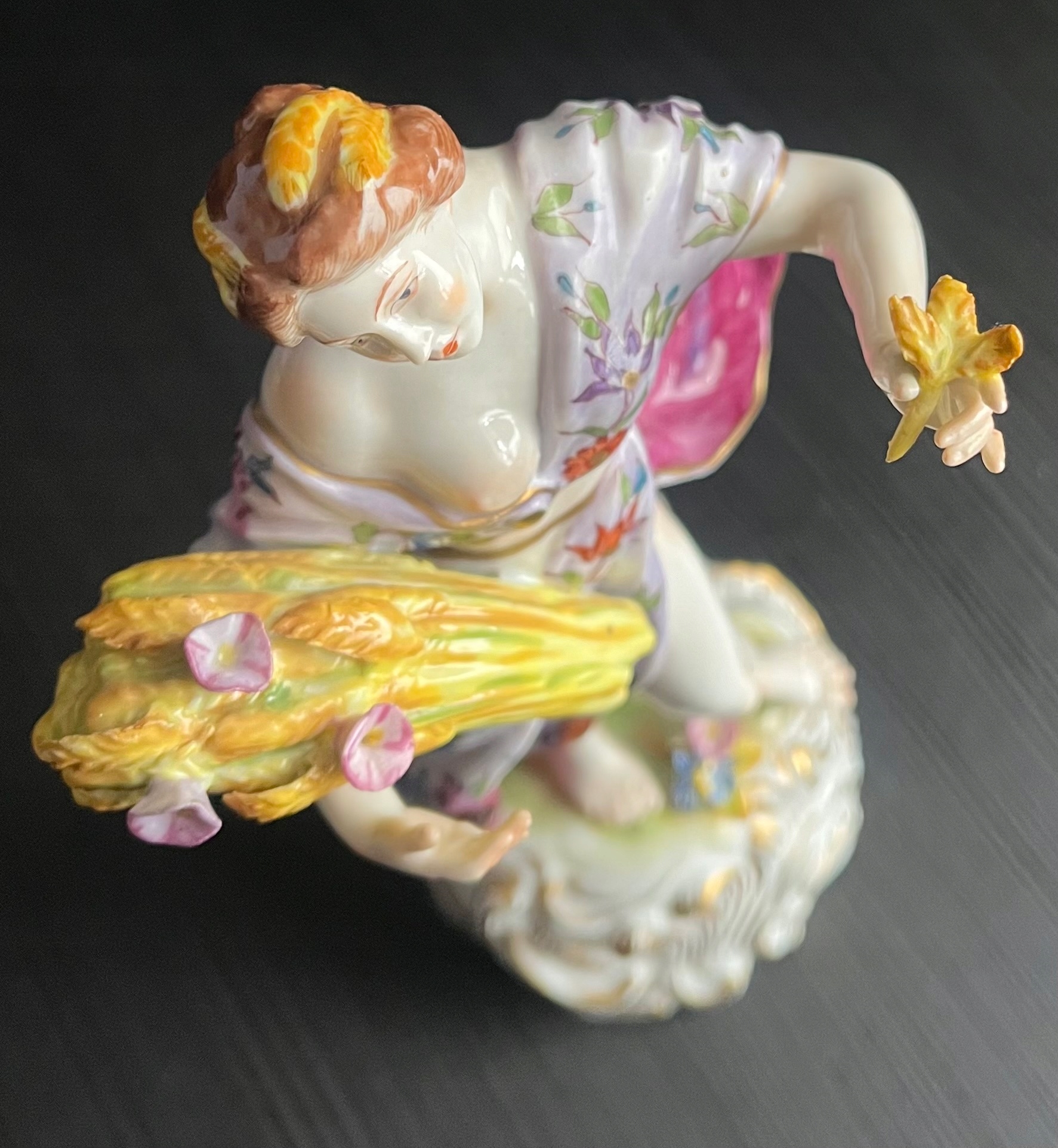 Красива порцелянова статуетка із зображенням жінки з оберемком зерна, з якого визирає рожевий кукіль. Фігурка чудово розписана з великою увагою до деталей, позолота в ідеальному стані! За формою і фасоном нагадує знамениті майсенські статуетки. Розміри на фото. Пальці та нігті цілі, без подряпин, тріщин та інших дефектів. Фігурка виготовлена в 1940-х роках.